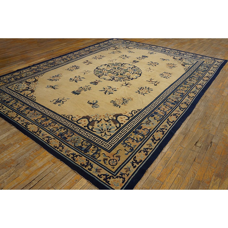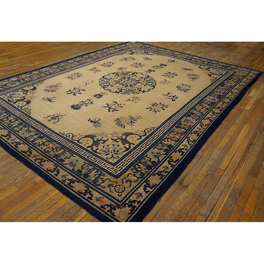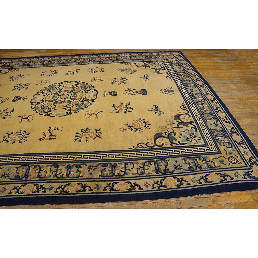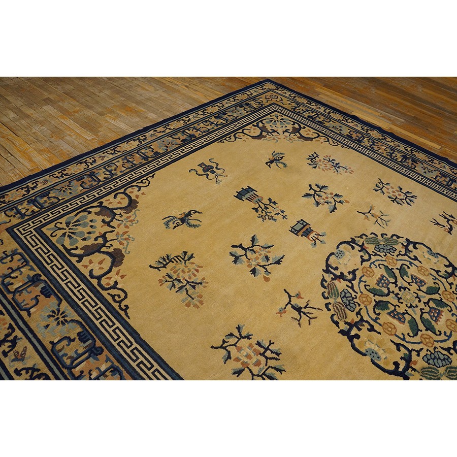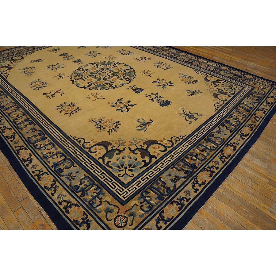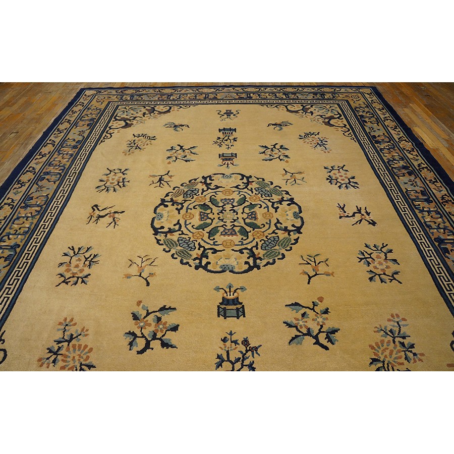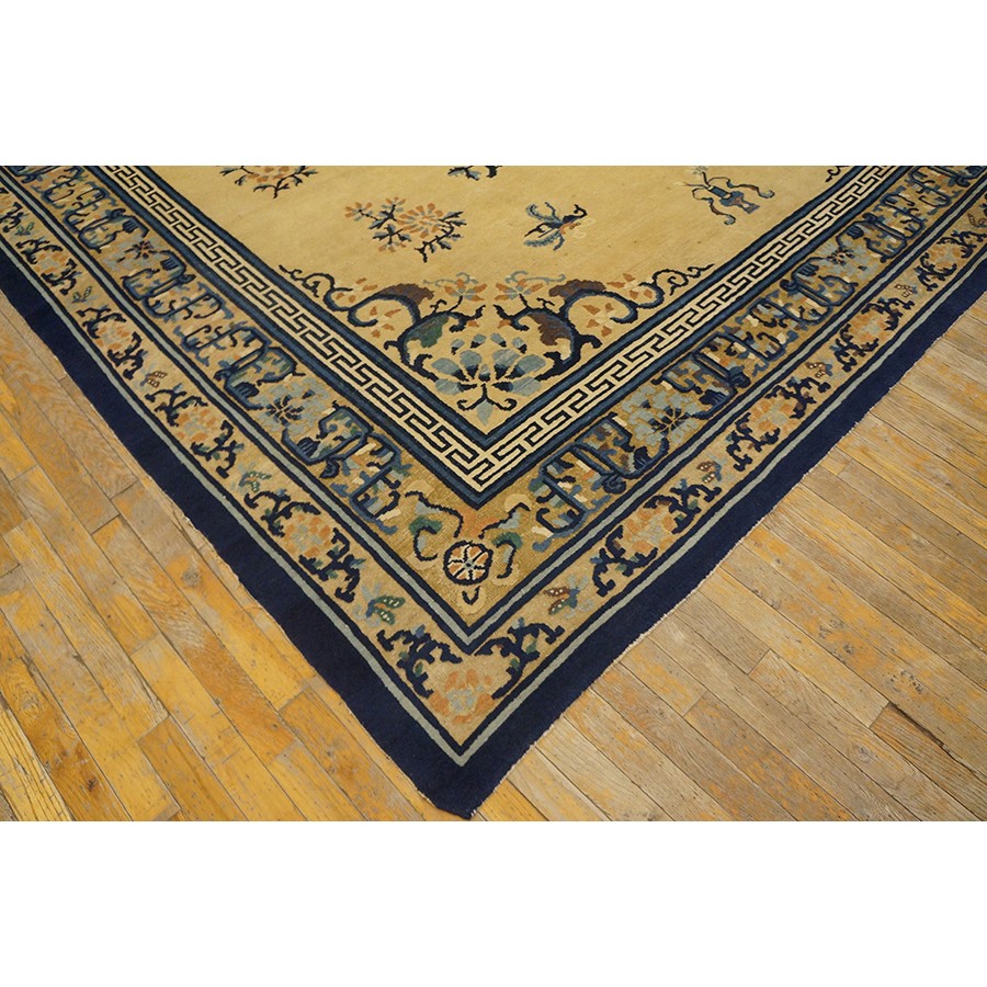 DescriptionChineseCarpets made in China proper. See entries Ningshia, Peking, Art Deco. Chinese - PekingThe commercial Peking carpet is a later 19th century development, begun by importing weaves from Ningshia (see entry) to create and export industry aimed at Western markets. The foundation is cotton and the pile is a good quality carpet wool which takes dyes particularly well. The neat medium weave is in Persian (asymmetric) knots. Designs are strictly Chinese and the whole motif repertoire of Chinese art is employed. Blue and white is the most popular color combination and red is particularly rare. Sizes tend to 9 x 12 and larger, and few small pieces appear. For a short time in the early 1920s Persian designs were woven to capitalize on the death of new Iranian goods. The industry decimated by the Communist Revolution relocated to the Pearl River area. There is a good supply of antique carpets at reasonable prices. | |