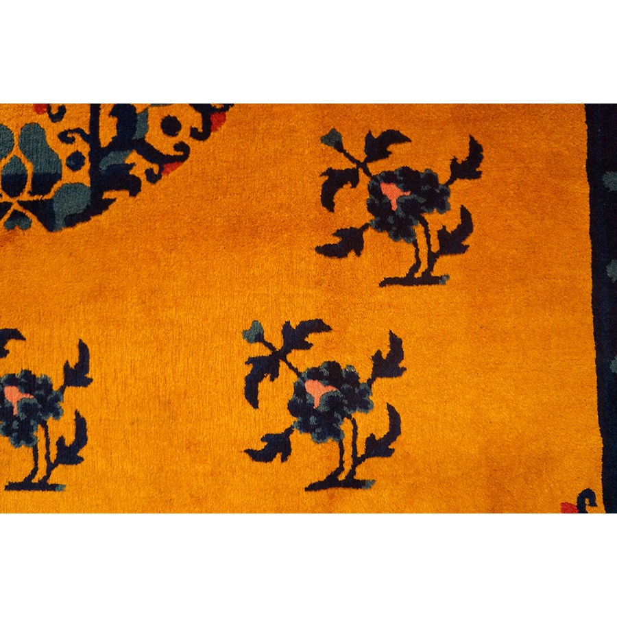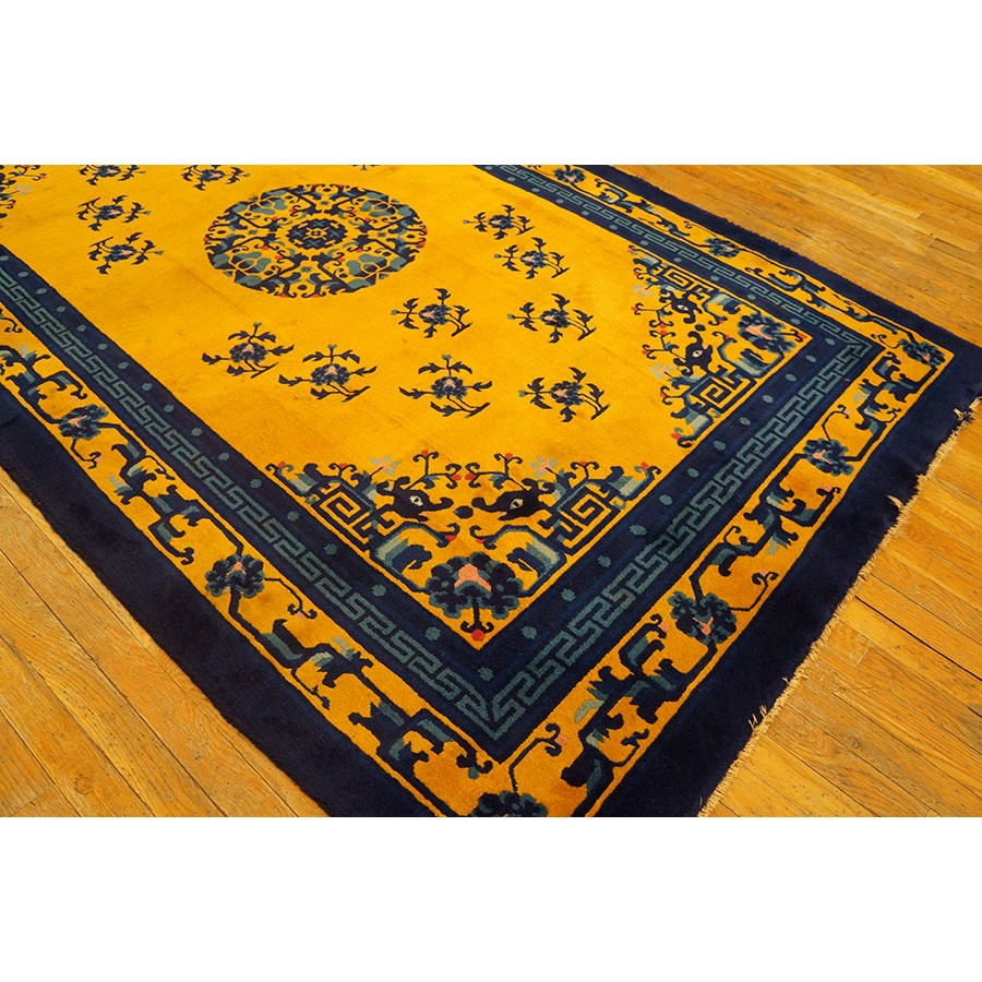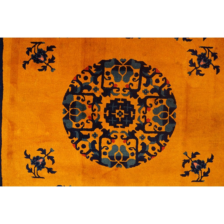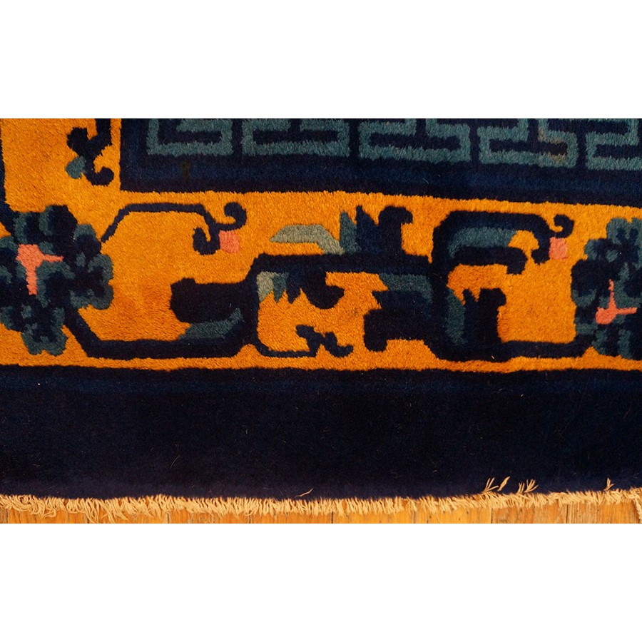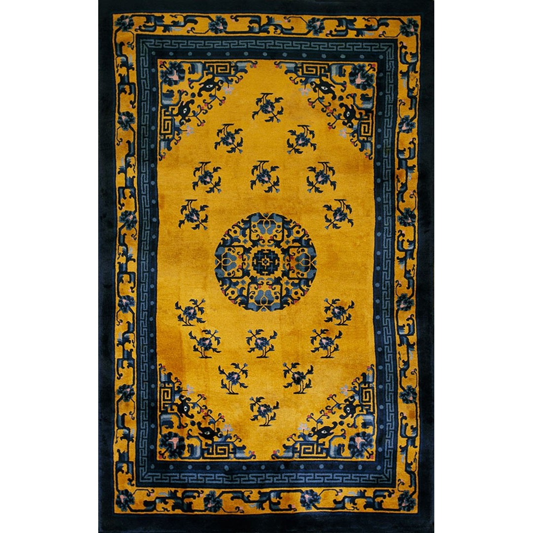 DescriptionChineseCarpets made in China proper. See entries Ningshia, Peking, Art Deco. Chinese - PekingThe commercial Peking carpet is a later 19th century development, begun by importing weaves from Ningshia (see entry) to create and export industry aimed at Western markets. The foundation is cotton and the pile is a good quality carpet wool which takes dyes particularly well. The neat medium weave is in Persian (asymmetric) knots. Designs are strictly Chinese and the whole motif repertoire of Chinese art is employed. Blue and white is the most popular color combination and red is particularly rare. Sizes tend to 9 x 12 and larger, and few small pieces appear. For a short time in the early 1920s Persian designs were woven to capitalize on the death of new Iranian goods. The industry decimated by the Communist Revolution relocated to the Pearl River area. There is a good supply of antique carpets at reasonable prices. | |
