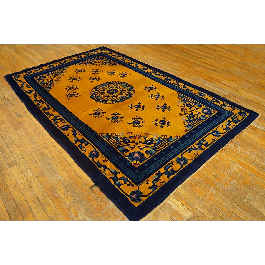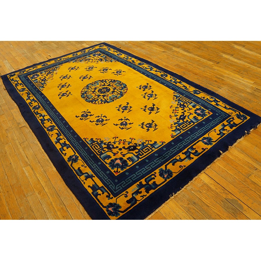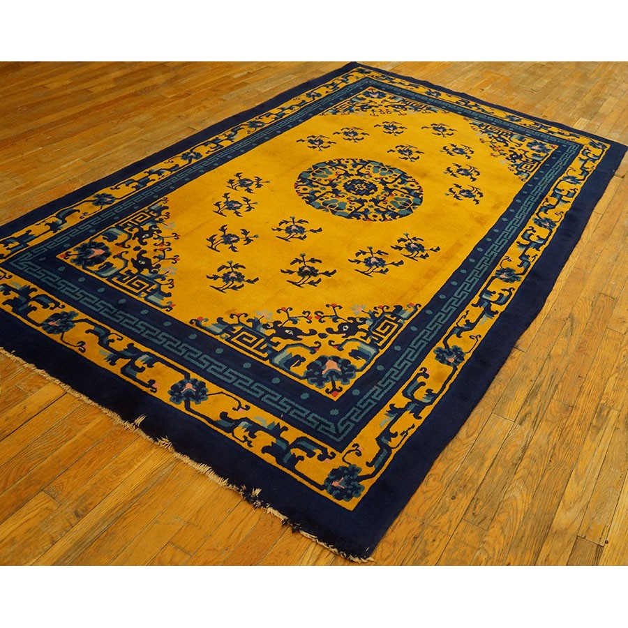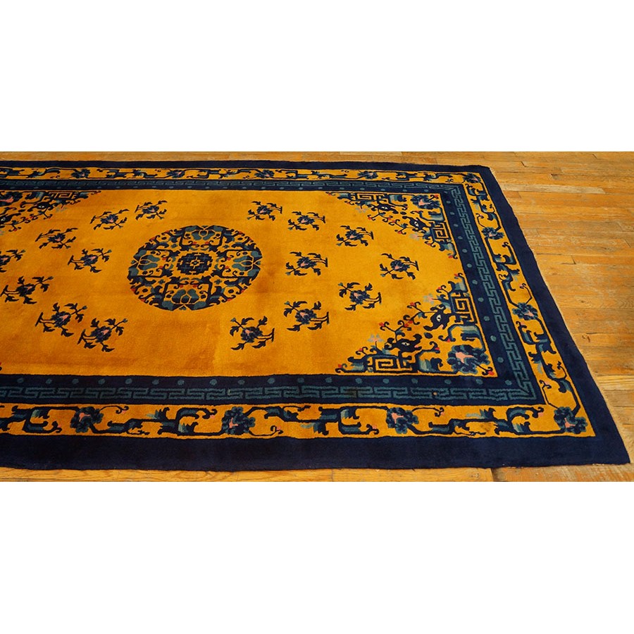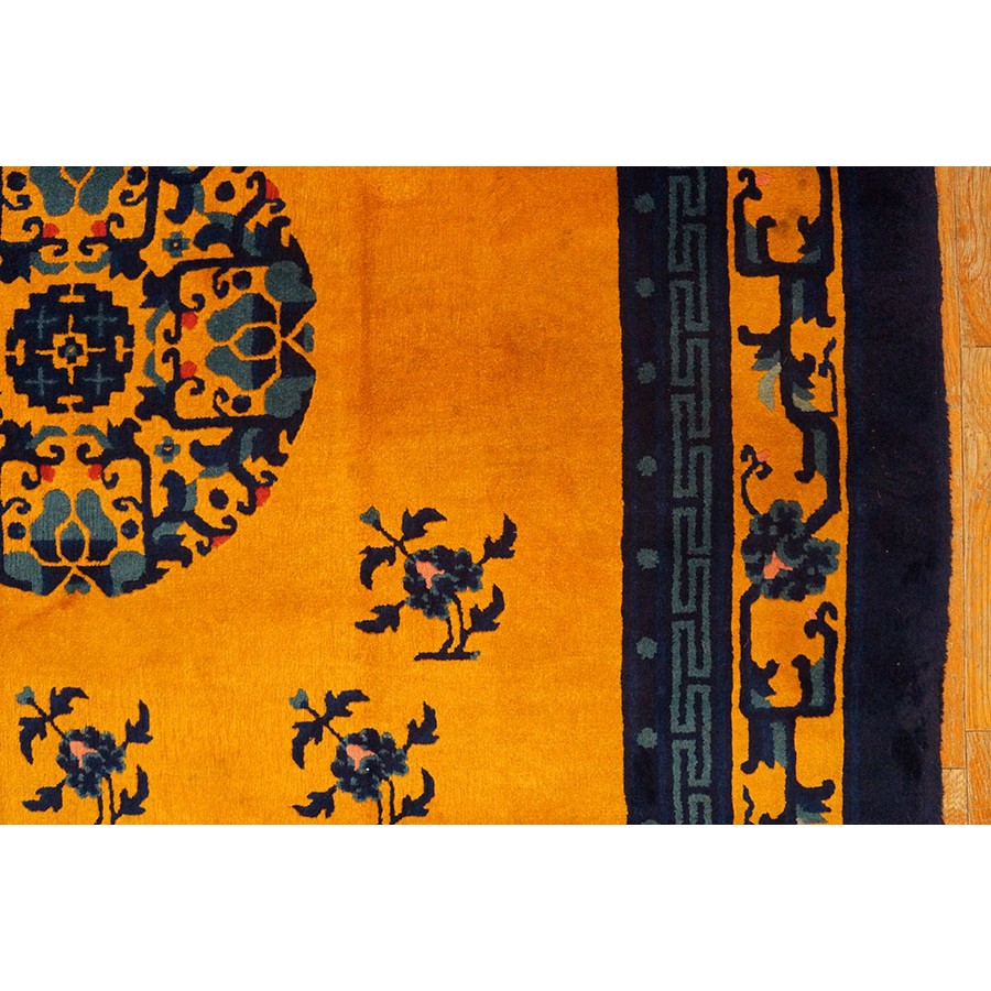 DescriptionChineseCarpets made in China proper. See entries Ningshia, Peking, Art Deco. Chinese - PekingThe commercial Peking carpet is a later 19th century development, begun by importing weaves from Ningshia (see entry) to create and export industry aimed at Western markets. The foundation is cotton and the pile is a good quality carpet wool which takes dyes particularly well. The neat medium weave is in Persian (asymmetric) knots. Designs are strictly Chinese and the whole motif repertoire of Chinese art is employed. Blue and white is the most popular color combination and red is particularly rare. Sizes tend to 9 x 12 and larger, and few small pieces appear. For a short time in the early 1920s Persian designs were woven to capitalize on the death of new Iranian goods. The industry decimated by the Communist Revolution relocated to the Pearl River area. There is a good supply of antique carpets at reasonable prices. | |