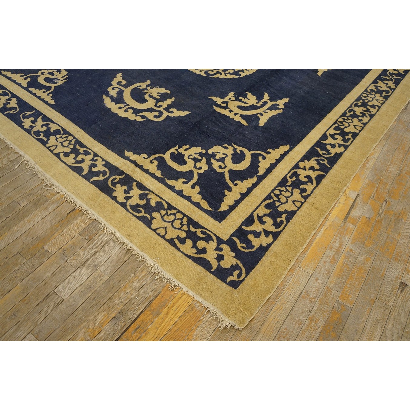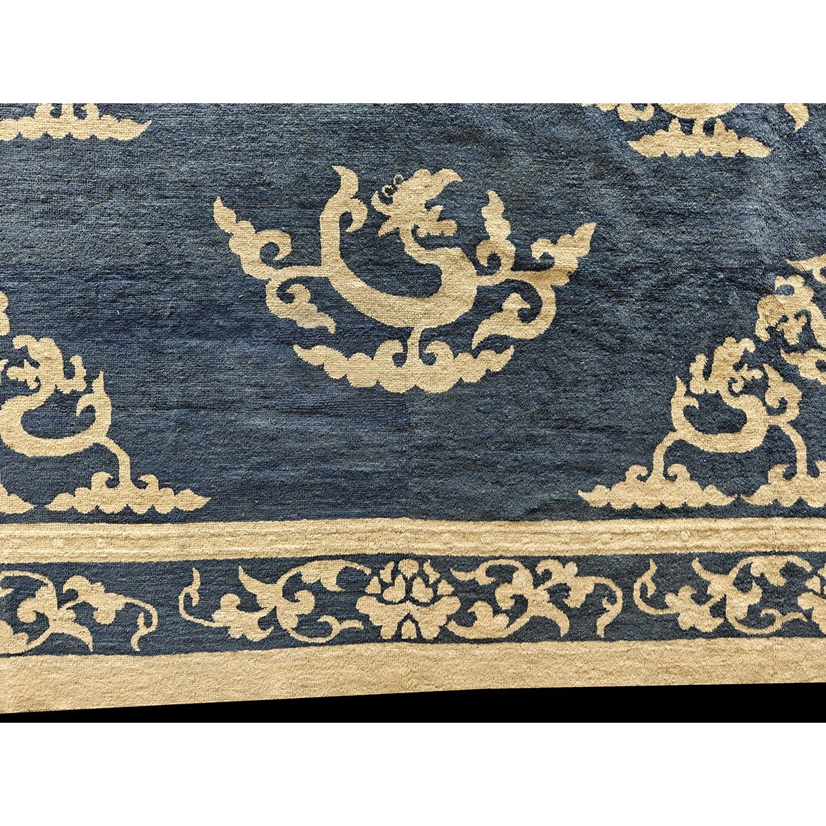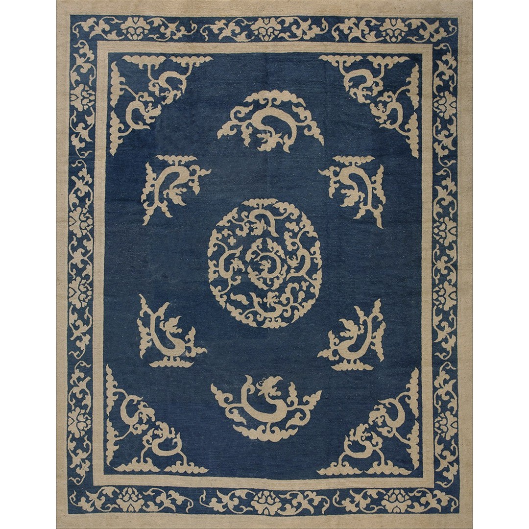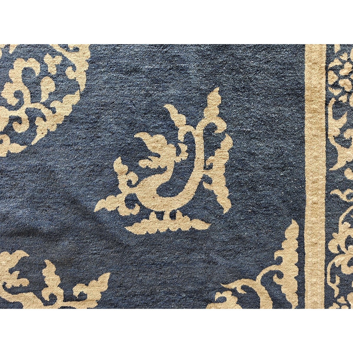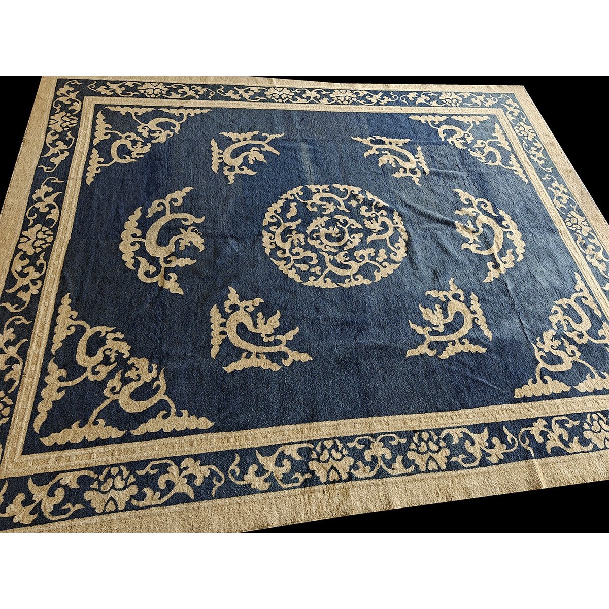 DescriptionChineseCarpets made in China proper. See entries Ningshia, Peking, Art Deco. Chinese - PekingThe commercial Peking carpet is a later 19th century development, begun by importing weaves from Ningshia (see entry) to create and export industry aimed at Western markets. The foundation is cotton and the pile is a good quality carpet wool which takes dyes particularly well. The neat medium weave is in Persian (asymmetric) knots. Designs are strictly Chinese and the whole motif repertoire of Chinese art is employed. Blue and white is the most popular color combination and red is particularly rare. Sizes tend to 9 x 12 and larger, and few small pieces appear. For a short time in the early 1920s Persian designs were woven to capitalize on the death of new Iranian goods. The industry decimated by the Communist Revolution relocated to the Pearl River area. There is a good supply of antique carpets at reasonable prices. | |