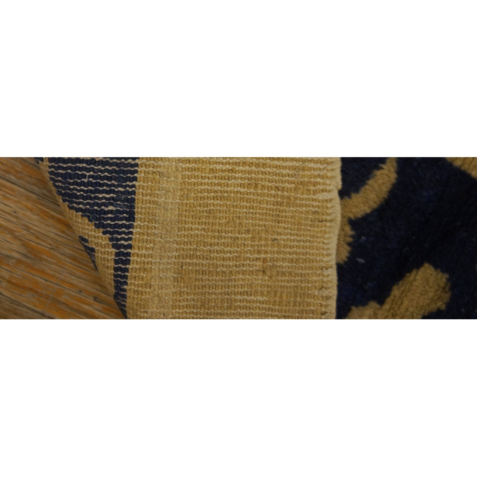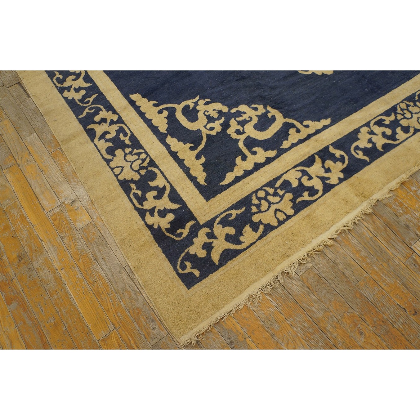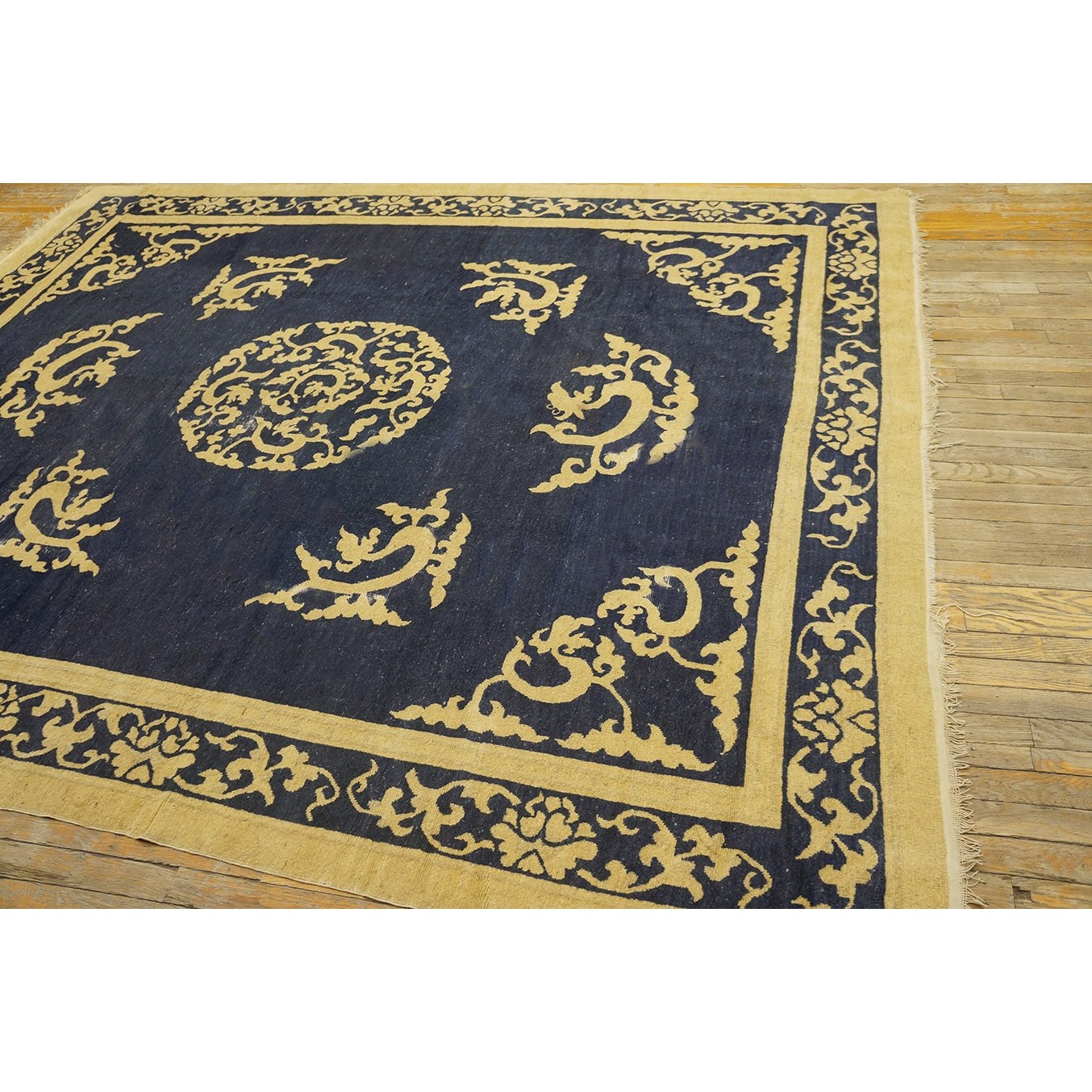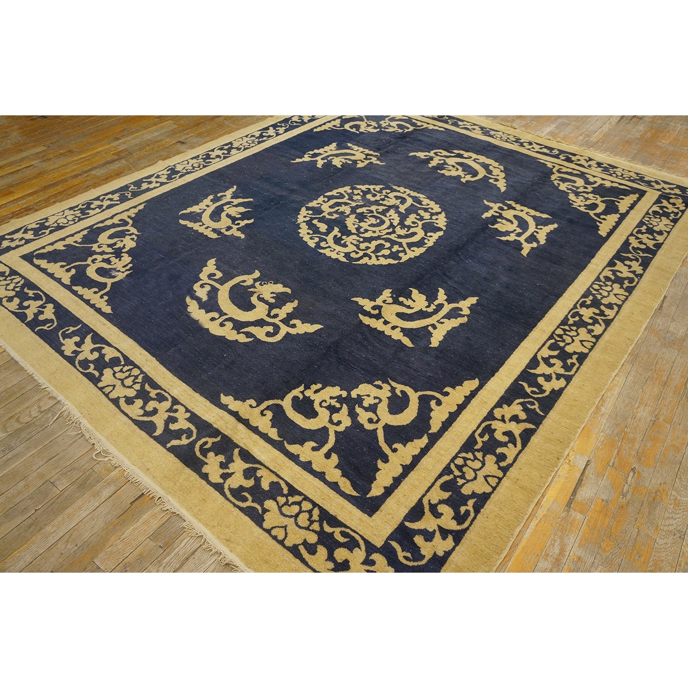 DescriptionChineseCarpets made in China proper. See entries Ningshia, Peking, Art Deco. Chinese - PekingThe commercial Peking carpet is a later 19th century development, begun by importing weaves from Ningshia (see entry) to create and export industry aimed at Western markets. The foundation is cotton and the pile is a good quality carpet wool which takes dyes particularly well. The neat medium weave is in Persian (asymmetric) knots. Designs are strictly Chinese and the whole motif repertoire of Chinese art is employed. Blue and white is the most popular color combination and red is particularly rare. Sizes tend to 9 x 12 and larger, and few small pieces appear. For a short time in the early 1920s Persian designs were woven to capitalize on the death of new Iranian goods. The industry decimated by the Communist Revolution relocated to the Pearl River area. There is a good supply of antique carpets at reasonable prices. | |