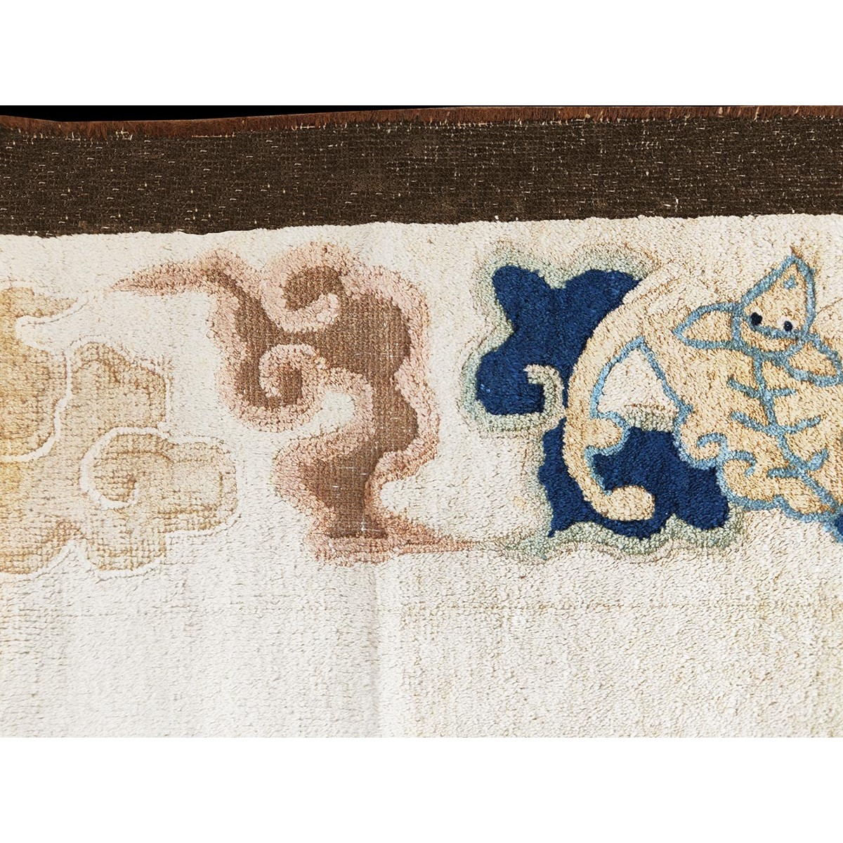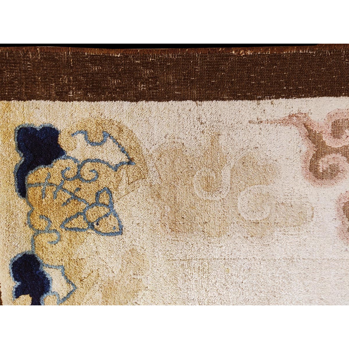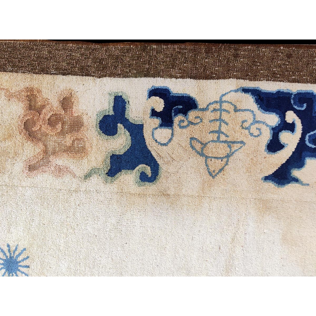 DescriptionChineseCarpets made in China proper. See entries Ningshia, Peking, Art Deco. Chinese - PekingThe commercial Peking carpet is a later 19th century development, begun by importing weaves from Ningshia (see entry) to create and export industry aimed at Western markets. The foundation is cotton and the pile is a good quality carpet wool which takes dyes particularly well. The neat medium weave is in Persian (asymmetric) knots. Designs are strictly Chinese and the whole motif repertoire of Chinese art is employed. Blue and white is the most popular color combination and red is particularly rare. Sizes tend to 9 x 12 and larger, and few small pieces appear. For a short time in the early 1920s Persian designs were woven to capitalize on the death of new Iranian goods. The industry decimated by the Communist Revolution relocated to the Pearl River area. There is a good supply of antique carpets at reasonable prices. | |