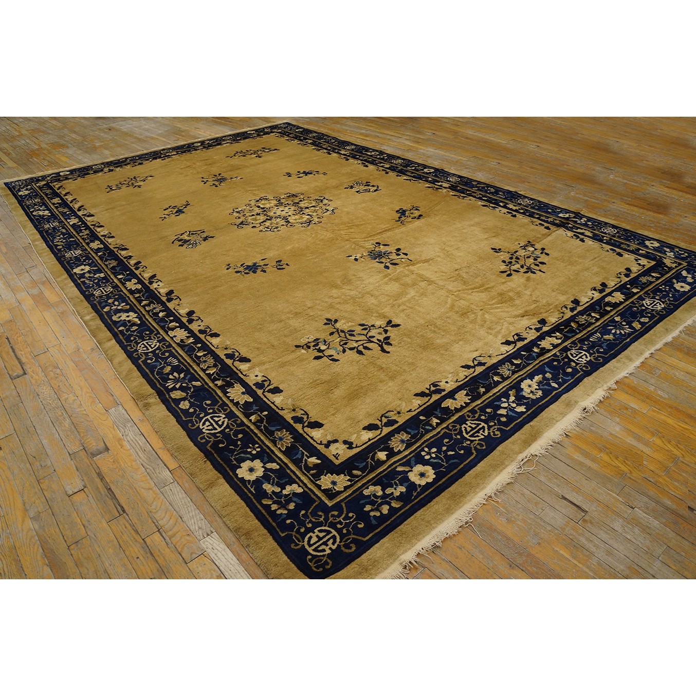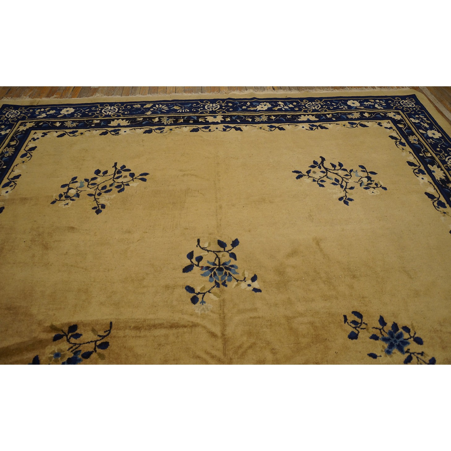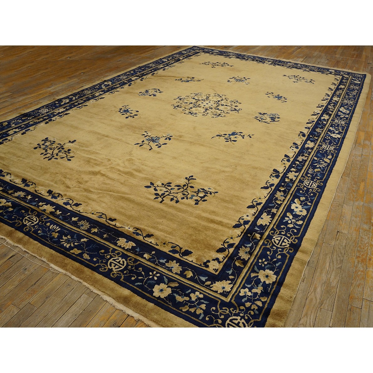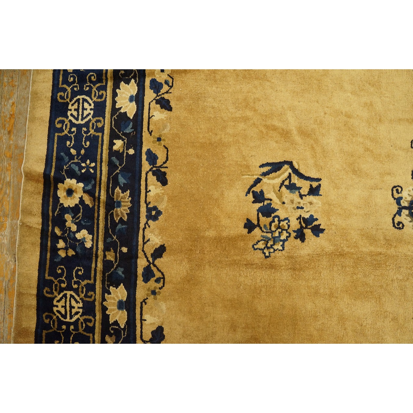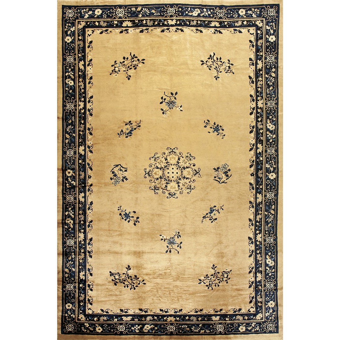 DescriptionChineseCarpets made in China proper. See entries Ningshia, Peking, Art Deco. Chinese - PekingThe commercial Peking carpet is a later 19th century development, begun by importing weaves from Ningshia (see entry) to create and export industry aimed at Western markets. The foundation is cotton and the pile is a good quality carpet wool which takes dyes particularly well. The neat medium weave is in Persian (asymmetric) knots. Designs are strictly Chinese and the whole motif repertoire of Chinese art is employed. Blue and white is the most popular color combination and red is particularly rare. Sizes tend to 9 x 12 and larger, and few small pieces appear. For a short time in the early 1920s Persian designs were woven to capitalize on the death of new Iranian goods. The industry decimated by the Communist Revolution relocated to the Pearl River area. There is a good supply of antique carpets at reasonable prices. | |