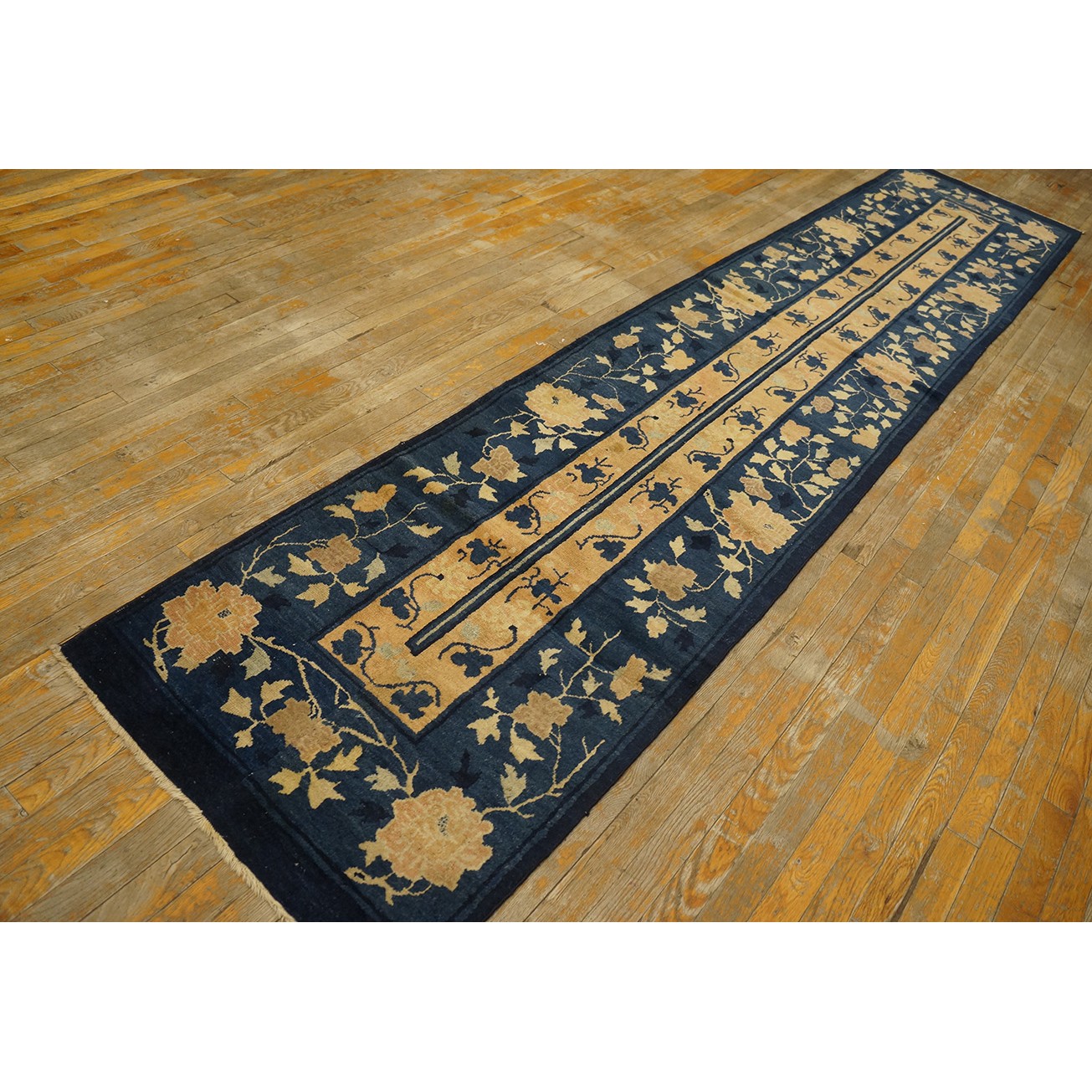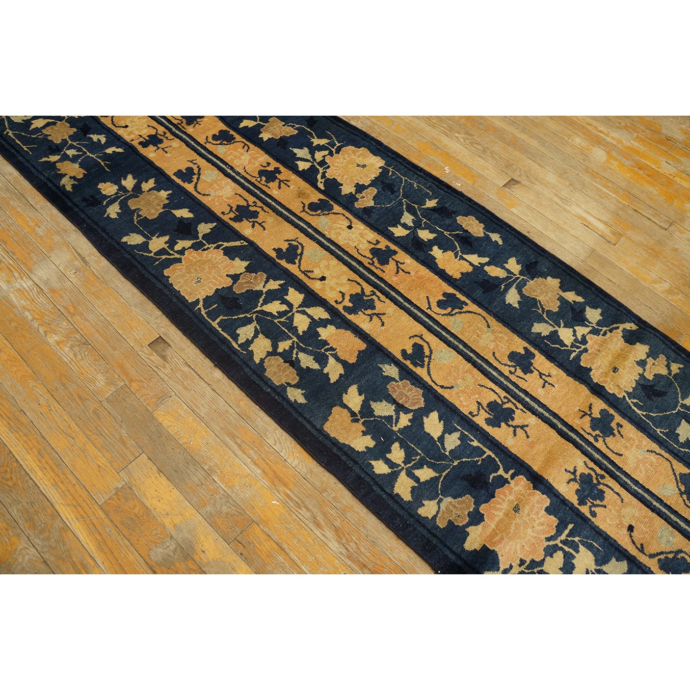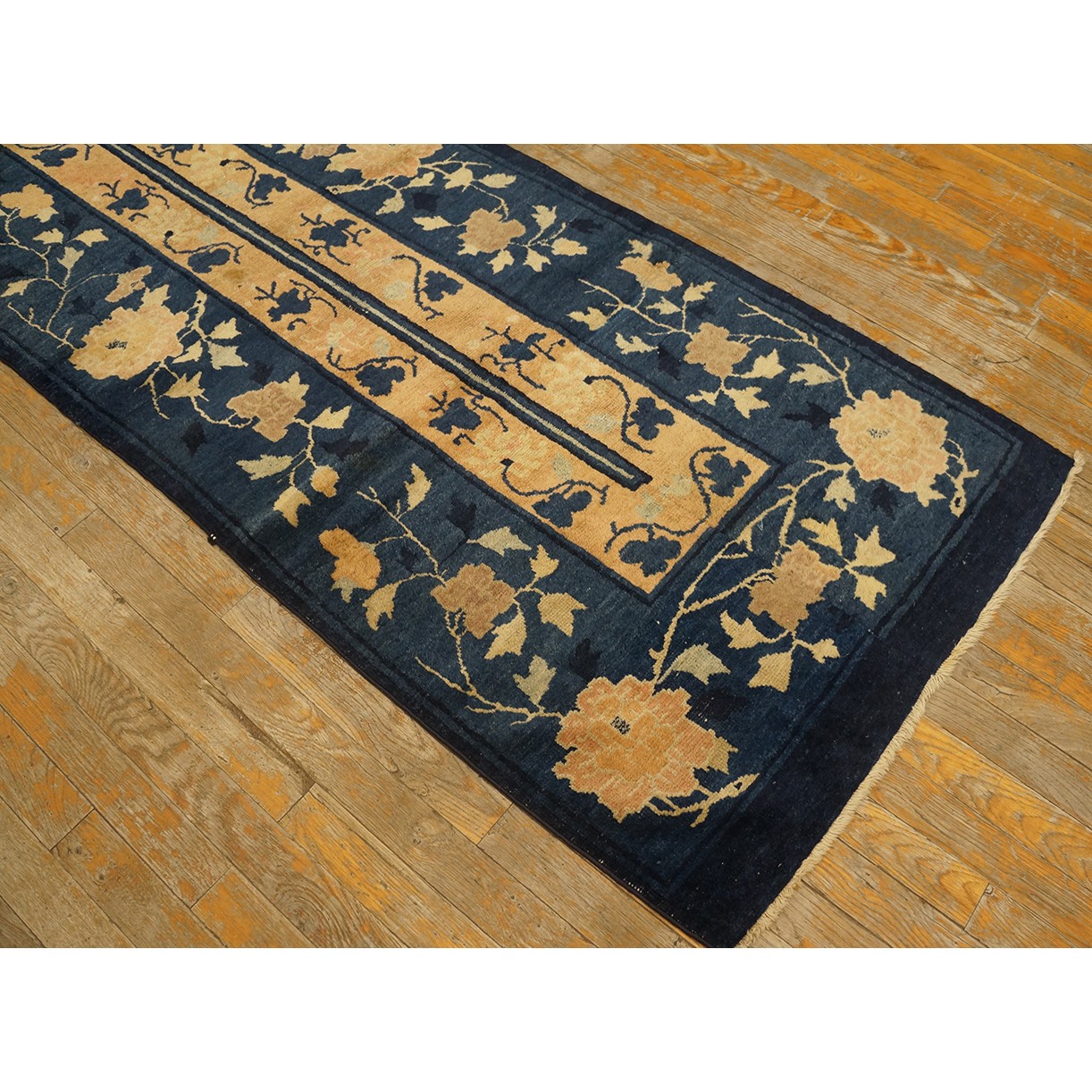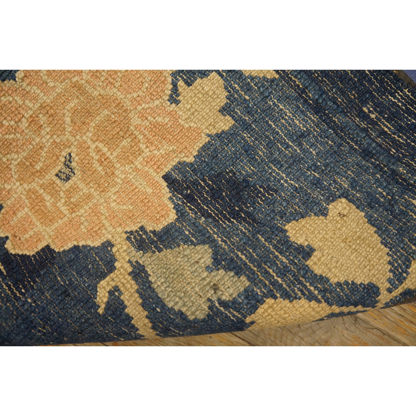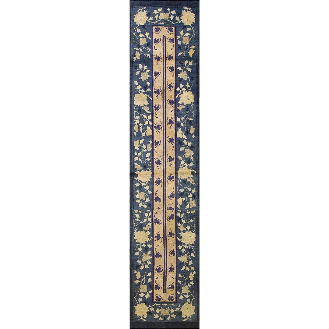 DescriptionChineseCarpets made in China proper. See entries Ningshia, Peking, Art Deco. Chinese - PekingThe commercial Peking carpet is a later 19th century development, begun by importing weaves from Ningshia (see entry) to create and export industry aimed at Western markets. The foundation is cotton and the pile is a good quality carpet wool which takes dyes particularly well. The neat medium weave is in Persian (asymmetric) knots. Designs are strictly Chinese and the whole motif repertoire of Chinese art is employed. Blue and white is the most popular color combination and red is particularly rare. Sizes tend to 9 x 12 and larger, and few small pieces appear. For a short time in the early 1920s Persian designs were woven to capitalize on the death of new Iranian goods. The industry decimated by the Communist Revolution relocated to the Pearl River area. There is a good supply of antique carpets at reasonable prices. | |
