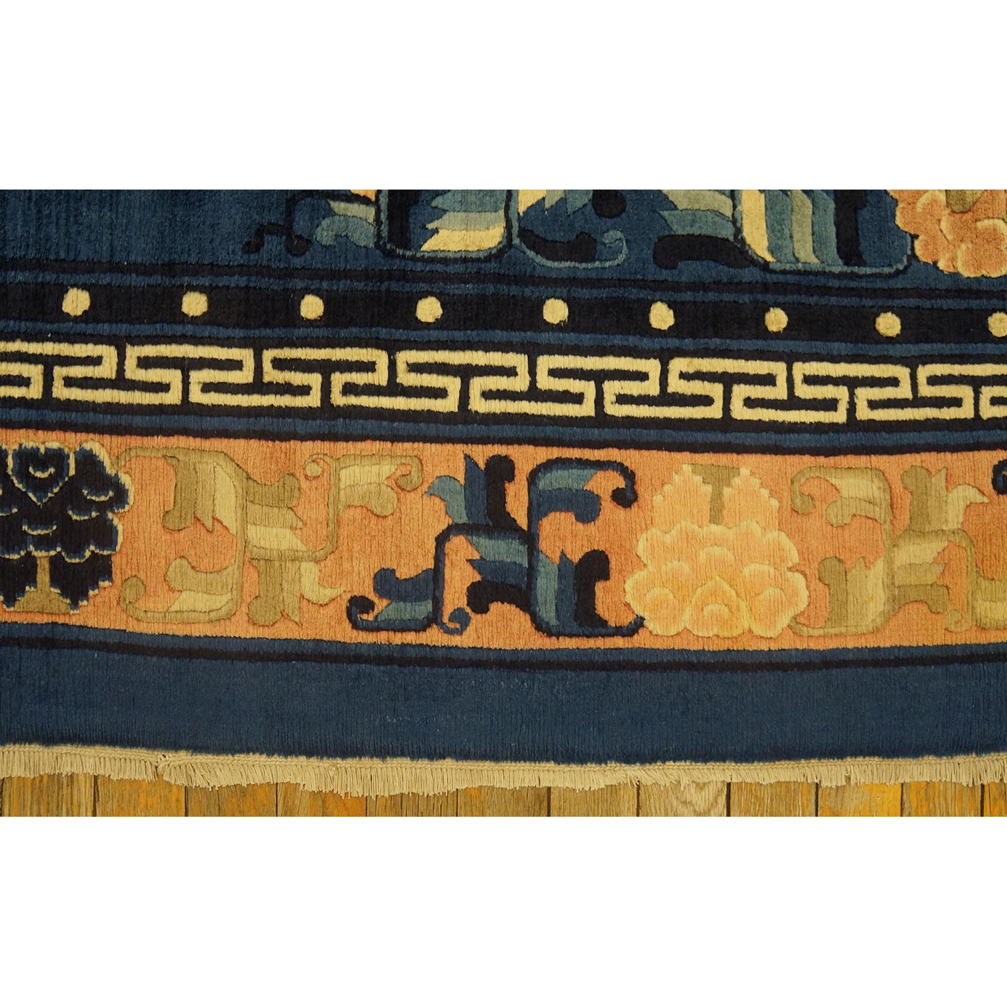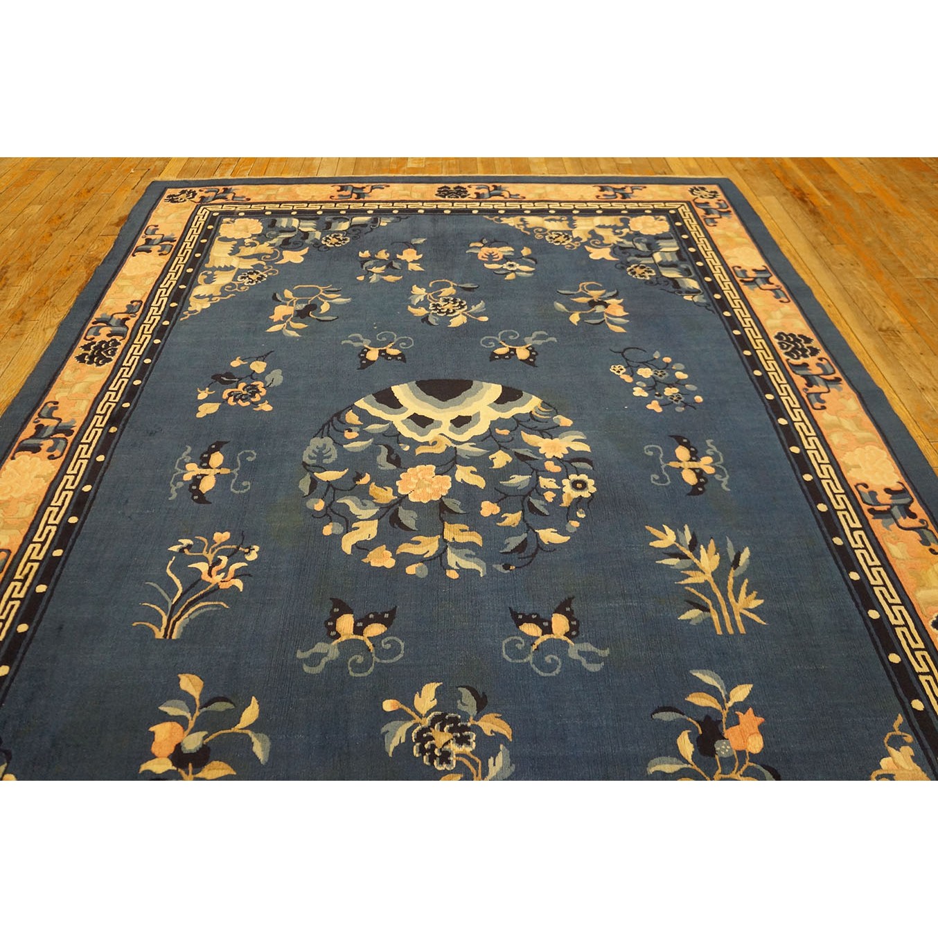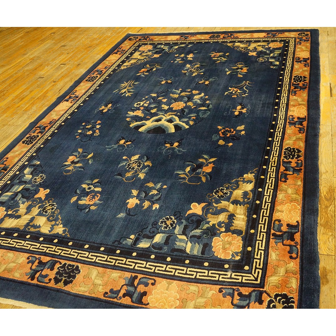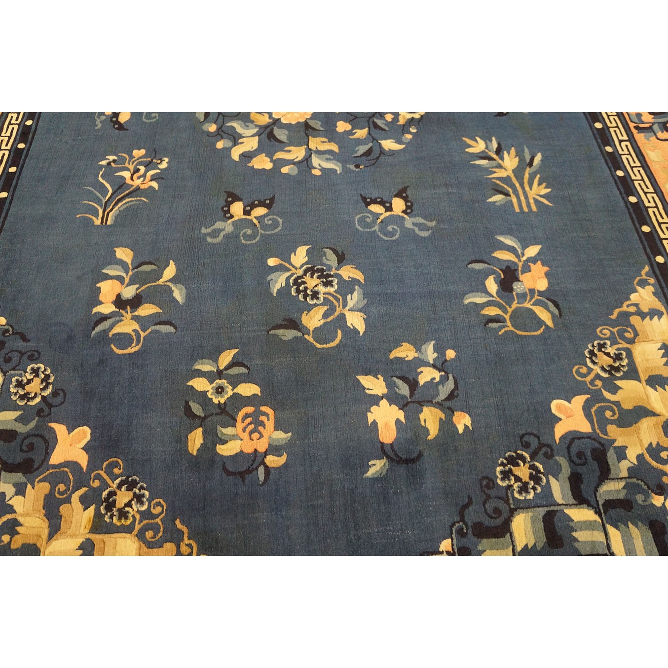 DescriptionChineseCarpets made in China proper. See entries Ningshia, Peking, Art Deco. Chinese - PekingThe commercial Peking carpet is a later 19th century development, begun by importing weaves from Ningshia (see entry) to create and export industry aimed at Western markets. The foundation is cotton and the pile is a good quality carpet wool which takes dyes particularly well. The neat medium weave is in Persian (asymmetric) knots. Designs are strictly Chinese and the whole motif repertoire of Chinese art is employed. Blue and white is the most popular color combination and red is particularly rare. Sizes tend to 9 x 12 and larger, and few small pieces appear. For a short time in the early 1920s Persian designs were woven to capitalize on the death of new Iranian goods. The industry decimated by the Communist Revolution relocated to the Pearl River area. There is a good supply of antique carpets at reasonable prices. | |