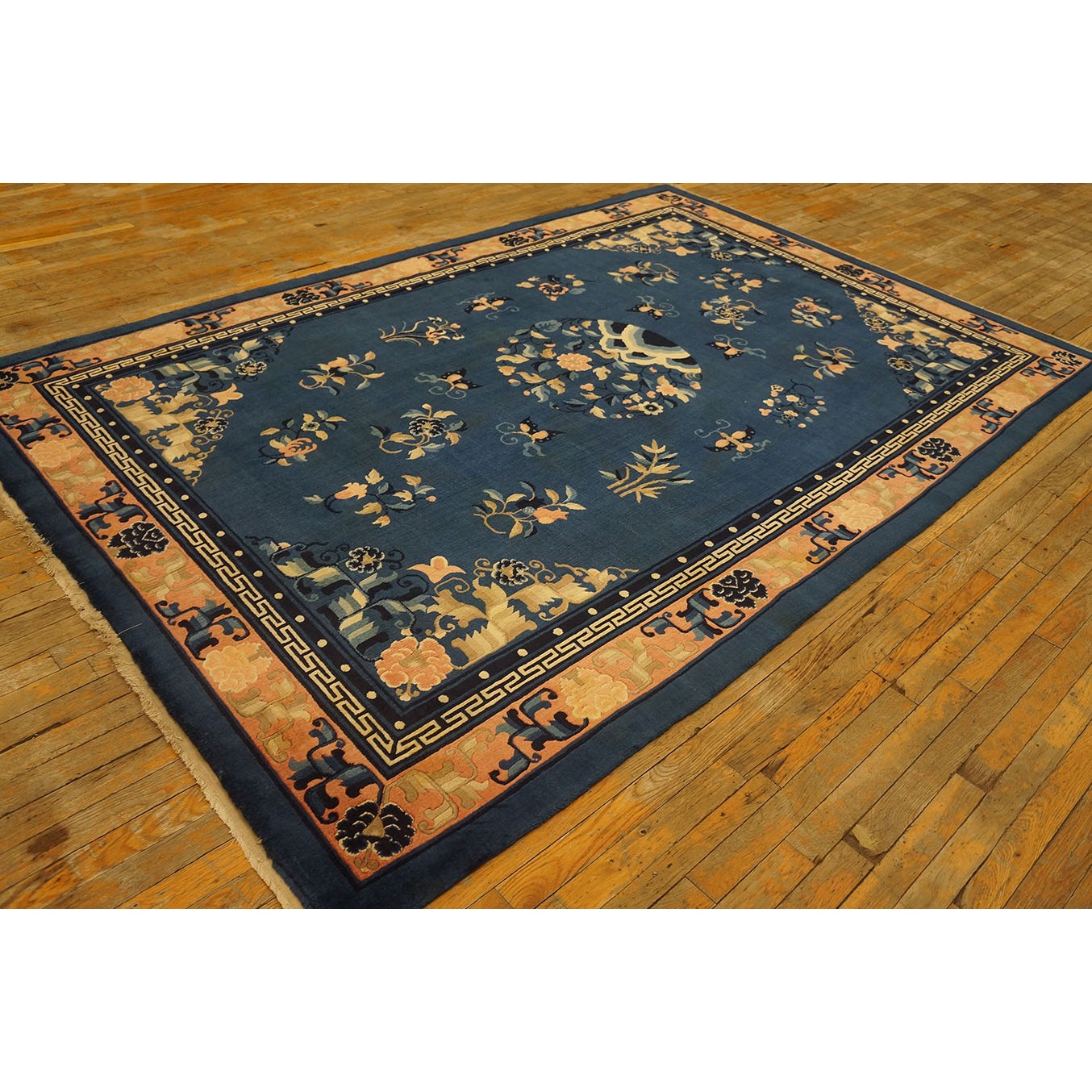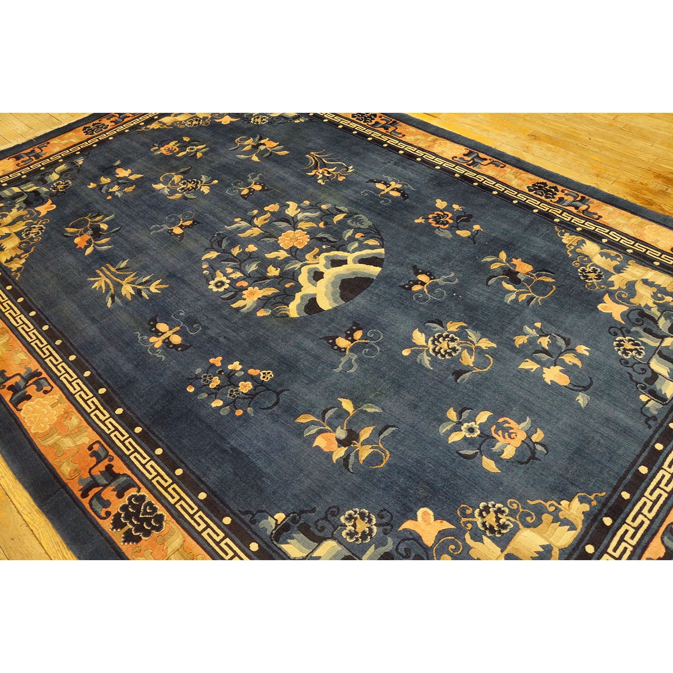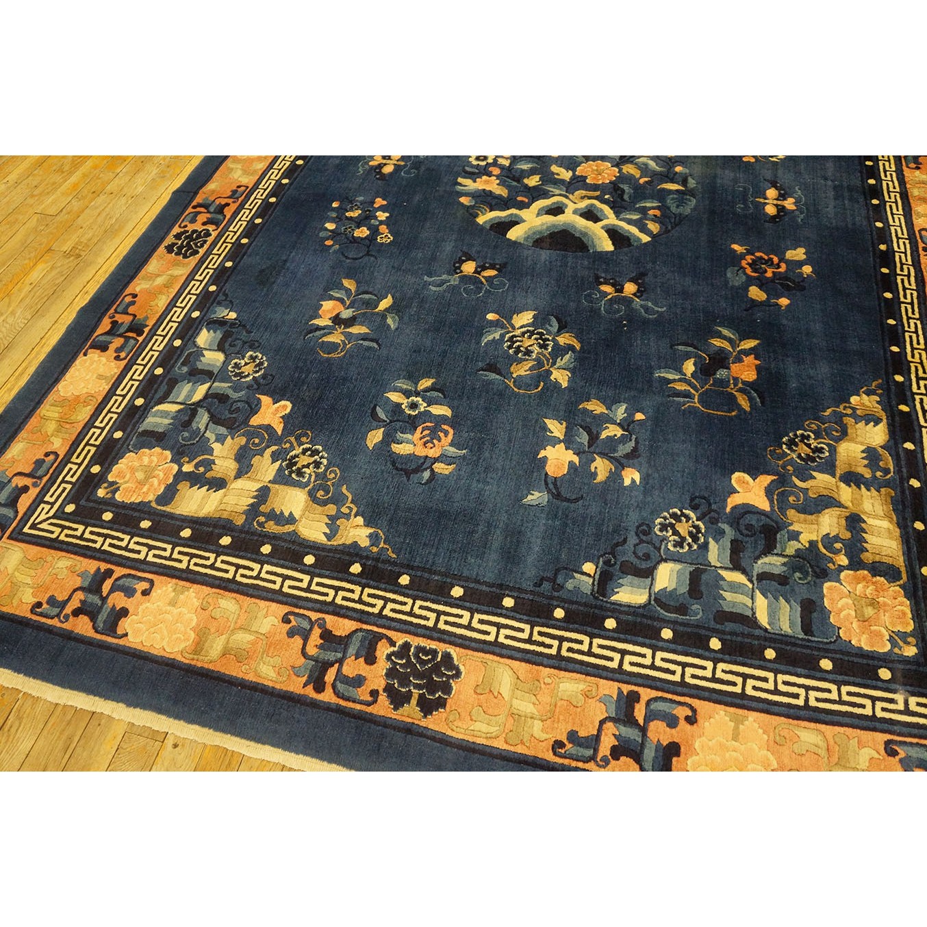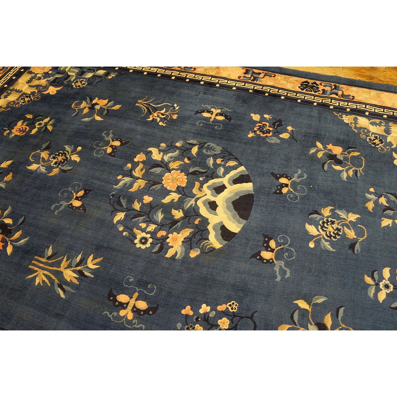 DescriptionChineseCarpets made in China proper. See entries Ningshia, Peking, Art Deco. Chinese - PekingThe commercial Peking carpet is a later 19th century development, begun by importing weaves from Ningshia (see entry) to create and export industry aimed at Western markets. The foundation is cotton and the pile is a good quality carpet wool which takes dyes particularly well. The neat medium weave is in Persian (asymmetric) knots. Designs are strictly Chinese and the whole motif repertoire of Chinese art is employed. Blue and white is the most popular color combination and red is particularly rare. Sizes tend to 9 x 12 and larger, and few small pieces appear. For a short time in the early 1920s Persian designs were woven to capitalize on the death of new Iranian goods. The industry decimated by the Communist Revolution relocated to the Pearl River area. There is a good supply of antique carpets at reasonable prices. | |
