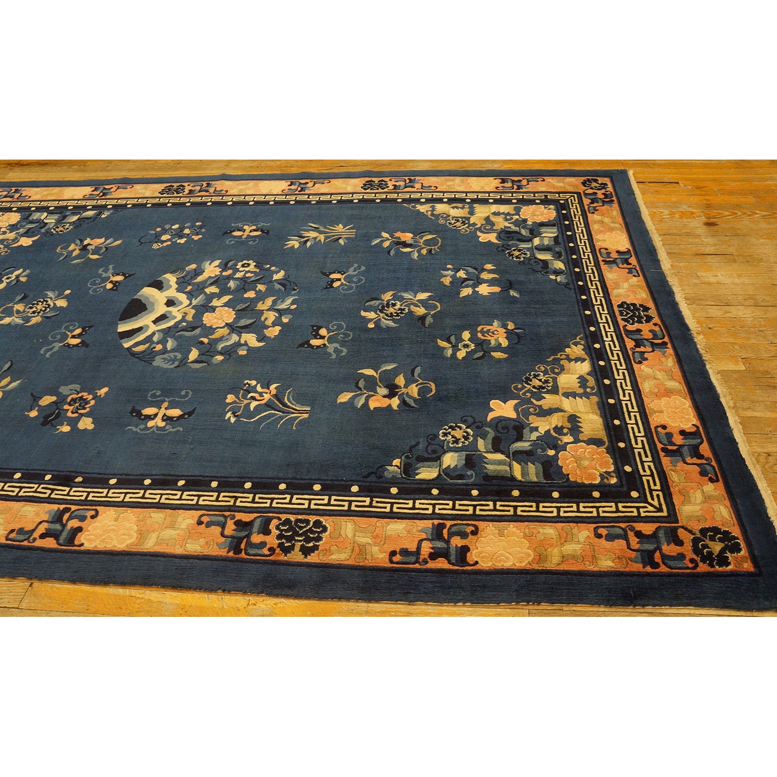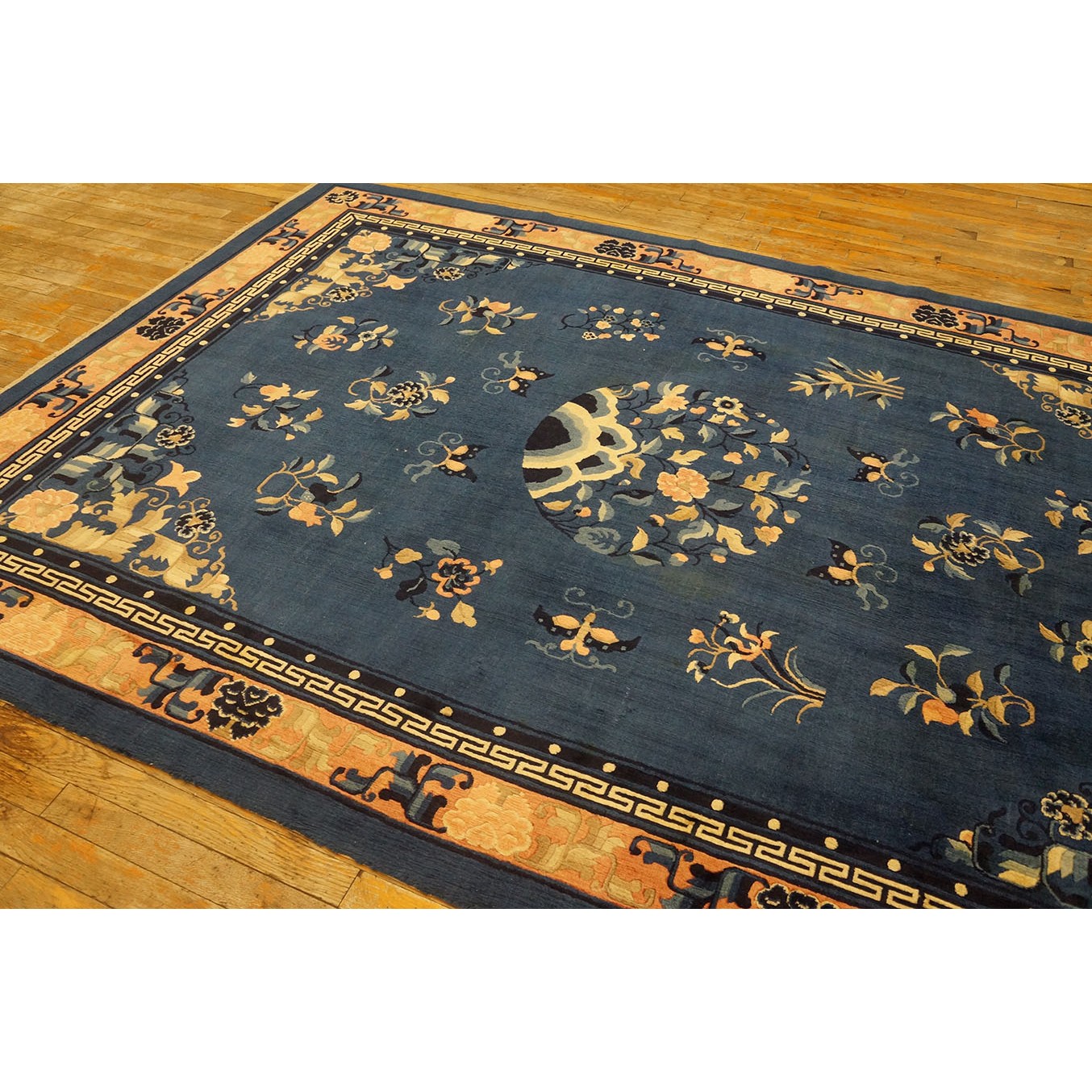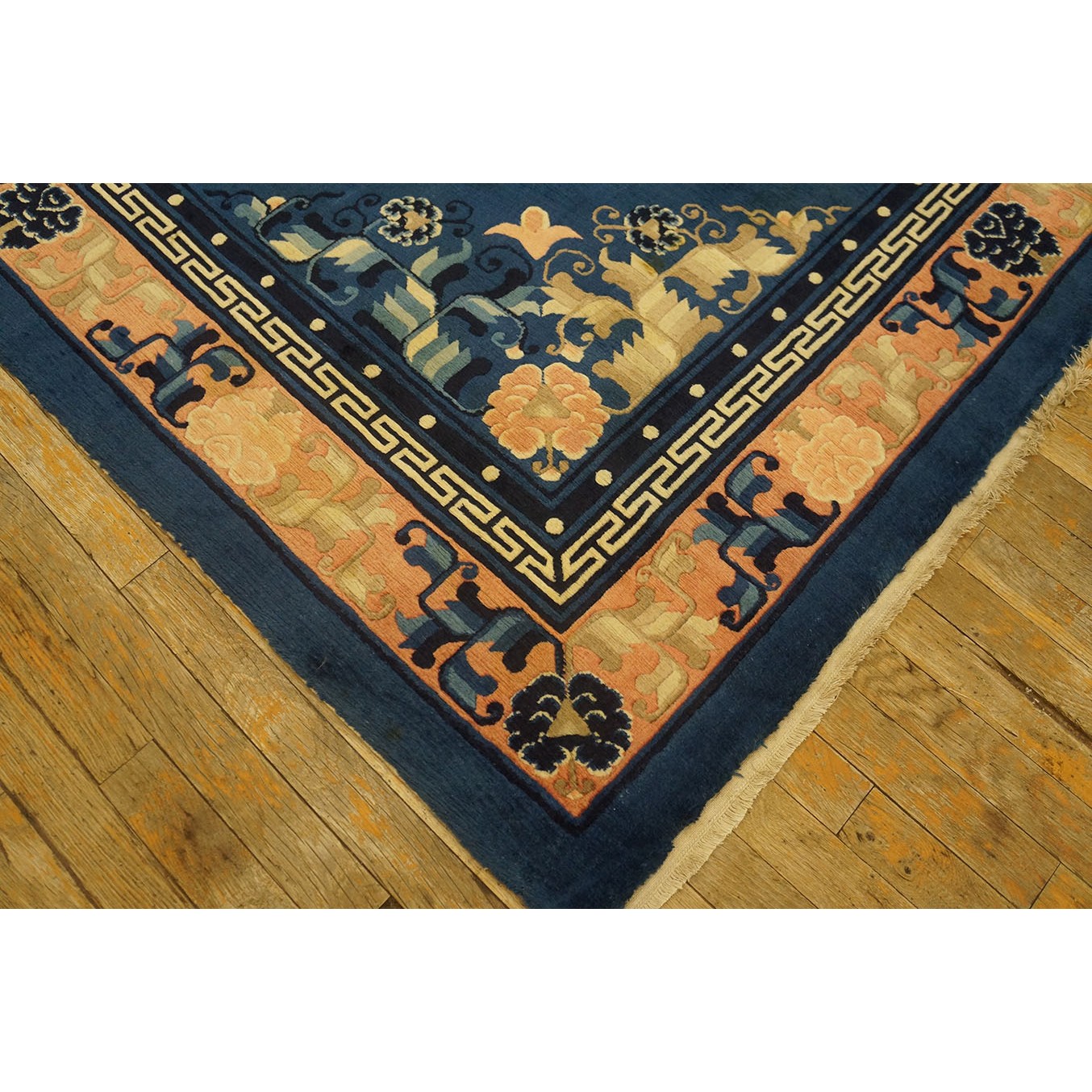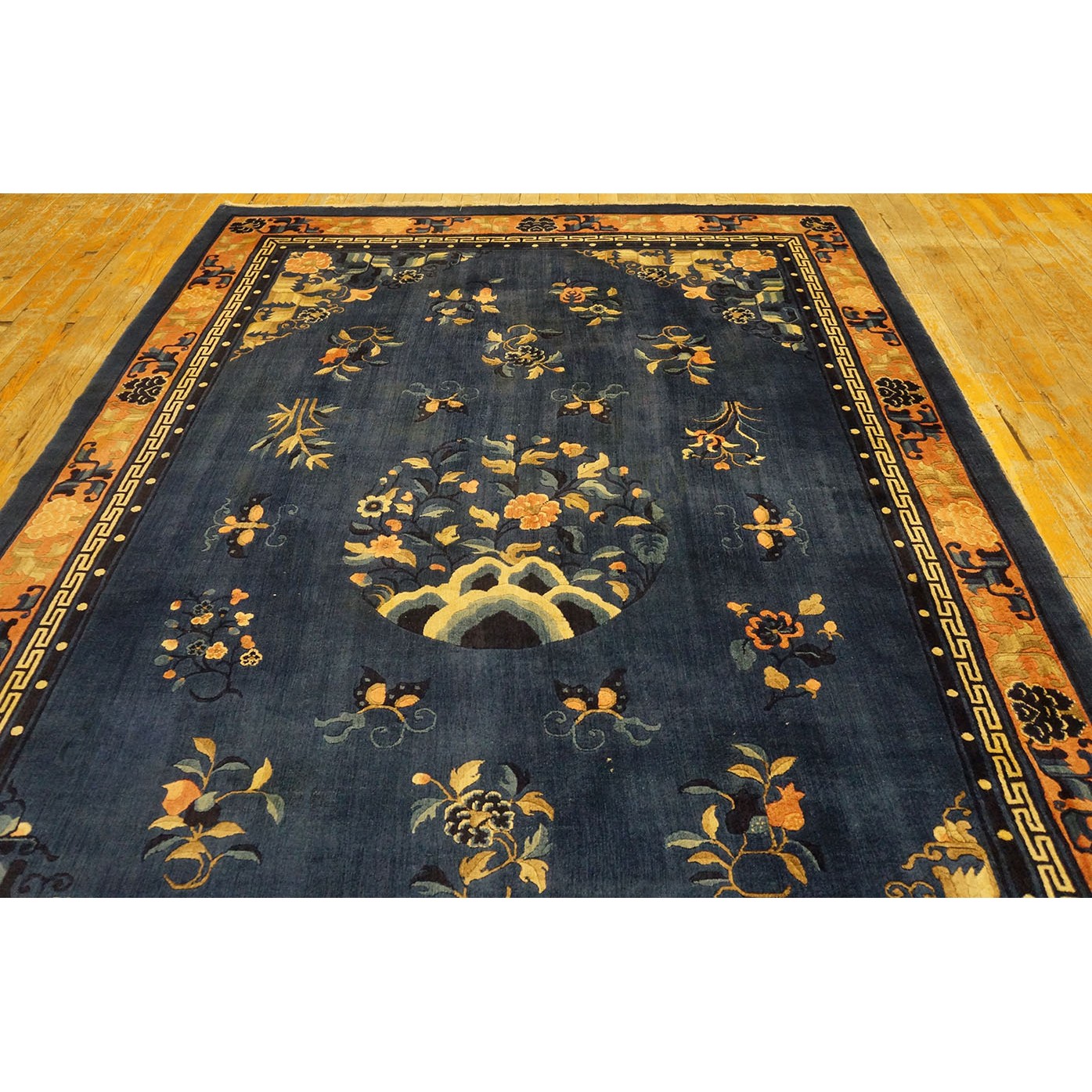 DescriptionChineseCarpets made in China proper. See entries Ningshia, Peking, Art Deco. Chinese - PekingThe commercial Peking carpet is a later 19th century development, begun by importing weaves from Ningshia (see entry) to create and export industry aimed at Western markets. The foundation is cotton and the pile is a good quality carpet wool which takes dyes particularly well. The neat medium weave is in Persian (asymmetric) knots. Designs are strictly Chinese and the whole motif repertoire of Chinese art is employed. Blue and white is the most popular color combination and red is particularly rare. Sizes tend to 9 x 12 and larger, and few small pieces appear. For a short time in the early 1920s Persian designs were woven to capitalize on the death of new Iranian goods. The industry decimated by the Communist Revolution relocated to the Pearl River area. There is a good supply of antique carpets at reasonable prices. | |