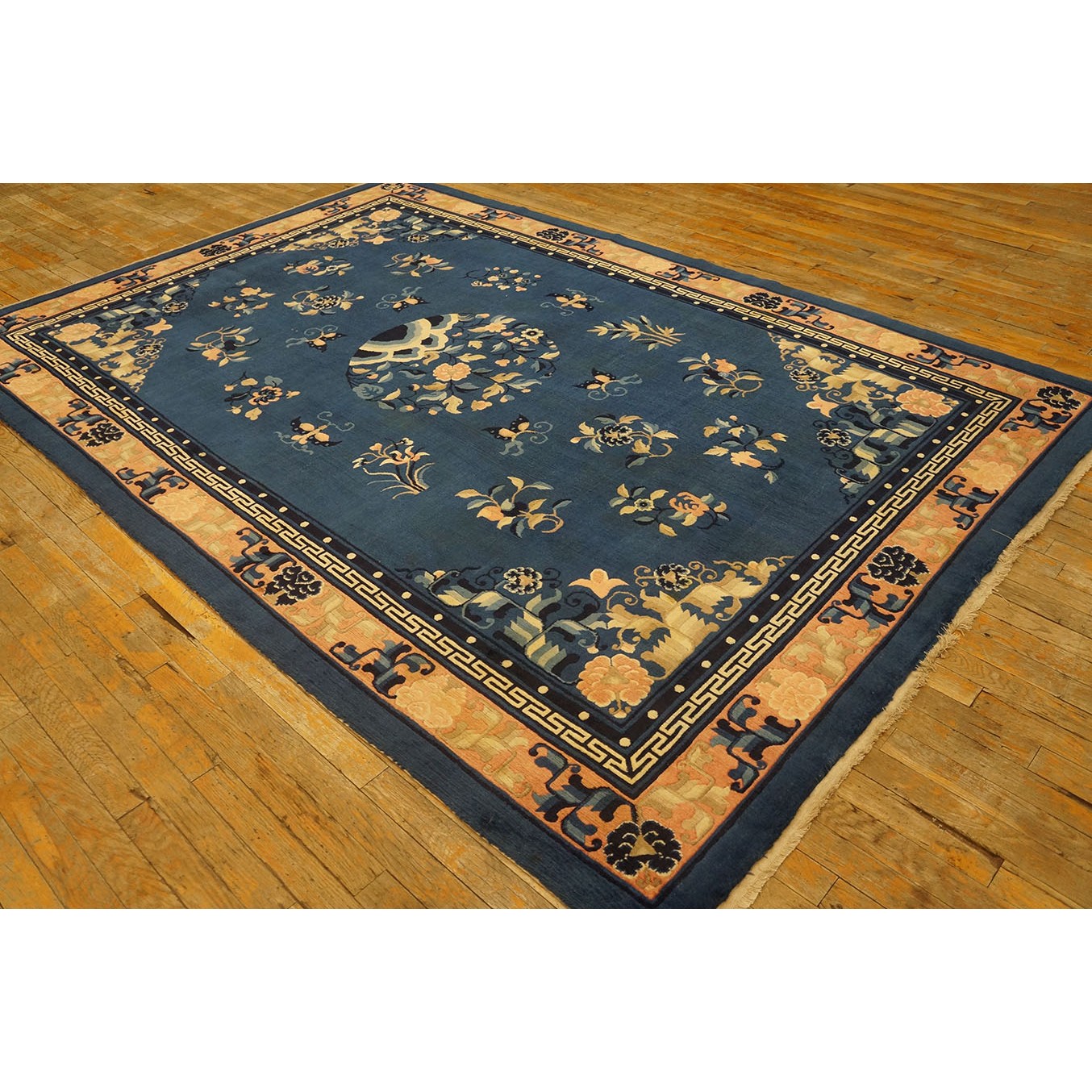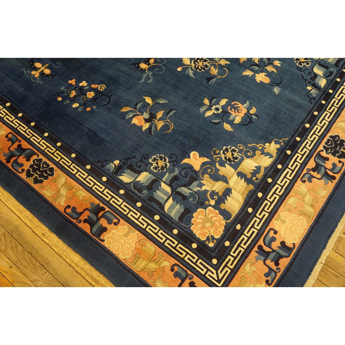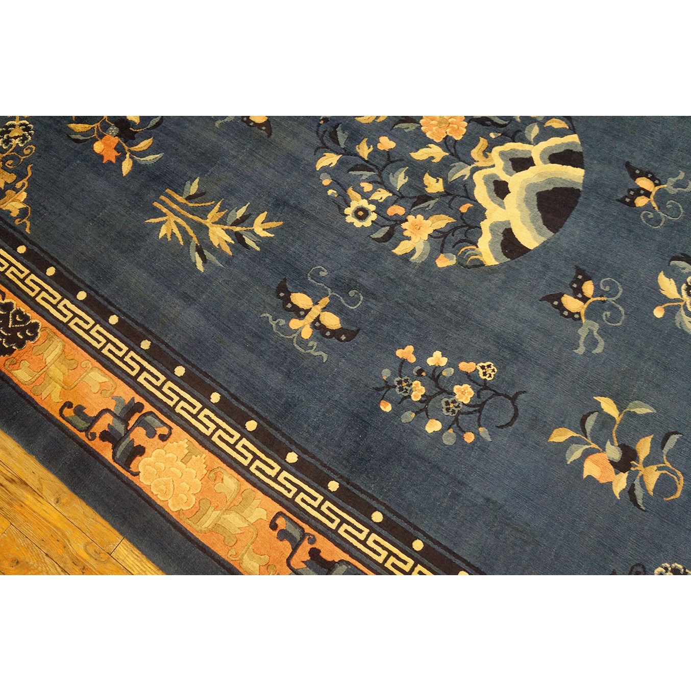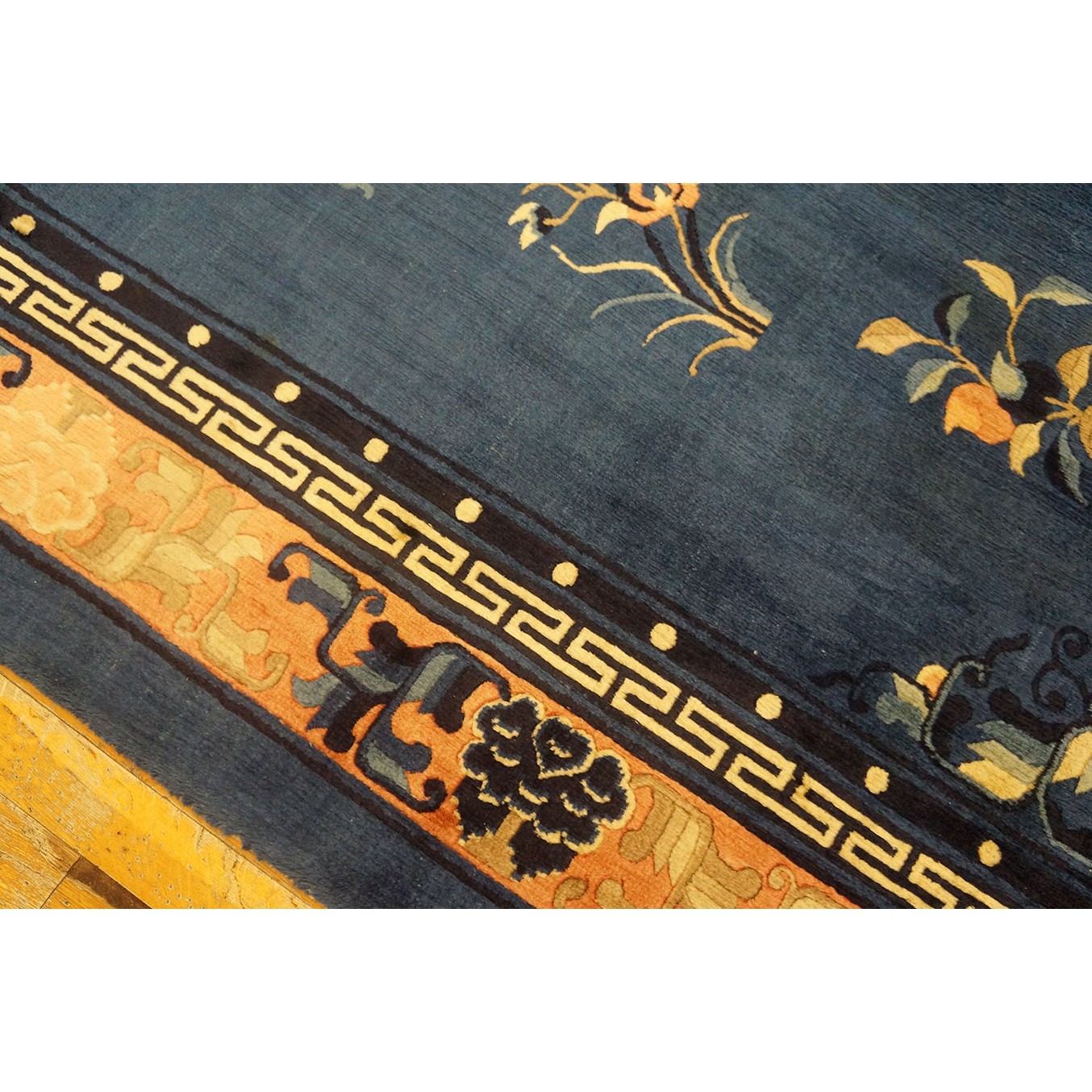 DescriptionChineseCarpets made in China proper. See entries Ningshia, Peking, Art Deco. Chinese - PekingThe commercial Peking carpet is a later 19th century development, begun by importing weaves from Ningshia (see entry) to create and export industry aimed at Western markets. The foundation is cotton and the pile is a good quality carpet wool which takes dyes particularly well. The neat medium weave is in Persian (asymmetric) knots. Designs are strictly Chinese and the whole motif repertoire of Chinese art is employed. Blue and white is the most popular color combination and red is particularly rare. Sizes tend to 9 x 12 and larger, and few small pieces appear. For a short time in the early 1920s Persian designs were woven to capitalize on the death of new Iranian goods. The industry decimated by the Communist Revolution relocated to the Pearl River area. There is a good supply of antique carpets at reasonable prices. | |