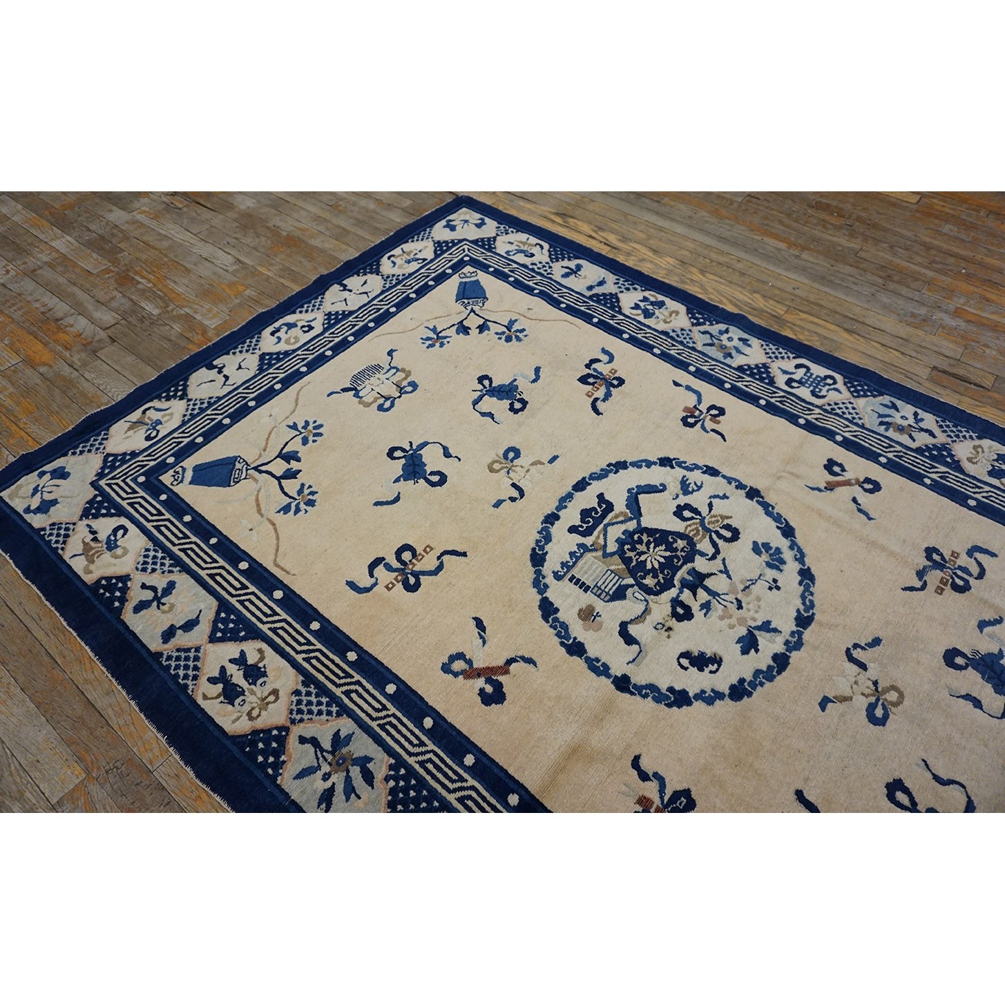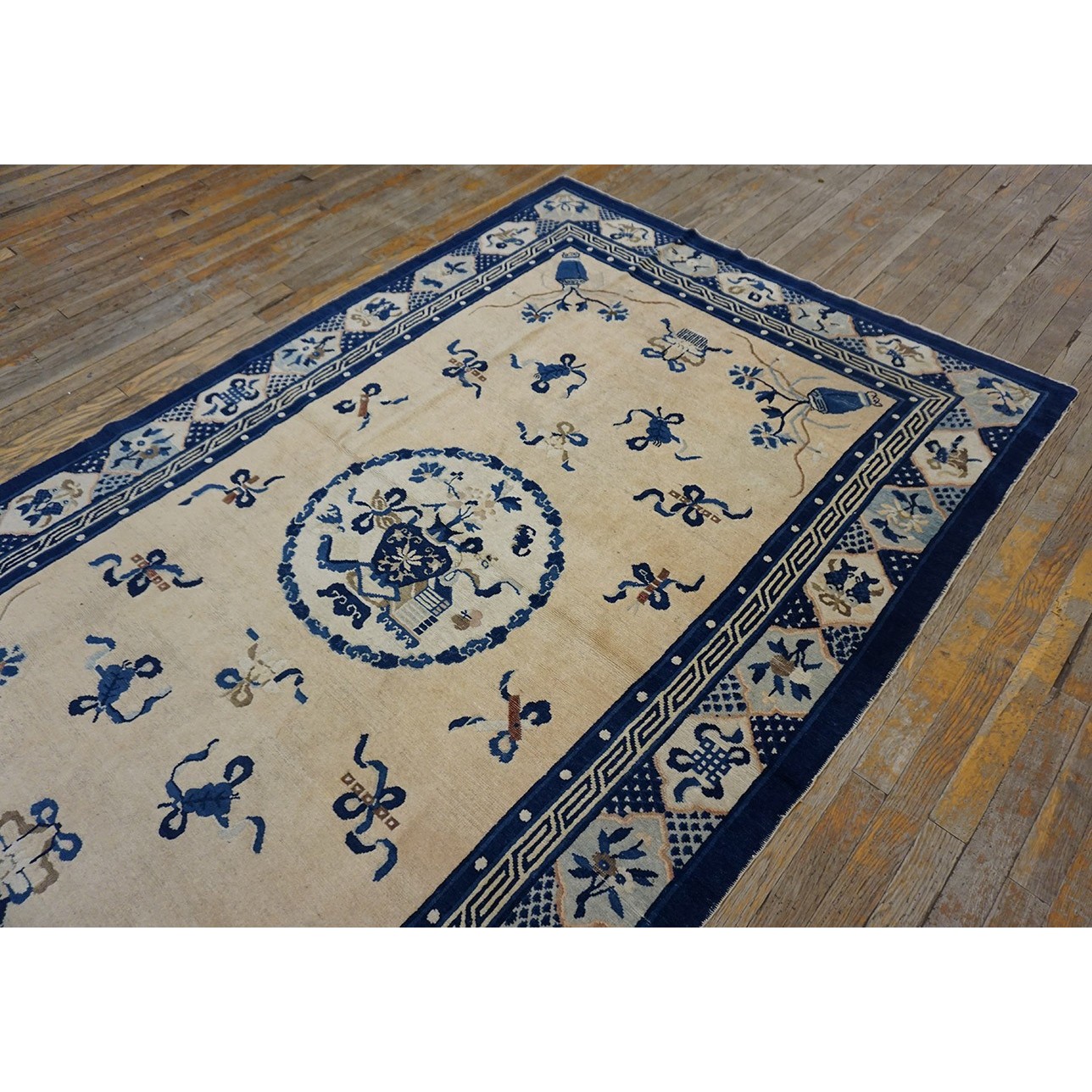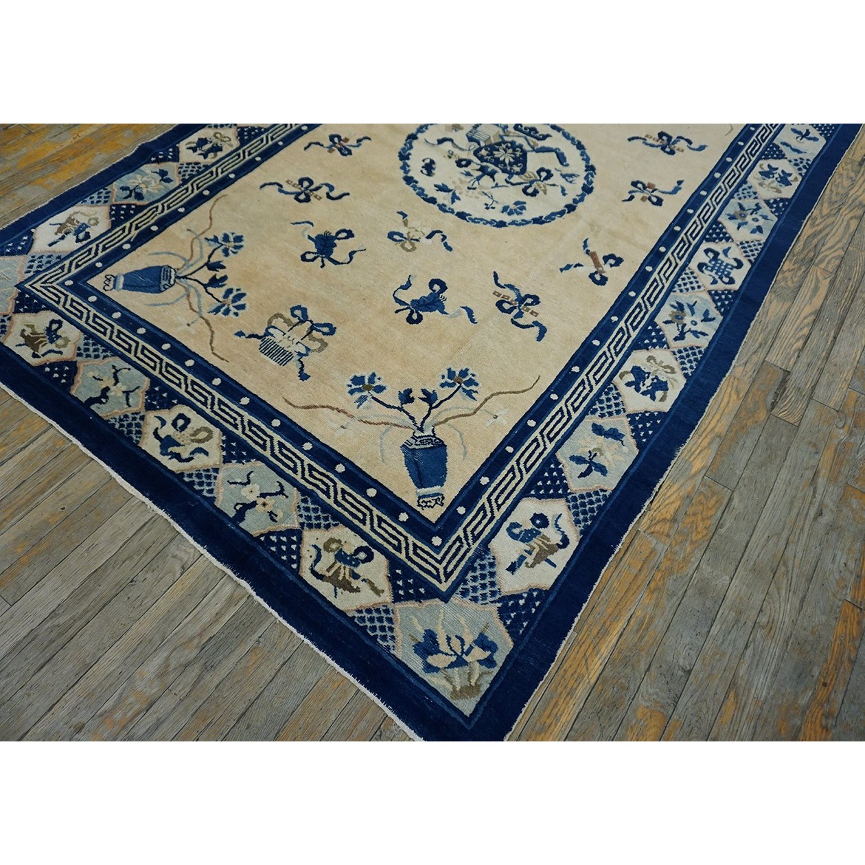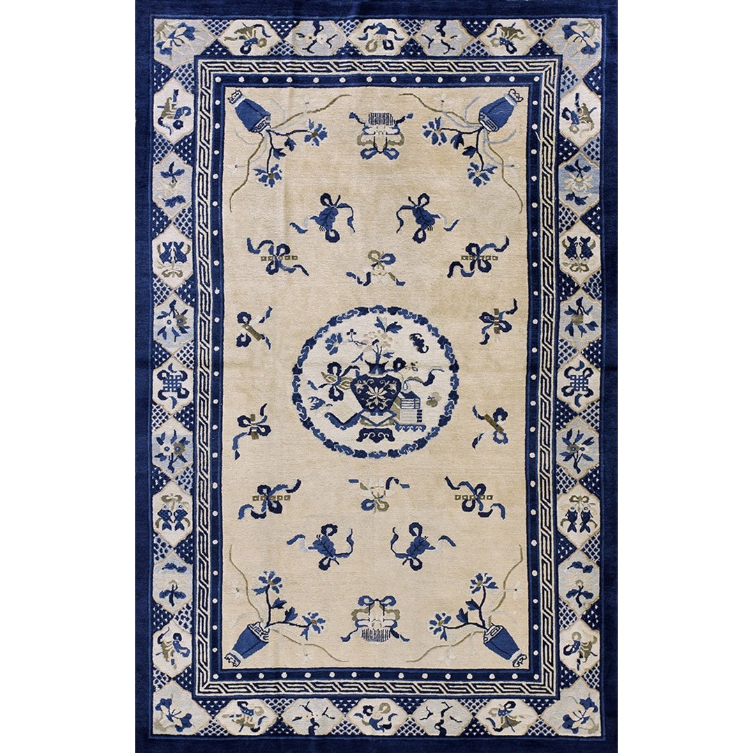 DescriptionChineseCarpets made in China proper. See entries Ningshia, Peking, Art Deco. Chinese - PekingThe commercial Peking carpet is a later 19th century development, begun by importing weaves from Ningshia (see entry) to create and export industry aimed at Western markets. The foundation is cotton and the pile is a good quality carpet wool which takes dyes particularly well. The neat medium weave is in Persian (asymmetric) knots. Designs are strictly Chinese and the whole motif repertoire of Chinese art is employed. Blue and white is the most popular color combination and red is particularly rare. Sizes tend to 9 x 12 and larger, and few small pieces appear. For a short time in the early 1920s Persian designs were woven to capitalize on the death of new Iranian goods. The industry decimated by the Communist Revolution relocated to the Pearl River area. There is a good supply of antique carpets at reasonable prices. | |