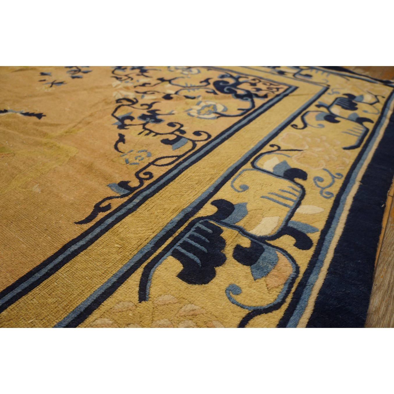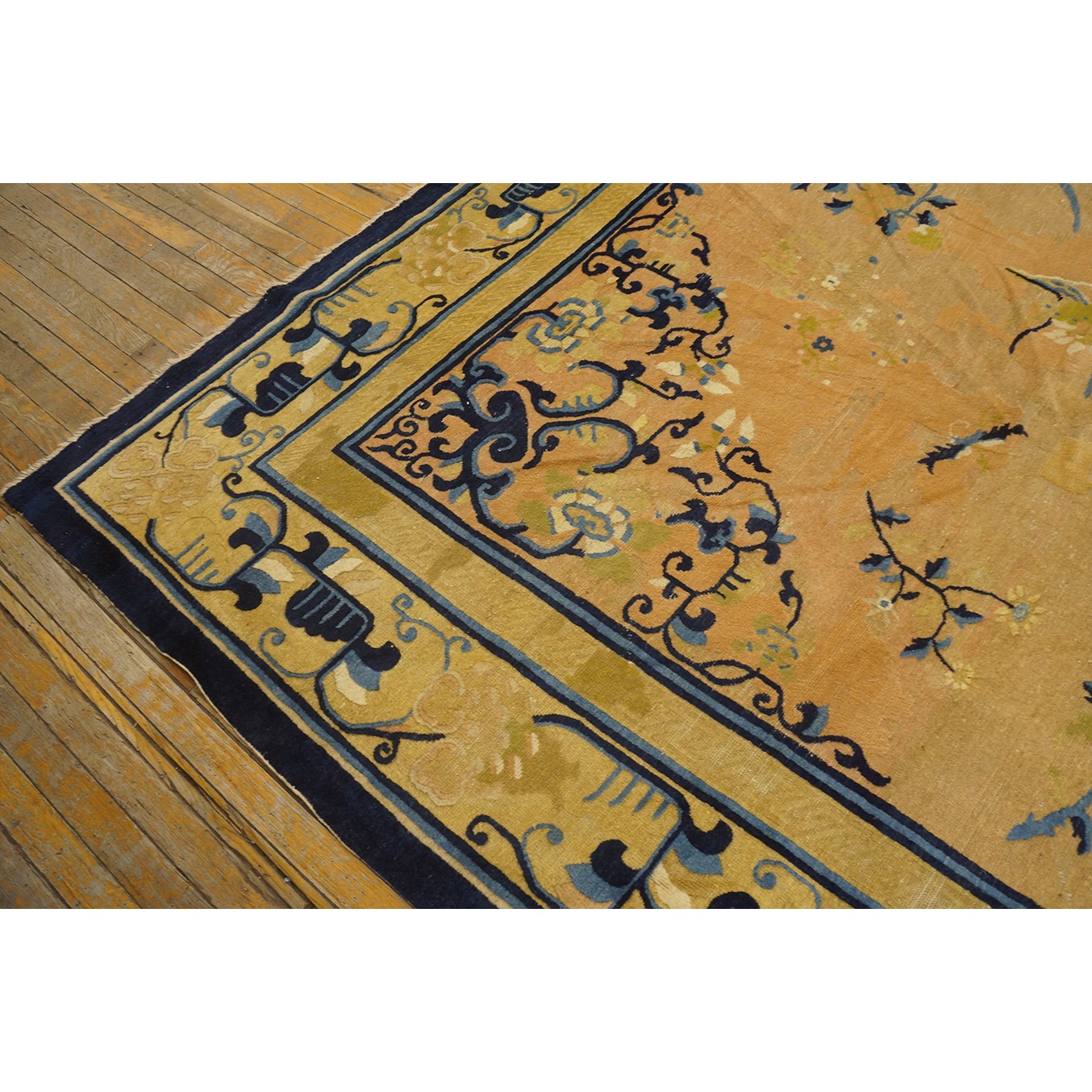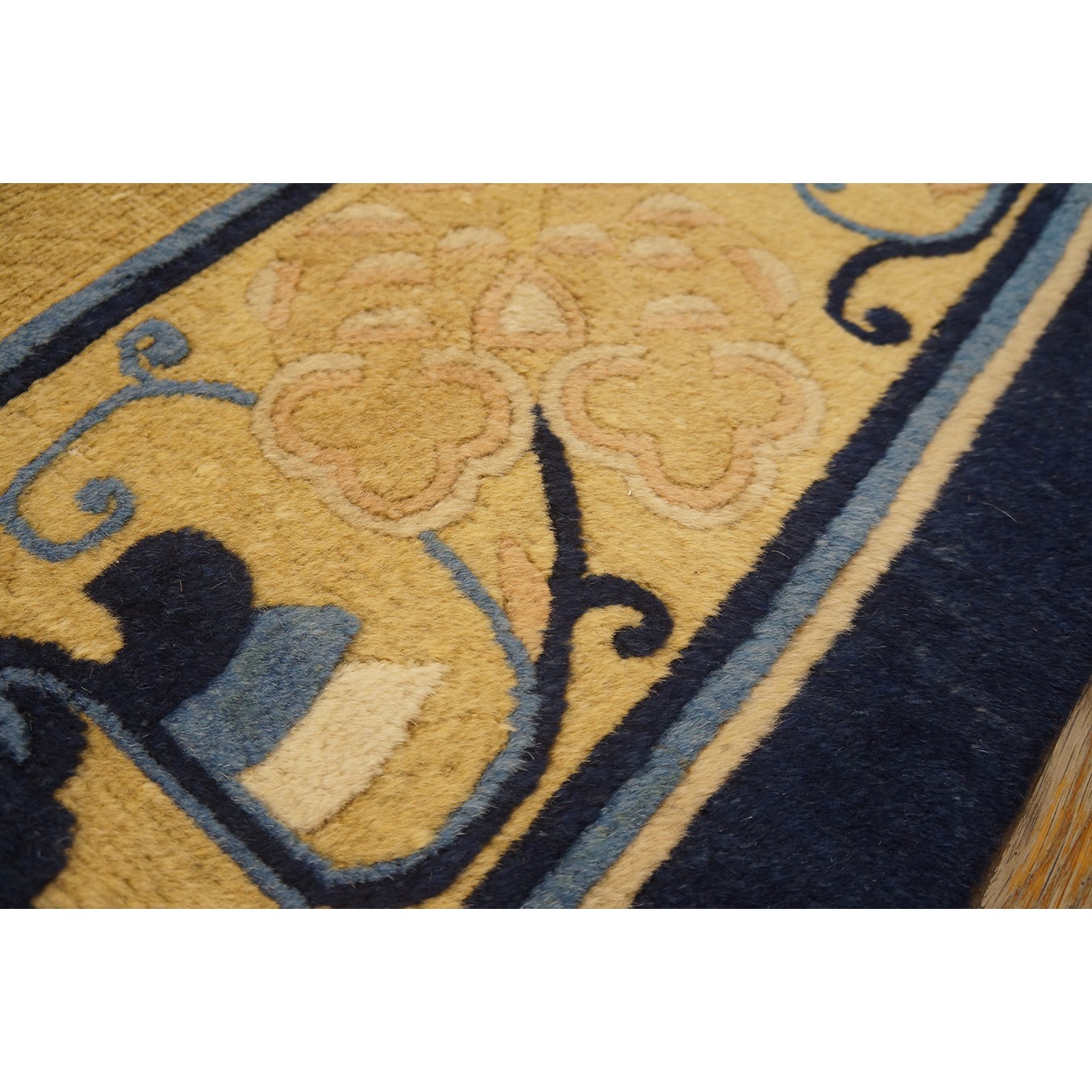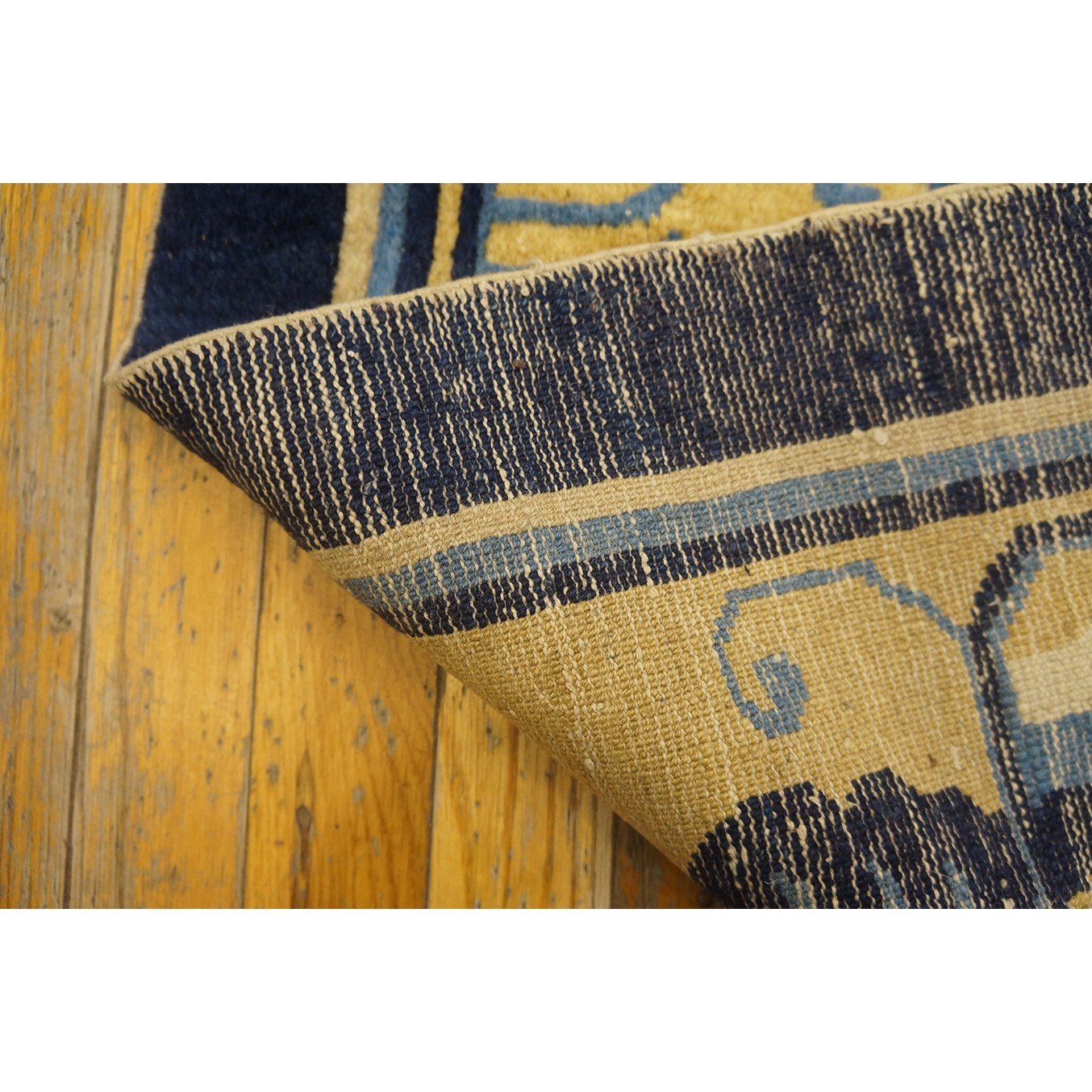 DescriptionChineseCarpets made in China proper. See entries Ningshia, Peking, Art Deco. Chinese - PekingThe commercial Peking carpet is a later 19th century development, begun by importing weaves from Ningshia (see entry) to create and export industry aimed at Western markets. The foundation is cotton and the pile is a good quality carpet wool which takes dyes particularly well. The neat medium weave is in Persian (asymmetric) knots. Designs are strictly Chinese and the whole motif repertoire of Chinese art is employed. Blue and white is the most popular color combination and red is particularly rare. Sizes tend to 9 x 12 and larger, and few small pieces appear. For a short time in the early 1920s Persian designs were woven to capitalize on the death of new Iranian goods. The industry decimated by the Communist Revolution relocated to the Pearl River area. There is a good supply of antique carpets at reasonable prices. | |