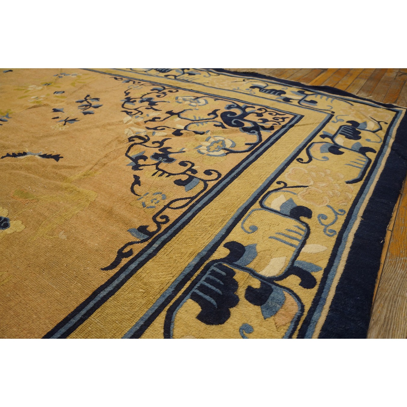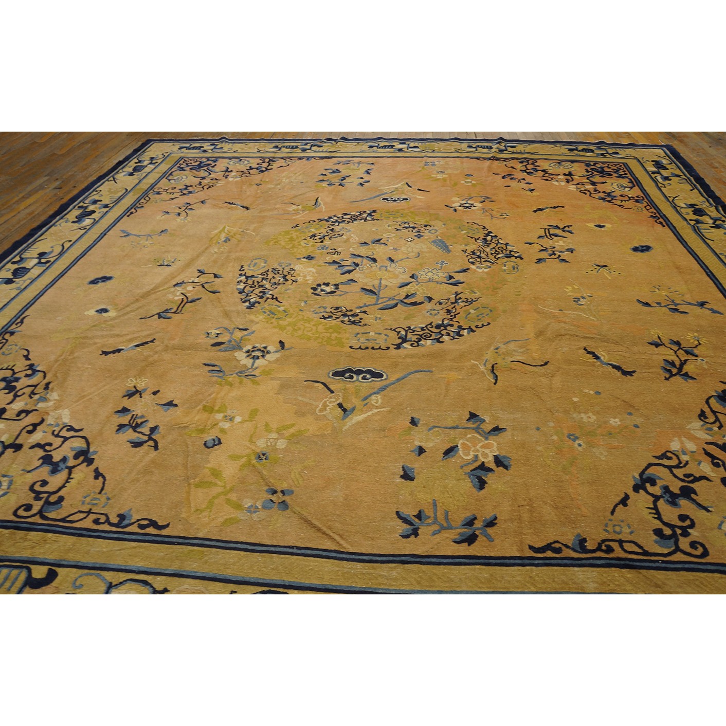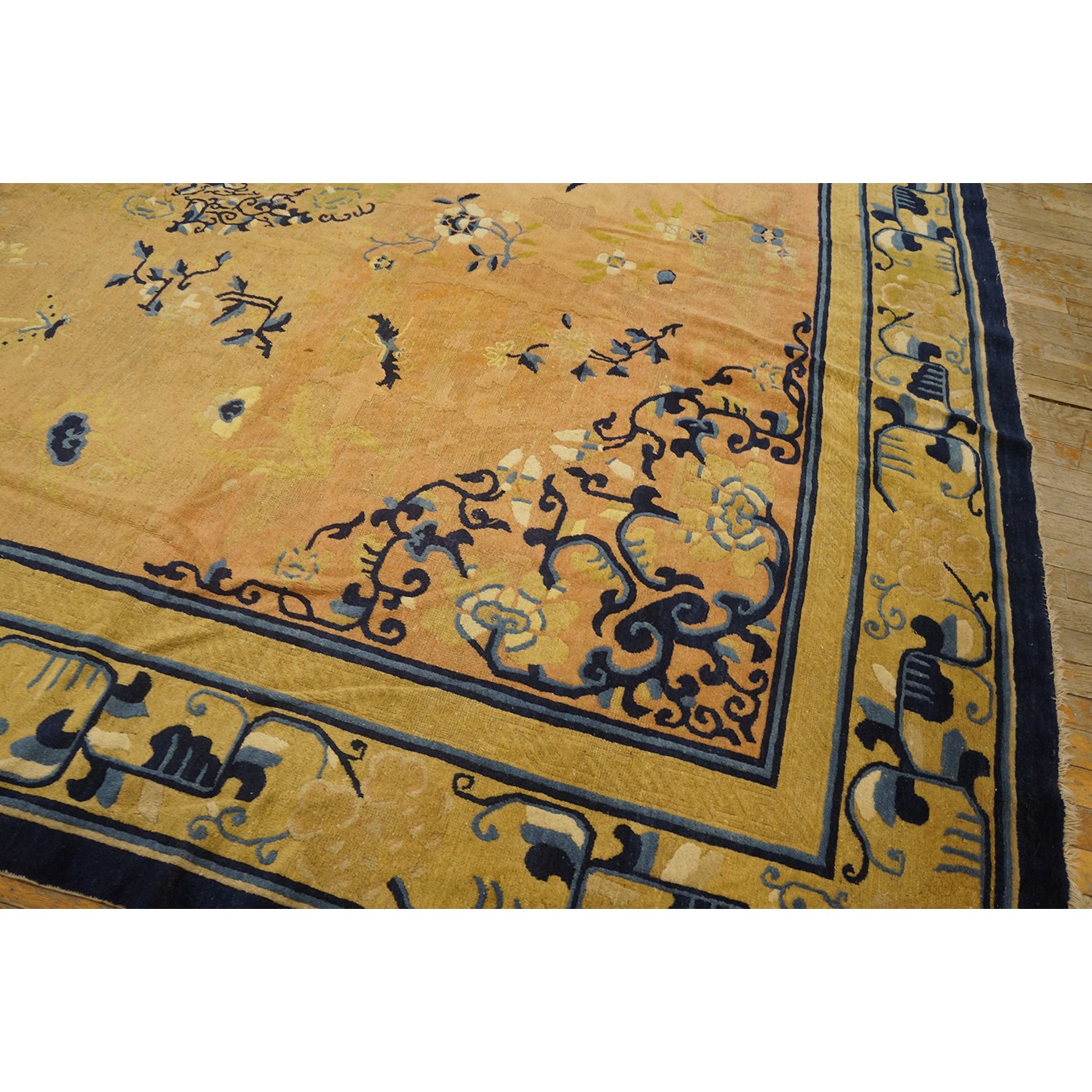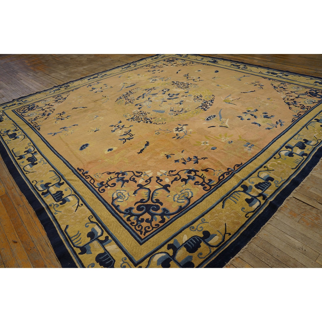 DescriptionChineseCarpets made in China proper. See entries Ningshia, Peking, Art Deco. Chinese - PekingThe commercial Peking carpet is a later 19th century development, begun by importing weaves from Ningshia (see entry) to create and export industry aimed at Western markets. The foundation is cotton and the pile is a good quality carpet wool which takes dyes particularly well. The neat medium weave is in Persian (asymmetric) knots. Designs are strictly Chinese and the whole motif repertoire of Chinese art is employed. Blue and white is the most popular color combination and red is particularly rare. Sizes tend to 9 x 12 and larger, and few small pieces appear. For a short time in the early 1920s Persian designs were woven to capitalize on the death of new Iranian goods. The industry decimated by the Communist Revolution relocated to the Pearl River area. There is a good supply of antique carpets at reasonable prices. | |