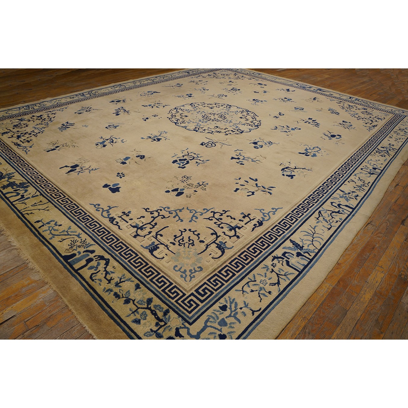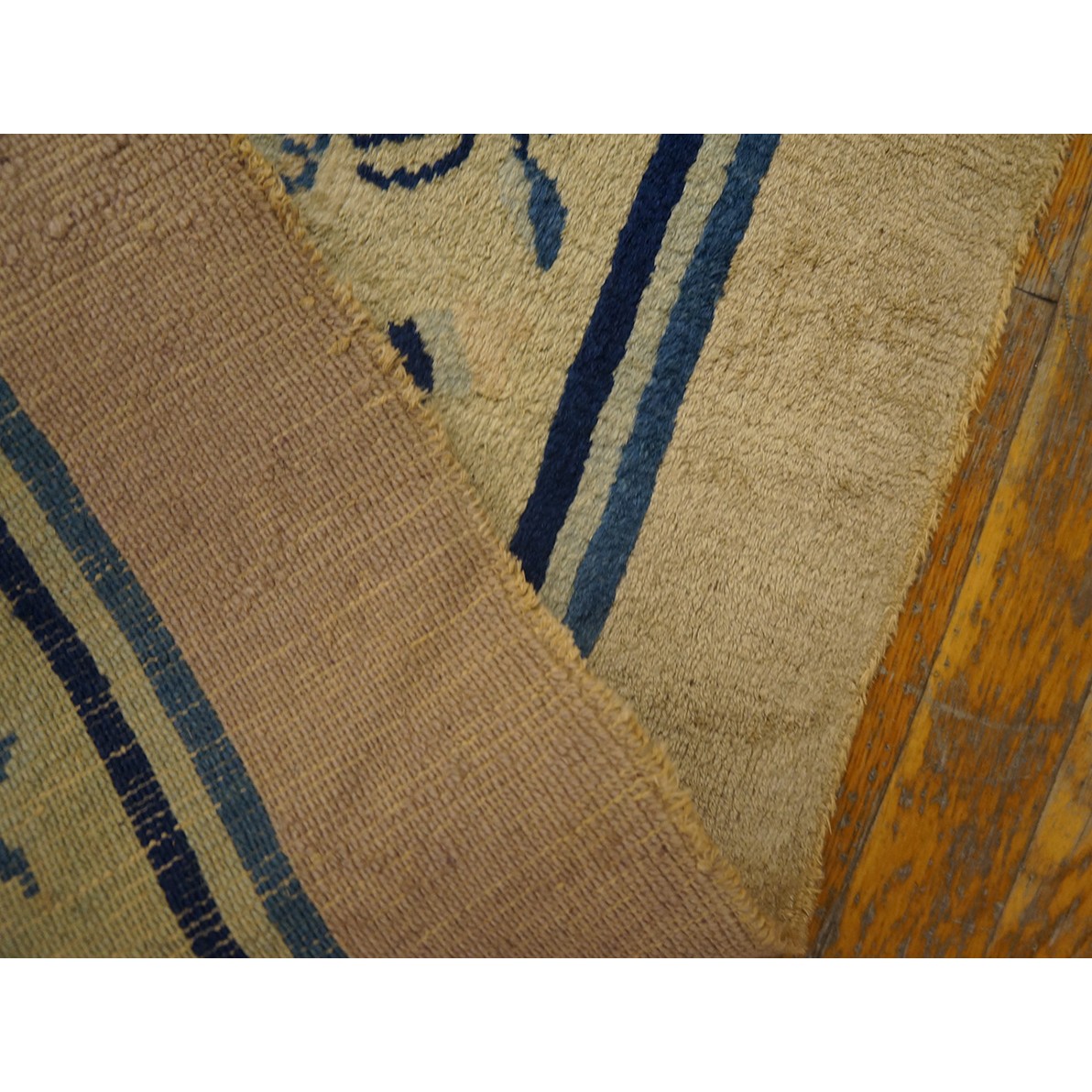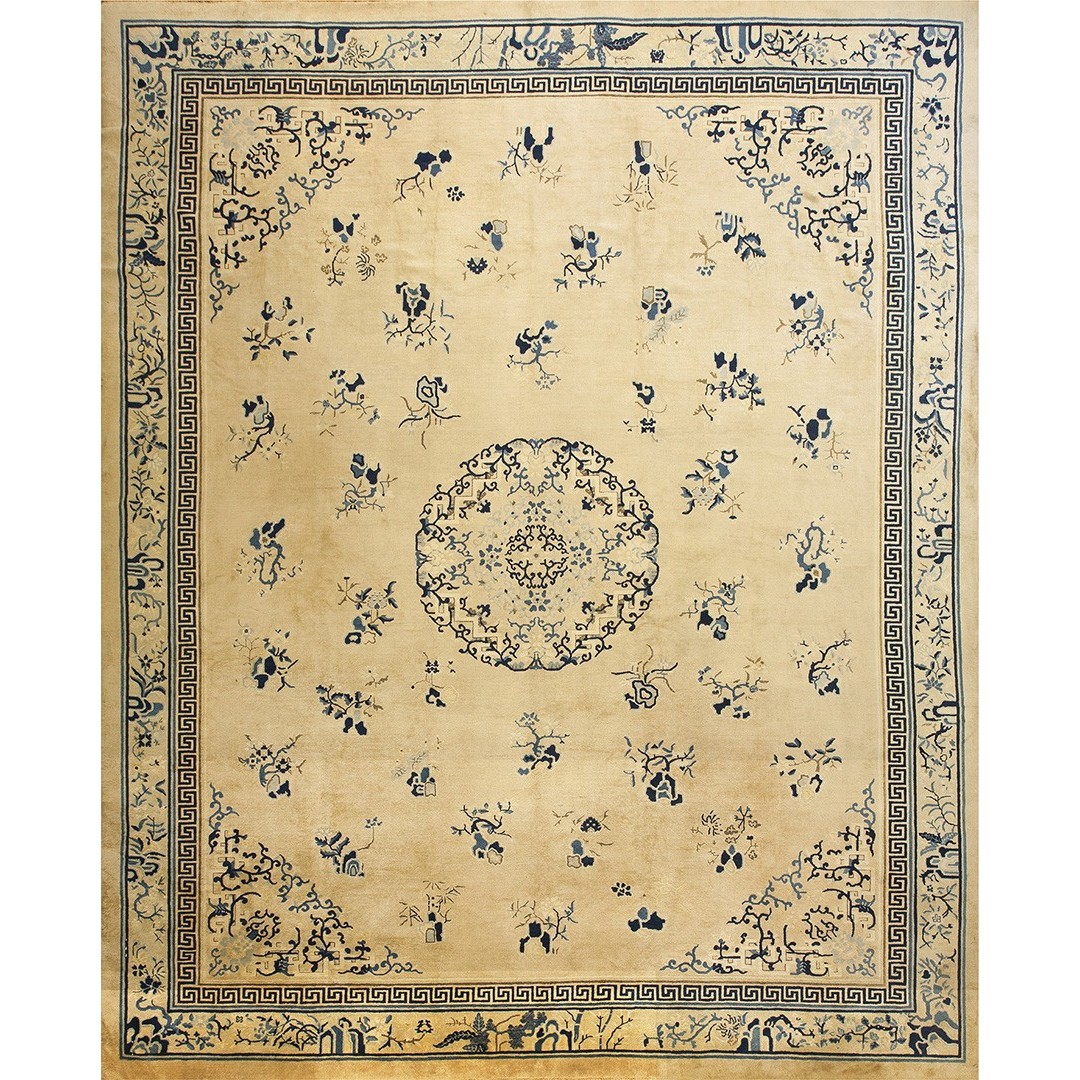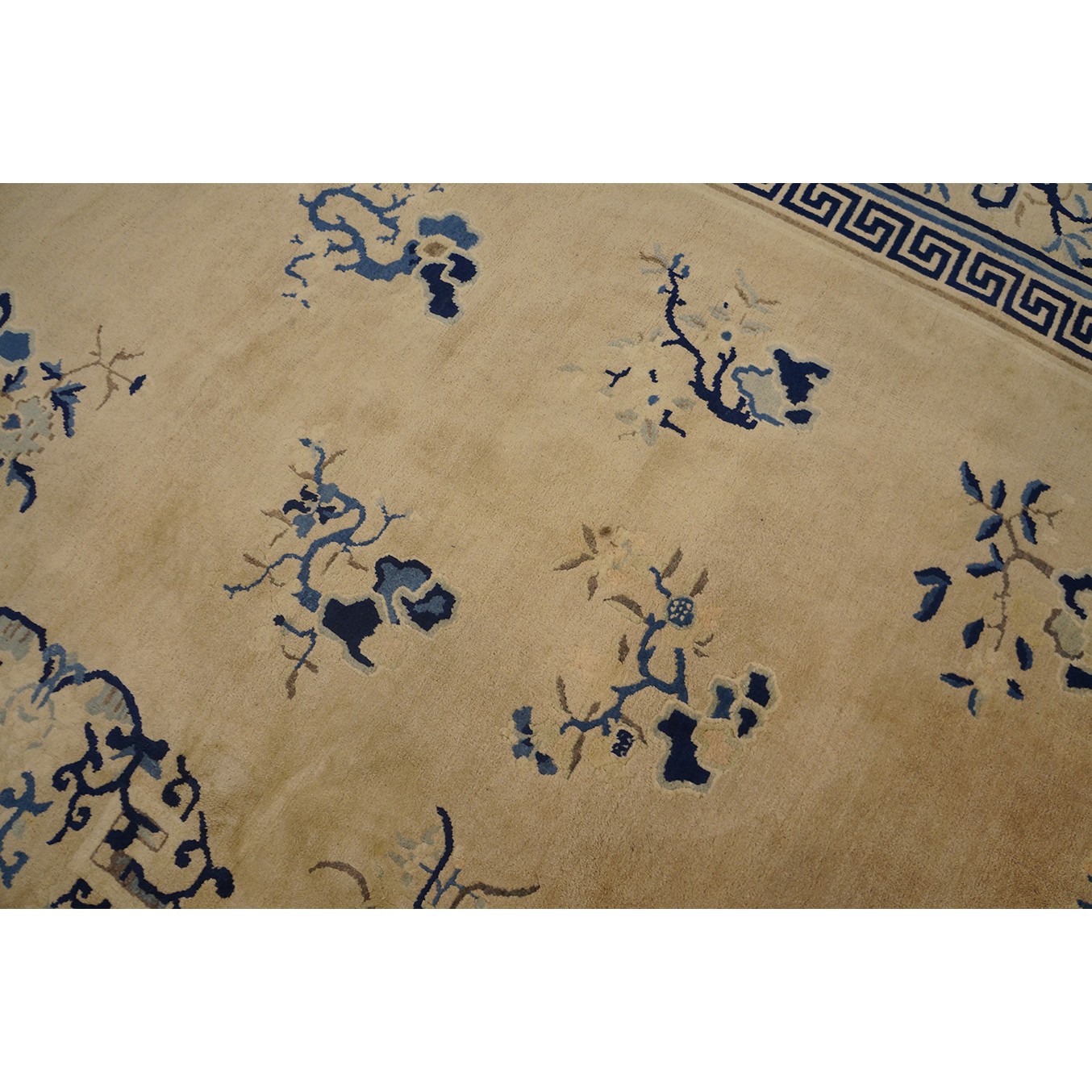 DescriptionChineseCarpets made in China proper. See entries Ningshia, Peking, Art Deco. Chinese - PekingThe commercial Peking carpet is a later 19th century development, begun by importing weaves from Ningshia (see entry) to create and export industry aimed at Western markets. The foundation is cotton and the pile is a good quality carpet wool which takes dyes particularly well. The neat medium weave is in Persian (asymmetric) knots. Designs are strictly Chinese and the whole motif repertoire of Chinese art is employed. Blue and white is the most popular color combination and red is particularly rare. Sizes tend to 9 x 12 and larger, and few small pieces appear. For a short time in the early 1920s Persian designs were woven to capitalize on the death of new Iranian goods. The industry decimated by the Communist Revolution relocated to the Pearl River area. There is a good supply of antique carpets at reasonable prices. | |
