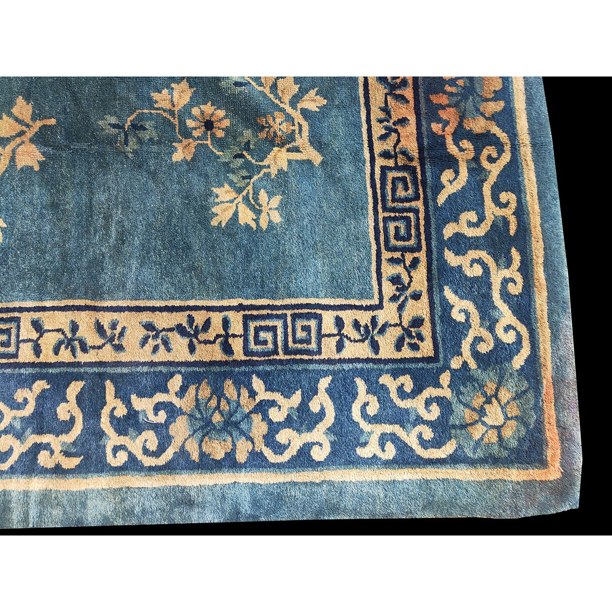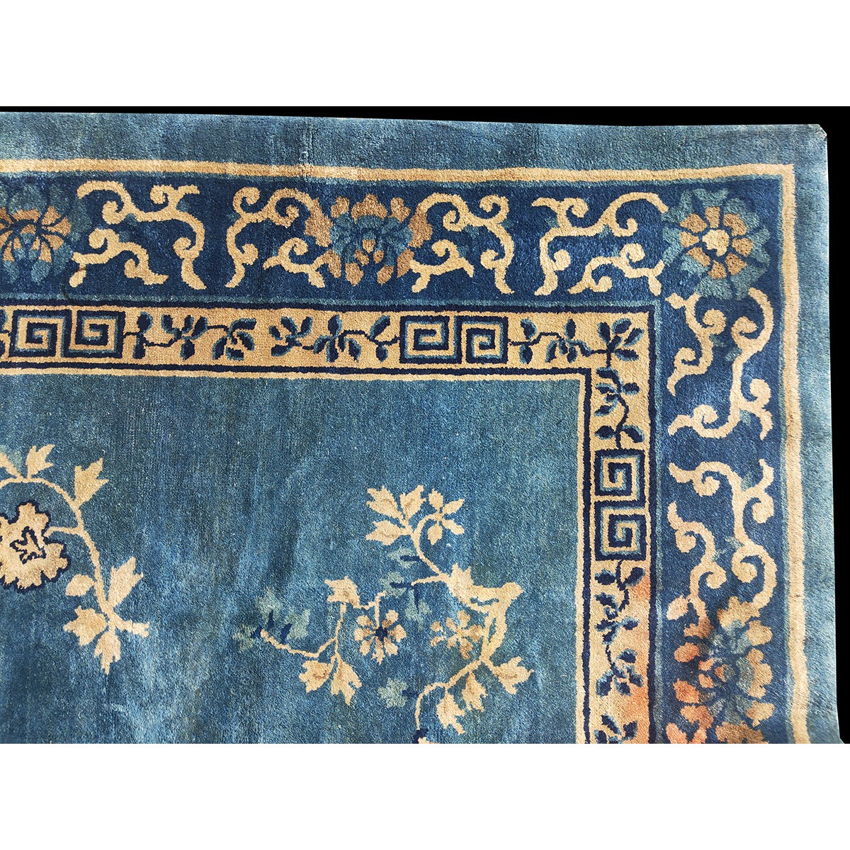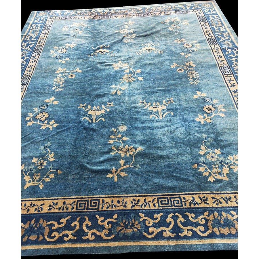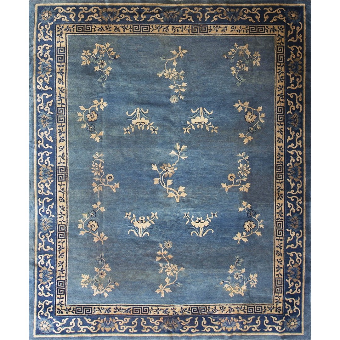 DescriptionChineseCarpets made in China proper. See entries Ningshia, Peking, Art Deco. Chinese - PekingThe commercial Peking carpet is a later 19th century development, begun by importing weaves from Ningshia (see entry) to create and export industry aimed at Western markets. The foundation is cotton and the pile is a good quality carpet wool which takes dyes particularly well. The neat medium weave is in Persian (asymmetric) knots. Designs are strictly Chinese and the whole motif repertoire of Chinese art is employed. Blue and white is the most popular color combination and red is particularly rare. Sizes tend to 9 x 12 and larger, and few small pieces appear. For a short time in the early 1920s Persian designs were woven to capitalize on the death of new Iranian goods. The industry decimated by the Communist Revolution relocated to the Pearl River area. There is a good supply of antique carpets at reasonable prices. | |