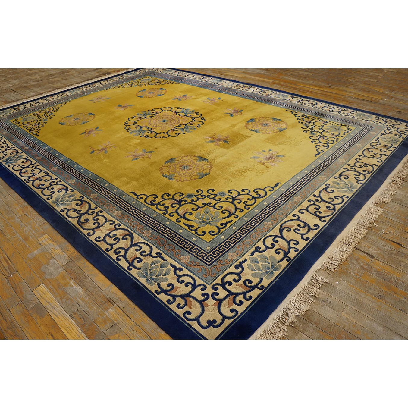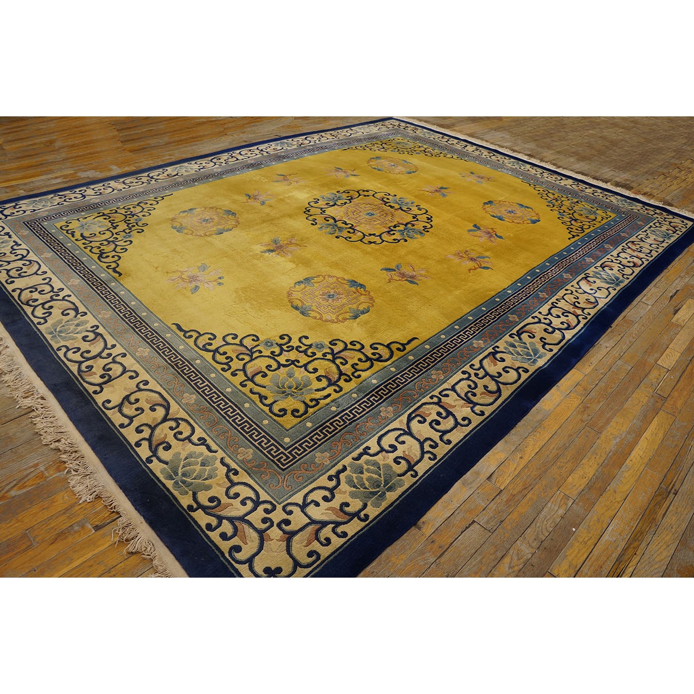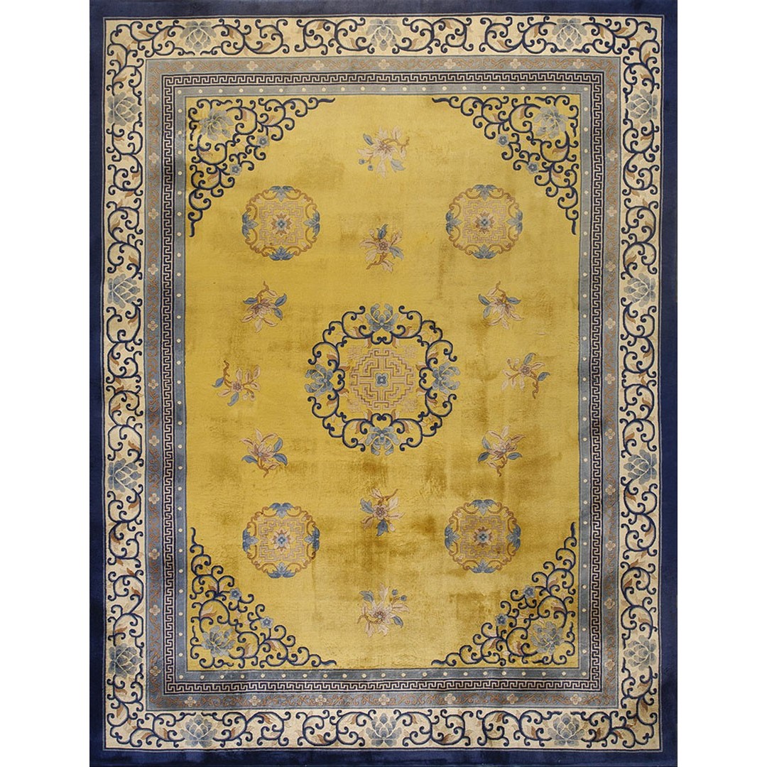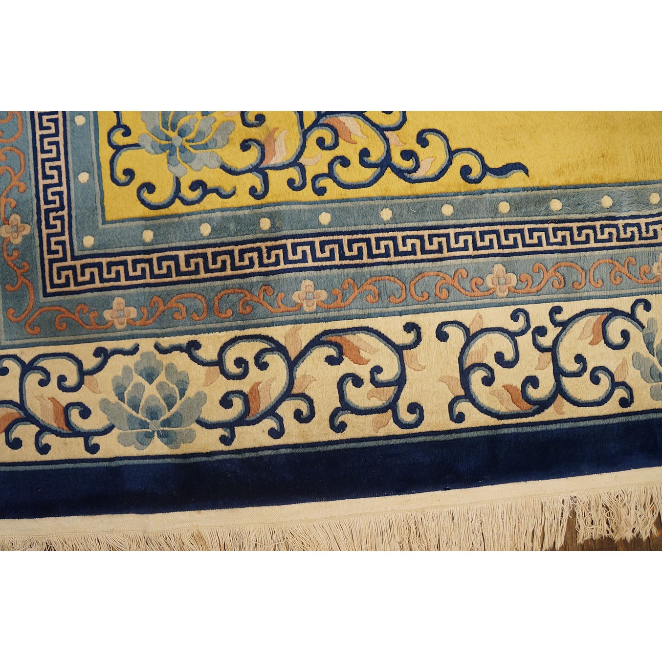 DescriptionChineseCarpets made in China proper. See entries Ningshia, Peking, Art Deco. Chinese - PekingThe commercial Peking carpet is a later 19th century development, begun by importing weaves from Ningshia (see entry) to create and export industry aimed at Western markets. The foundation is cotton and the pile is a good quality carpet wool which takes dyes particularly well. The neat medium weave is in Persian (asymmetric) knots. Designs are strictly Chinese and the whole motif repertoire of Chinese art is employed. Blue and white is the most popular color combination and red is particularly rare. Sizes tend to 9 x 12 and larger, and few small pieces appear. For a short time in the early 1920s Persian designs were woven to capitalize on the death of new Iranian goods. The industry decimated by the Communist Revolution relocated to the Pearl River area. There is a good supply of antique carpets at reasonable prices. | |