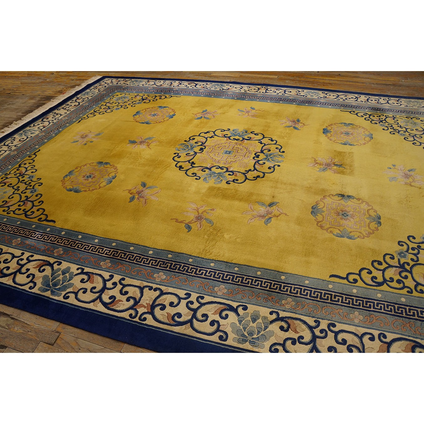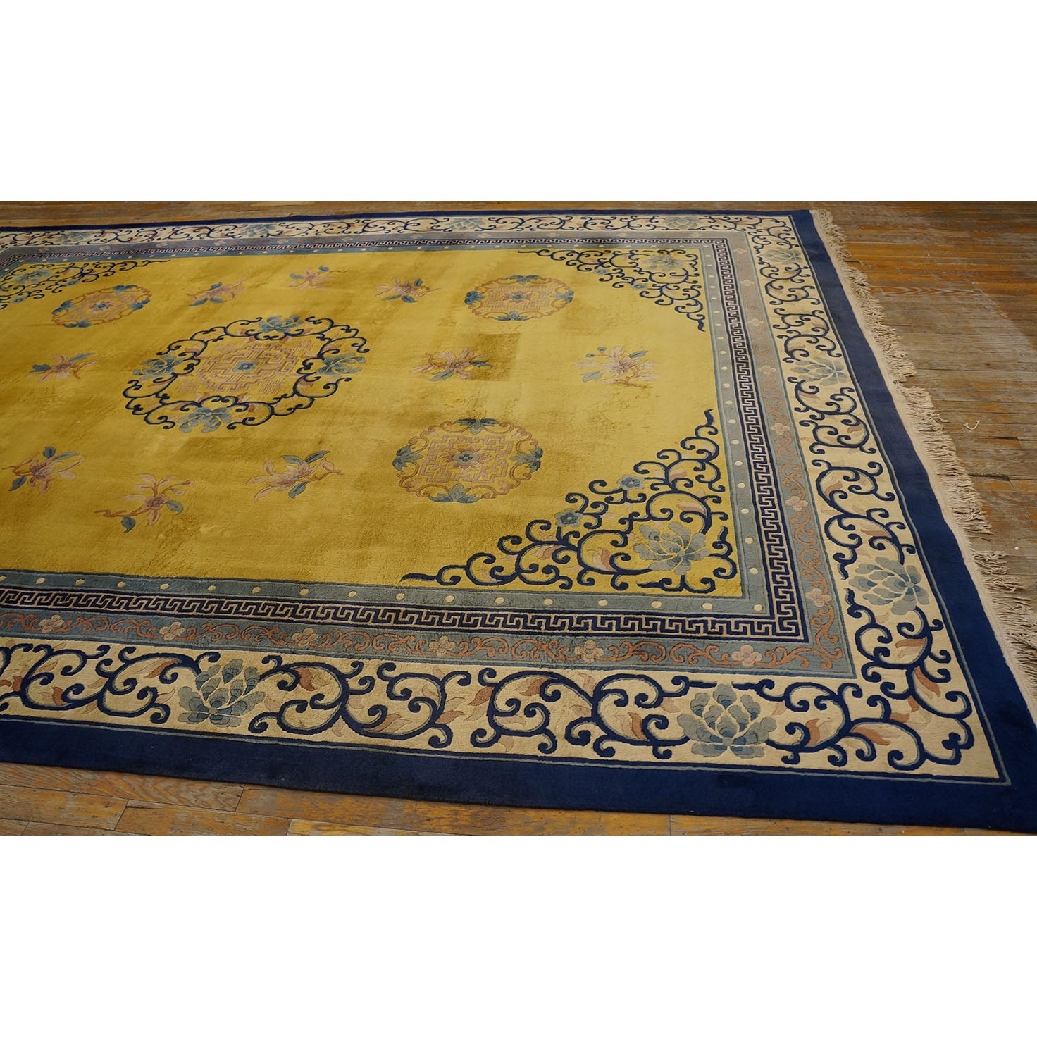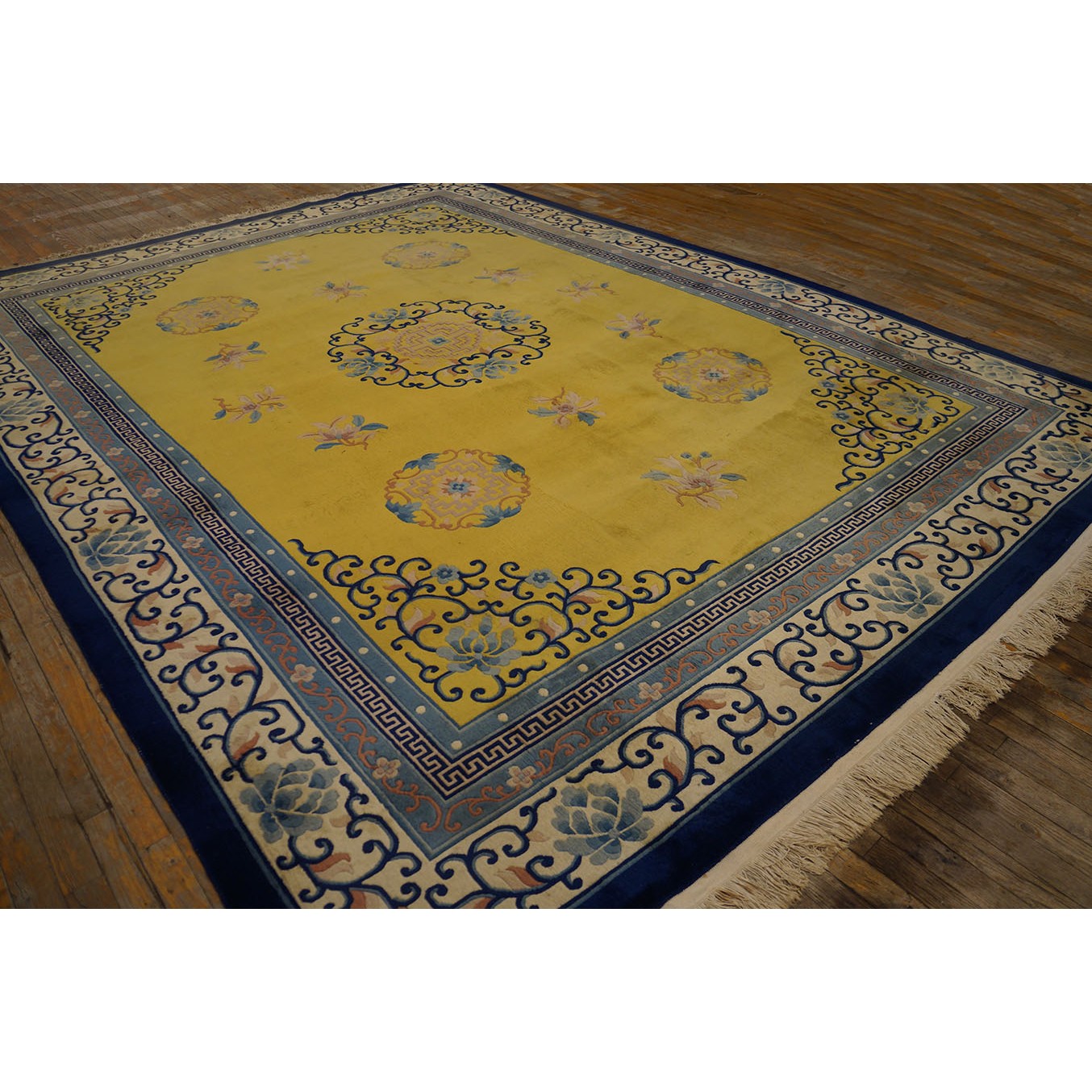 DescriptionChineseCarpets made in China proper. See entries Ningshia, Peking, Art Deco. Chinese - PekingThe commercial Peking carpet is a later 19th century development, begun by importing weaves from Ningshia (see entry) to create and export industry aimed at Western markets. The foundation is cotton and the pile is a good quality carpet wool which takes dyes particularly well. The neat medium weave is in Persian (asymmetric) knots. Designs are strictly Chinese and the whole motif repertoire of Chinese art is employed. Blue and white is the most popular color combination and red is particularly rare. Sizes tend to 9 x 12 and larger, and few small pieces appear. For a short time in the early 1920s Persian designs were woven to capitalize on the death of new Iranian goods. The industry decimated by the Communist Revolution relocated to the Pearl River area. There is a good supply of antique carpets at reasonable prices. | |