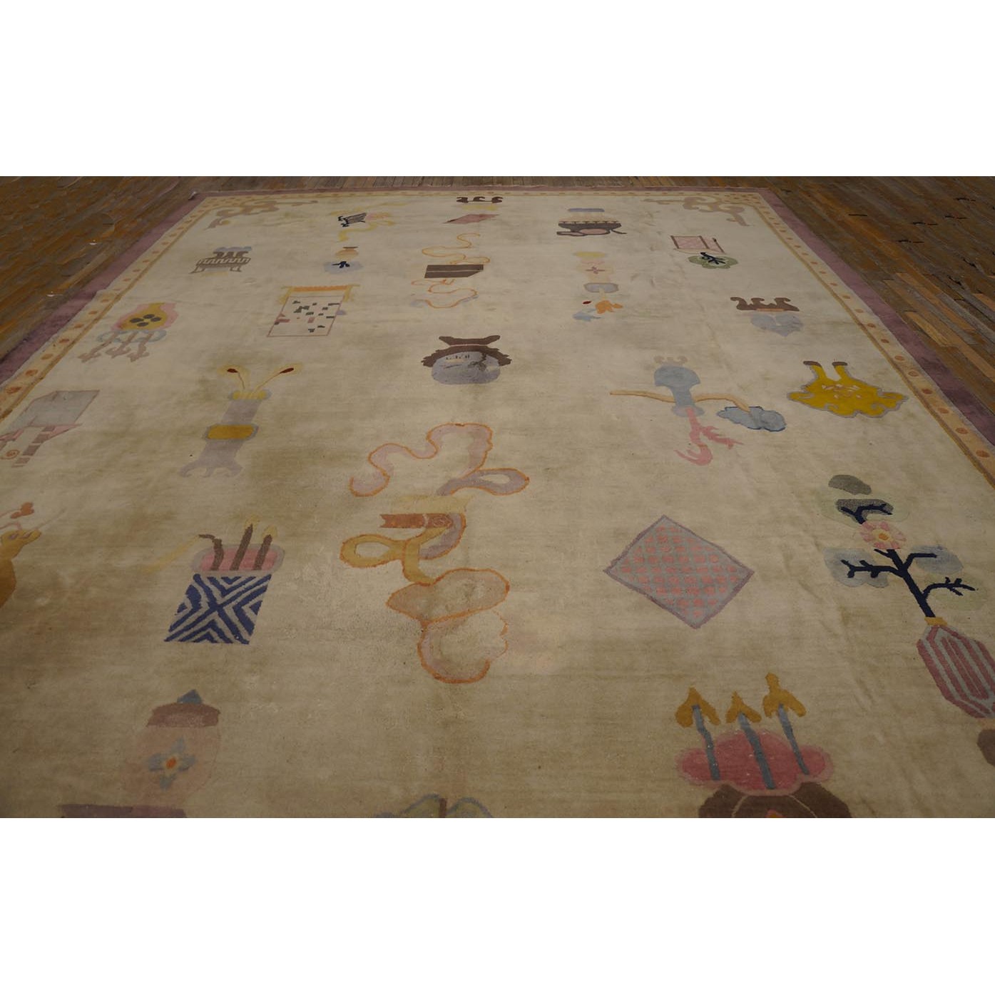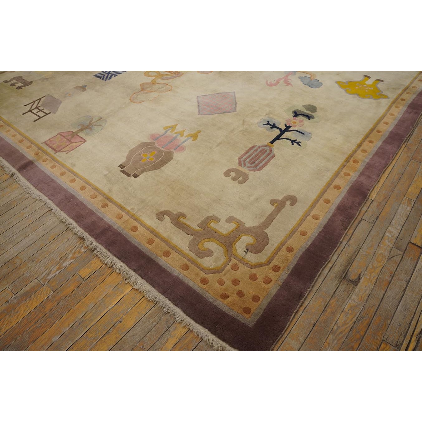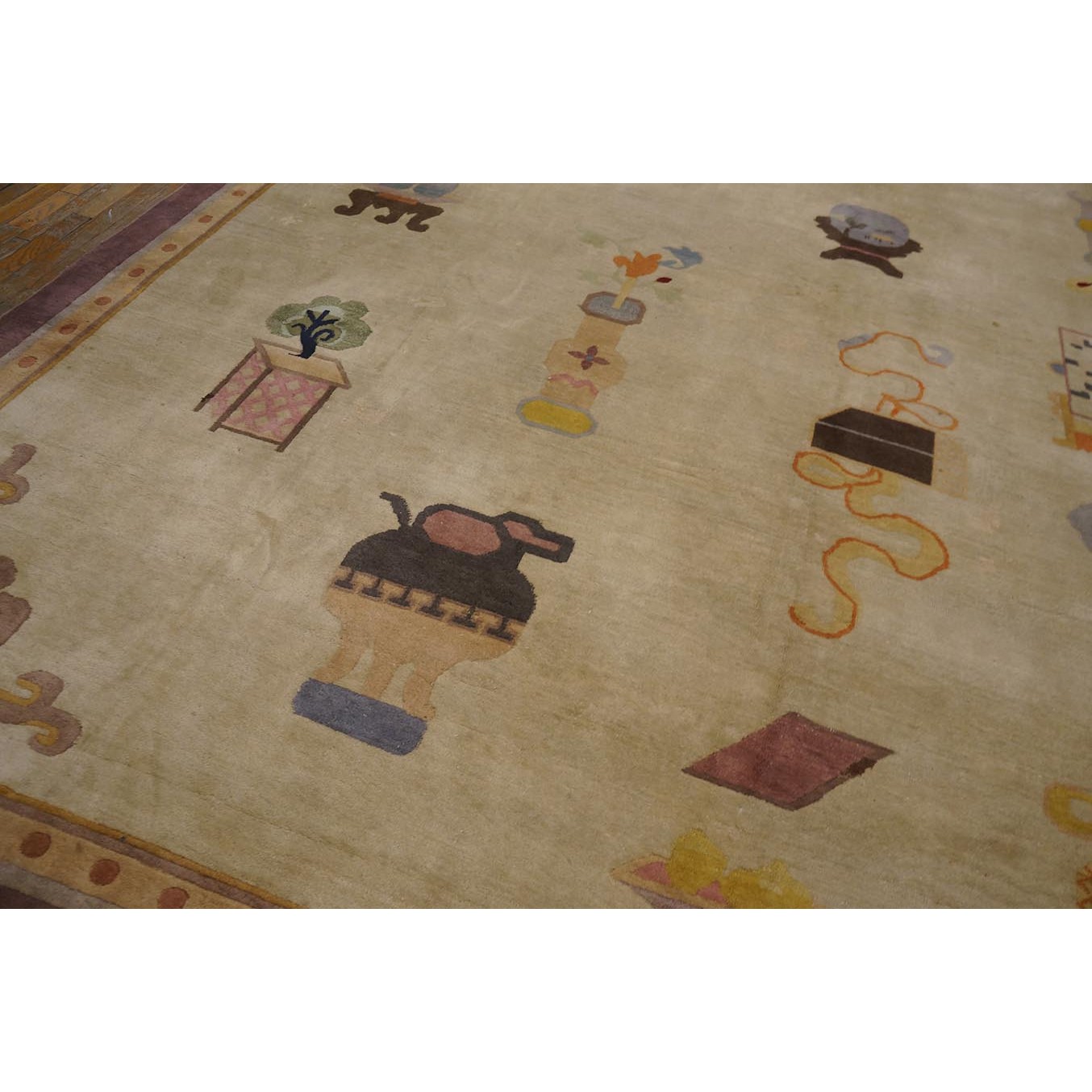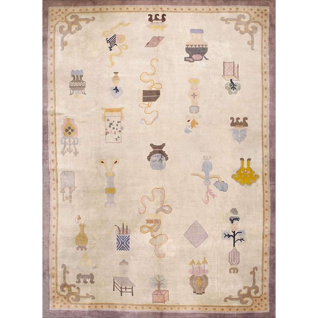 DescriptionChineseCarpets made in China proper. See entries Ningshia, Peking, Art Deco. Chinese - PekingThe commercial Peking carpet is a later 19th century development, begun by importing weaves from Ningshia (see entry) to create and export industry aimed at Western markets. The foundation is cotton and the pile is a good quality carpet wool which takes dyes particularly well. The neat medium weave is in Persian (asymmetric) knots. Designs are strictly Chinese and the whole motif repertoire of Chinese art is employed. Blue and white is the most popular color combination and red is particularly rare. Sizes tend to 9 x 12 and larger, and few small pieces appear. For a short time in the early 1920s Persian designs were woven to capitalize on the death of new Iranian goods. The industry decimated by the Communist Revolution relocated to the Pearl River area. There is a good supply of antique carpets at reasonable prices. | |