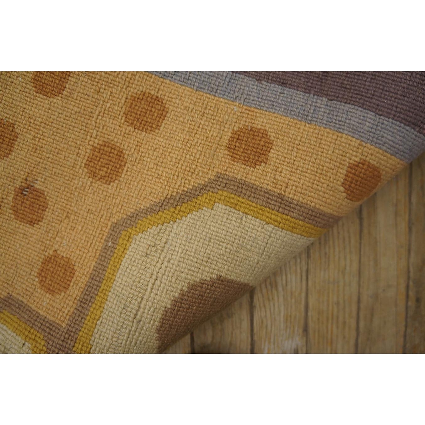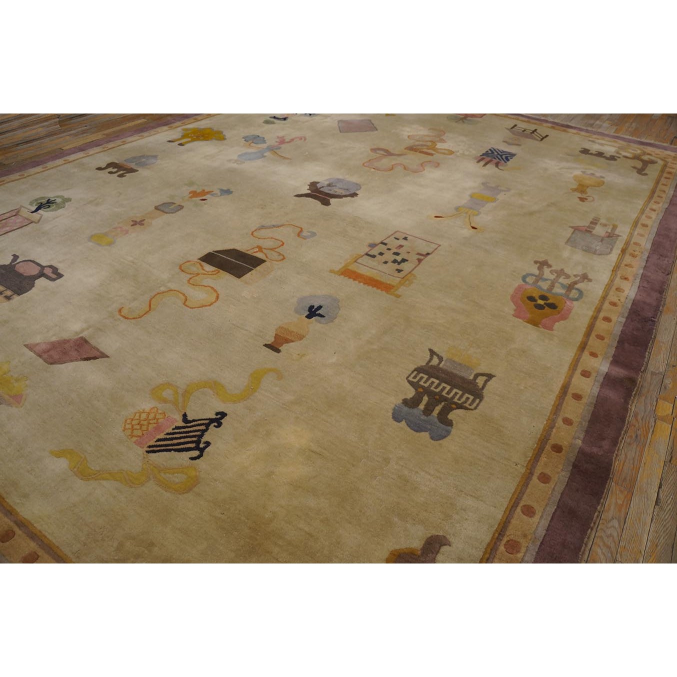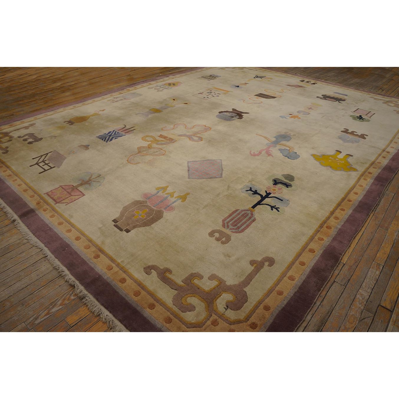 DescriptionChineseCarpets made in China proper. See entries Ningshia, Peking, Art Deco. Chinese - PekingThe commercial Peking carpet is a later 19th century development, begun by importing weaves from Ningshia (see entry) to create and export industry aimed at Western markets. The foundation is cotton and the pile is a good quality carpet wool which takes dyes particularly well. The neat medium weave is in Persian (asymmetric) knots. Designs are strictly Chinese and the whole motif repertoire of Chinese art is employed. Blue and white is the most popular color combination and red is particularly rare. Sizes tend to 9 x 12 and larger, and few small pieces appear. For a short time in the early 1920s Persian designs were woven to capitalize on the death of new Iranian goods. The industry decimated by the Communist Revolution relocated to the Pearl River area. There is a good supply of antique carpets at reasonable prices. | |