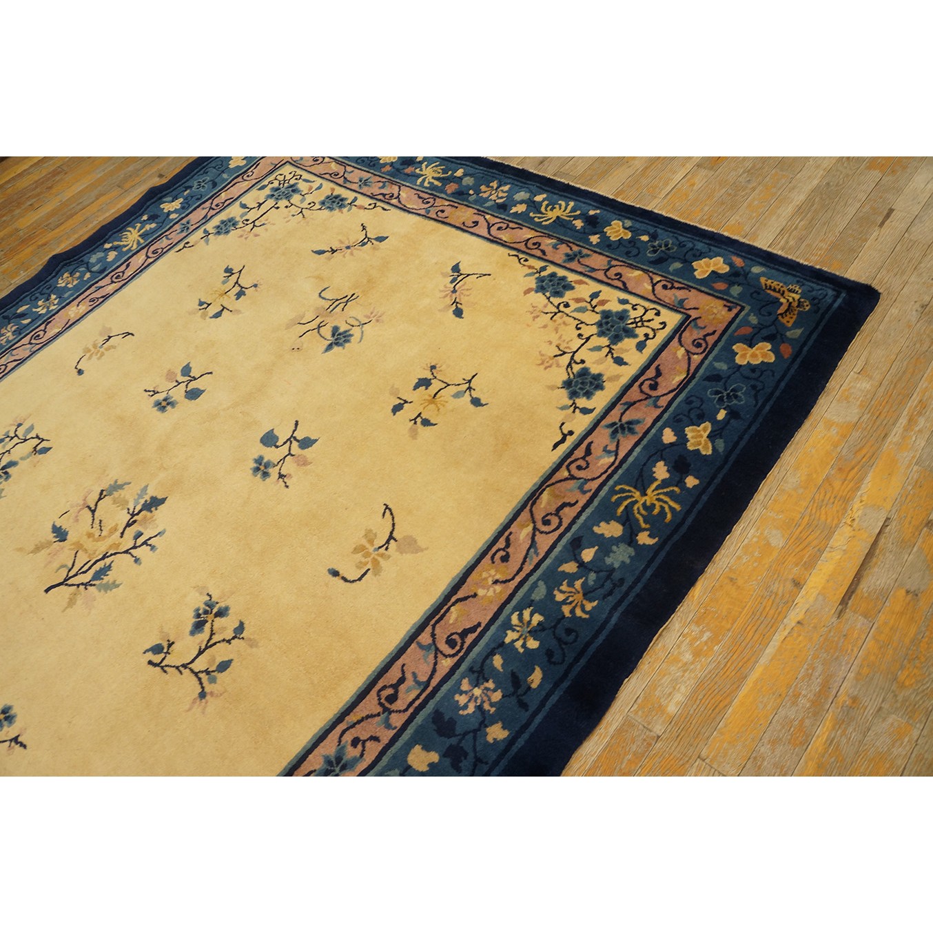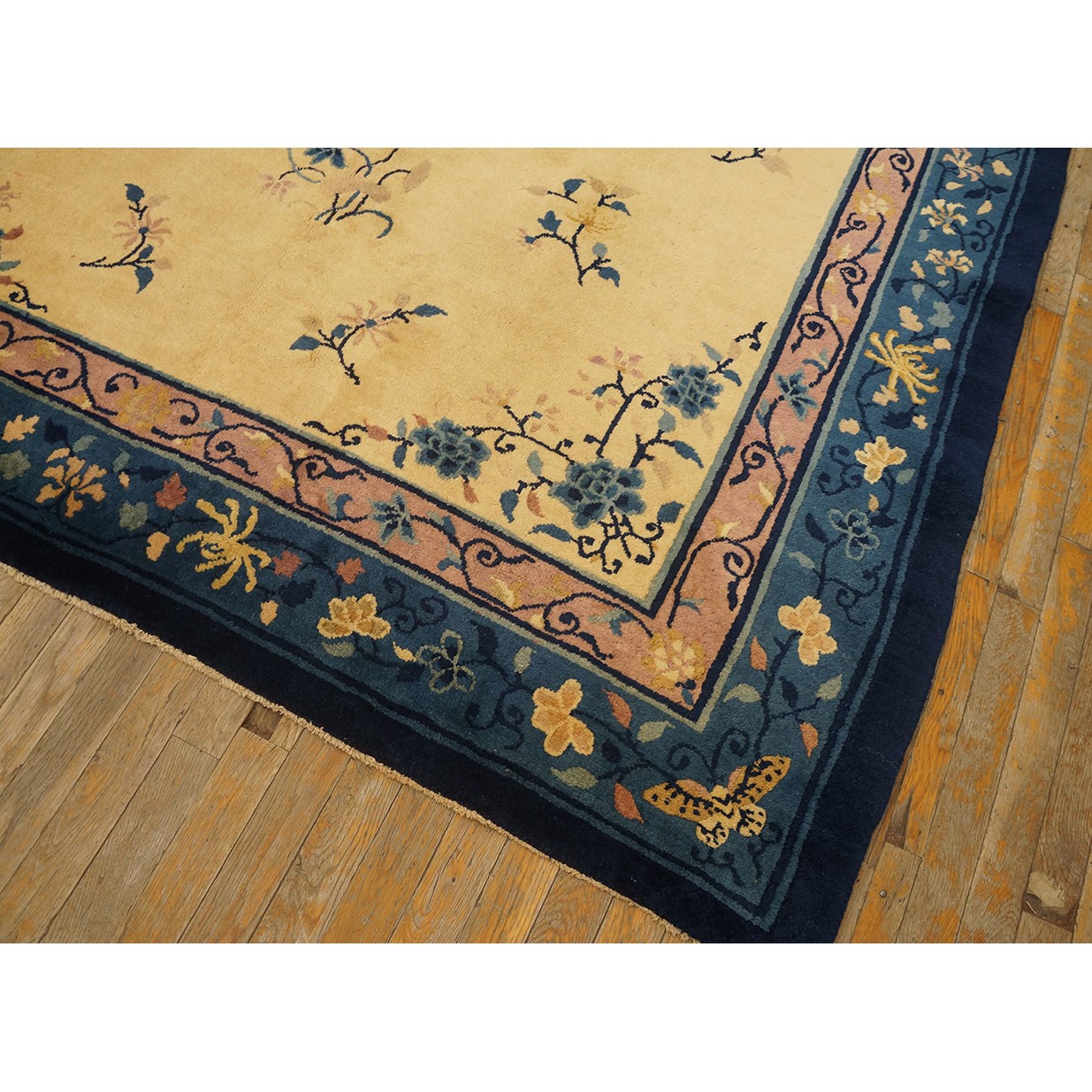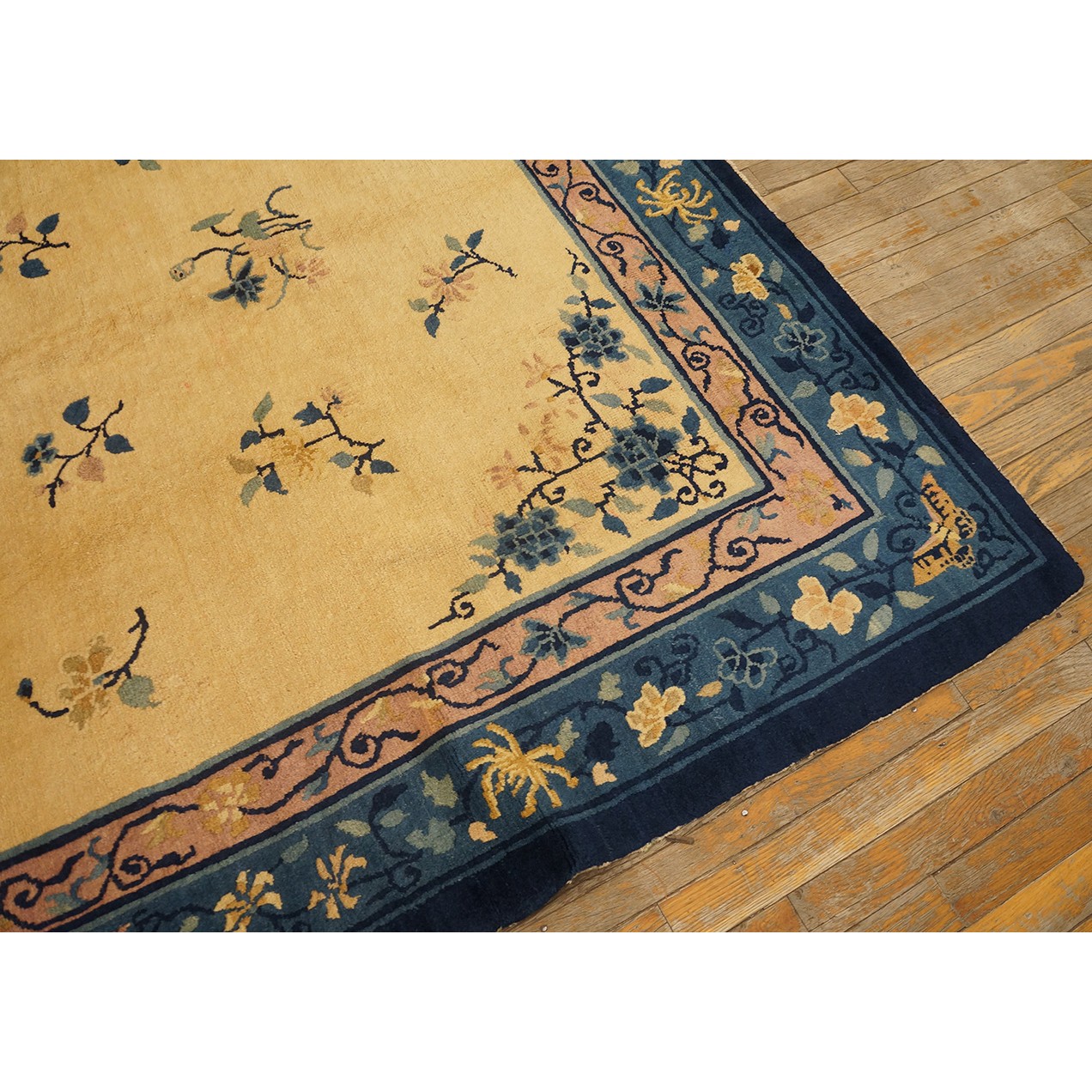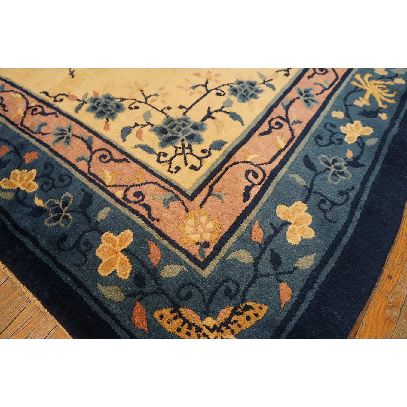 DescriptionChineseCarpets made in China proper. See entries Ningshia, Peking, Art Deco. Chinese - PekingThe commercial Peking carpet is a later 19th century development, begun by importing weaves from Ningshia (see entry) to create and export industry aimed at Western markets. The foundation is cotton and the pile is a good quality carpet wool which takes dyes particularly well. The neat medium weave is in Persian (asymmetric) knots. Designs are strictly Chinese and the whole motif repertoire of Chinese art is employed. Blue and white is the most popular color combination and red is particularly rare. Sizes tend to 9 x 12 and larger, and few small pieces appear. For a short time in the early 1920s Persian designs were woven to capitalize on the death of new Iranian goods. The industry decimated by the Communist Revolution relocated to the Pearl River area. There is a good supply of antique carpets at reasonable prices. | |