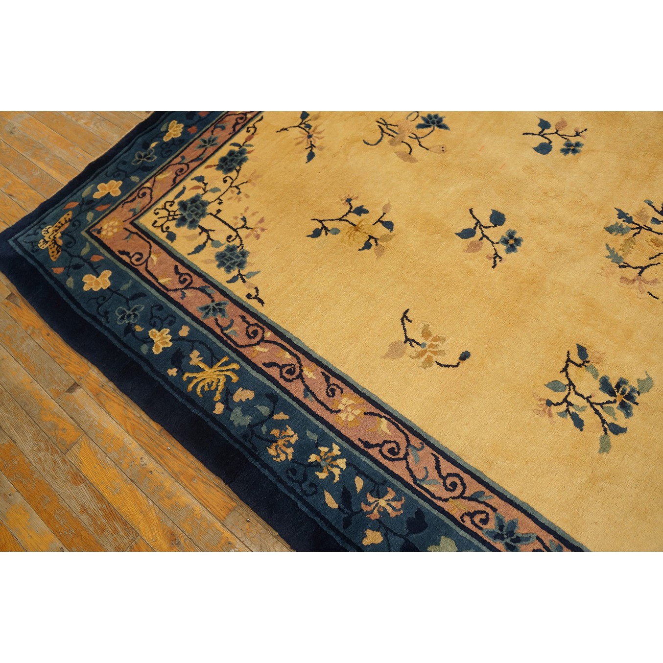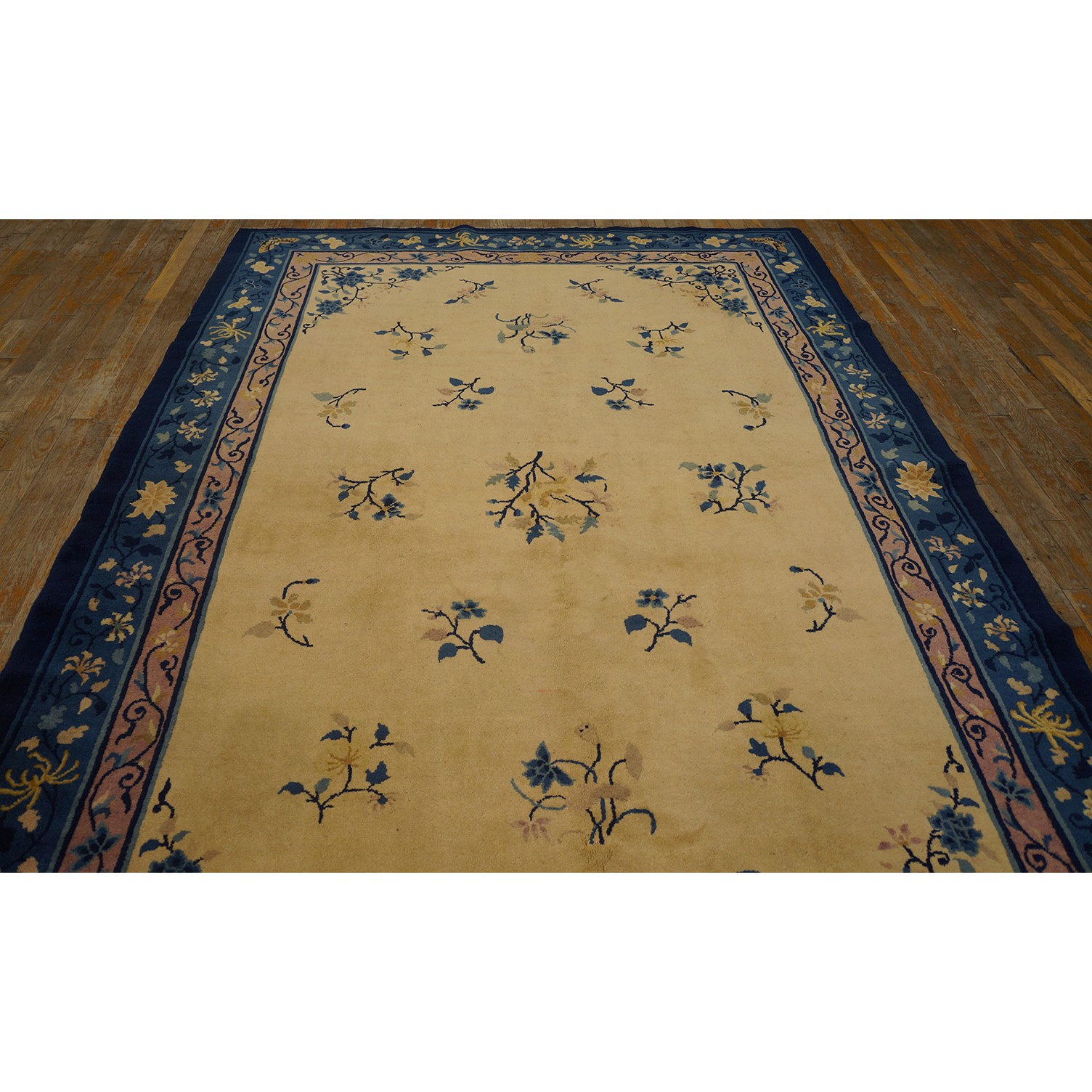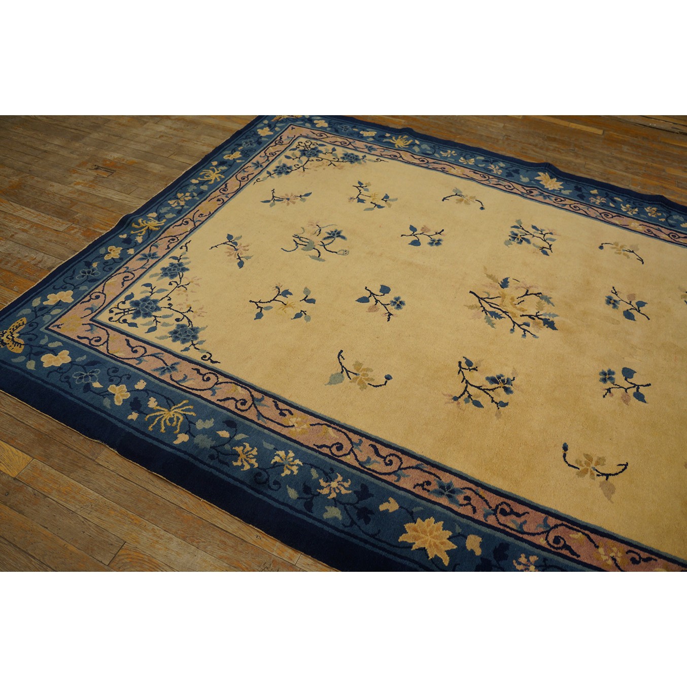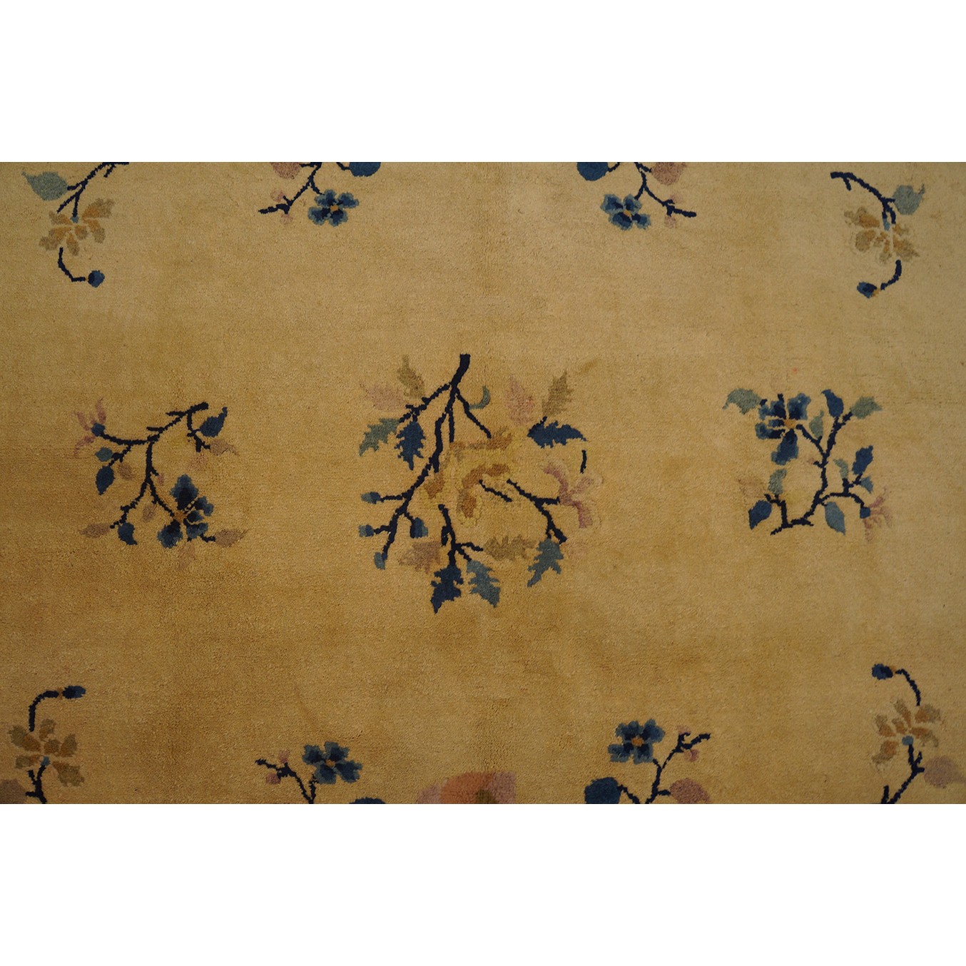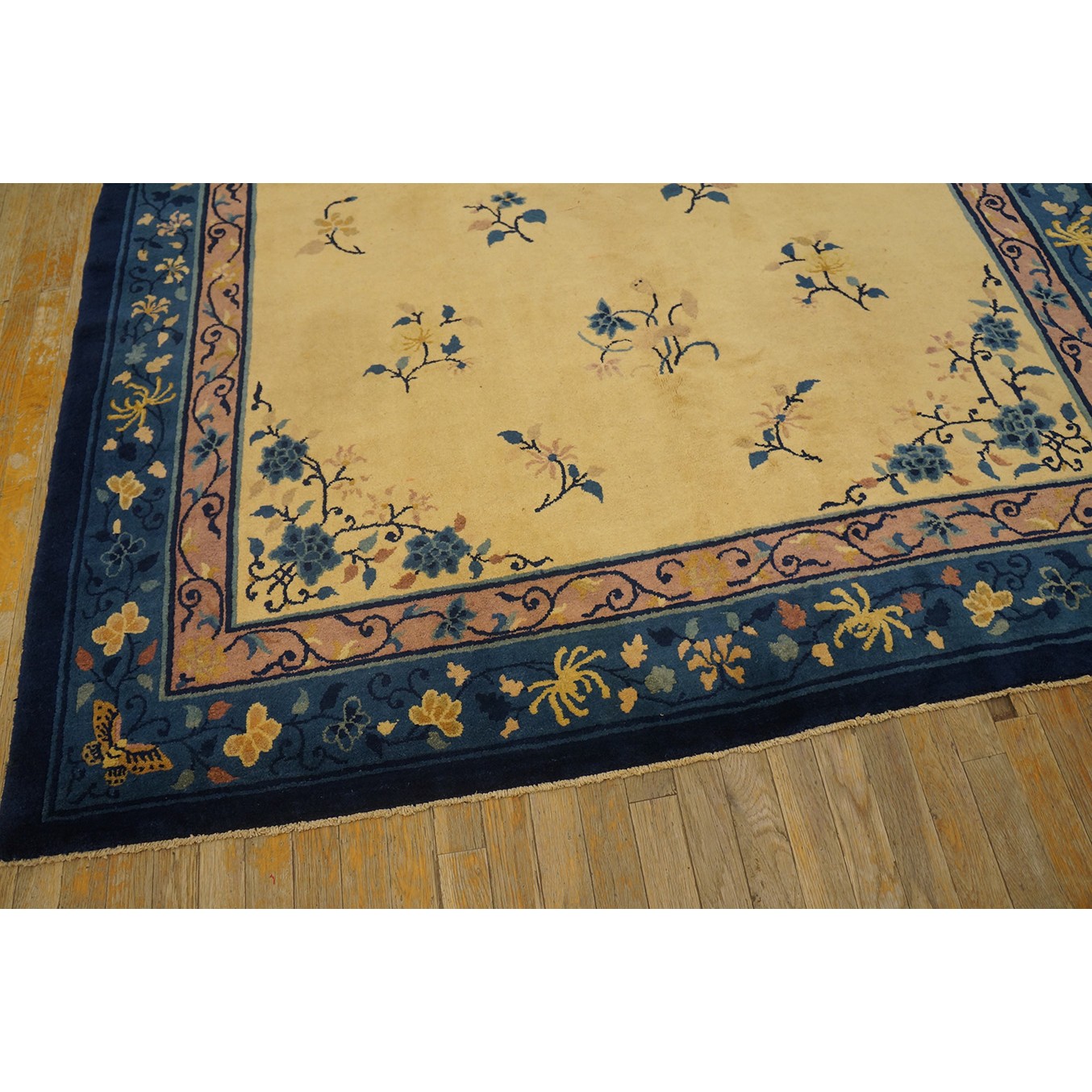 DescriptionChineseCarpets made in China proper. See entries Ningshia, Peking, Art Deco. Chinese - PekingThe commercial Peking carpet is a later 19th century development, begun by importing weaves from Ningshia (see entry) to create and export industry aimed at Western markets. The foundation is cotton and the pile is a good quality carpet wool which takes dyes particularly well. The neat medium weave is in Persian (asymmetric) knots. Designs are strictly Chinese and the whole motif repertoire of Chinese art is employed. Blue and white is the most popular color combination and red is particularly rare. Sizes tend to 9 x 12 and larger, and few small pieces appear. For a short time in the early 1920s Persian designs were woven to capitalize on the death of new Iranian goods. The industry decimated by the Communist Revolution relocated to the Pearl River area. There is a good supply of antique carpets at reasonable prices. | |