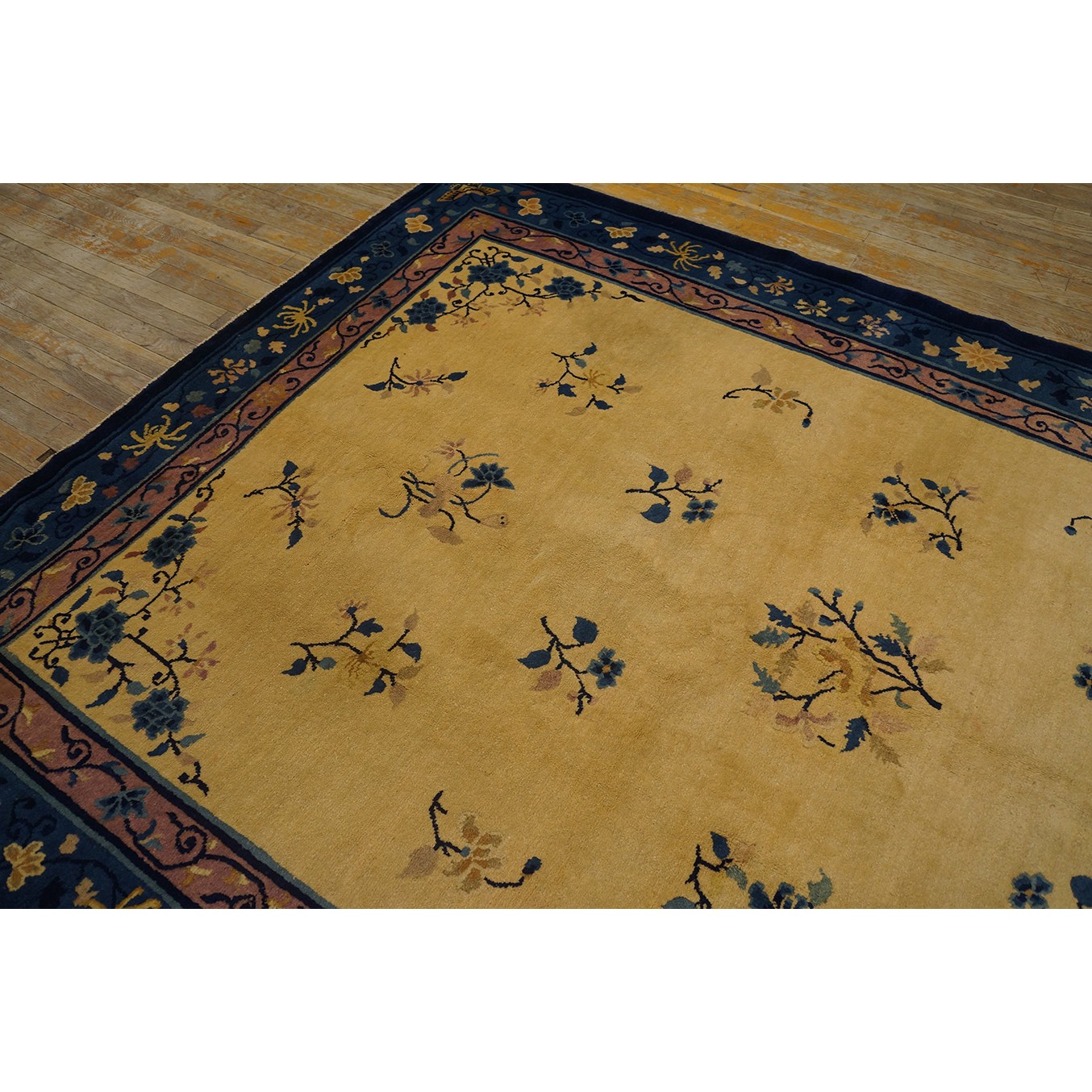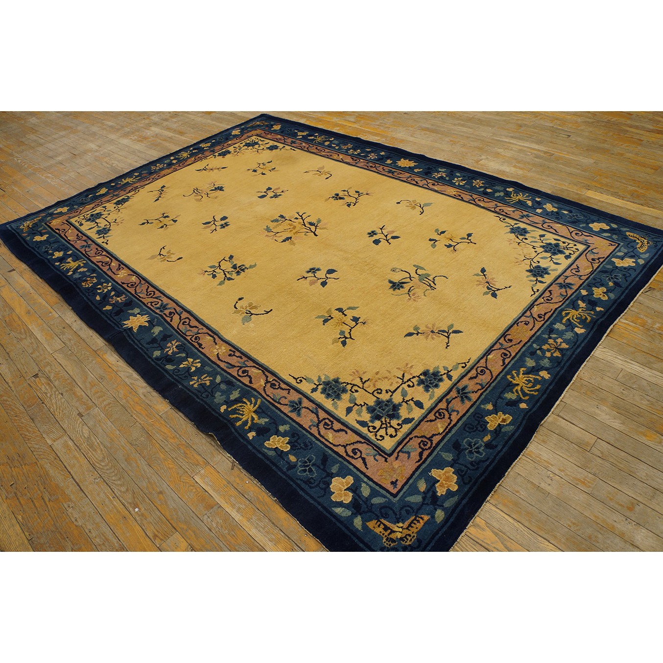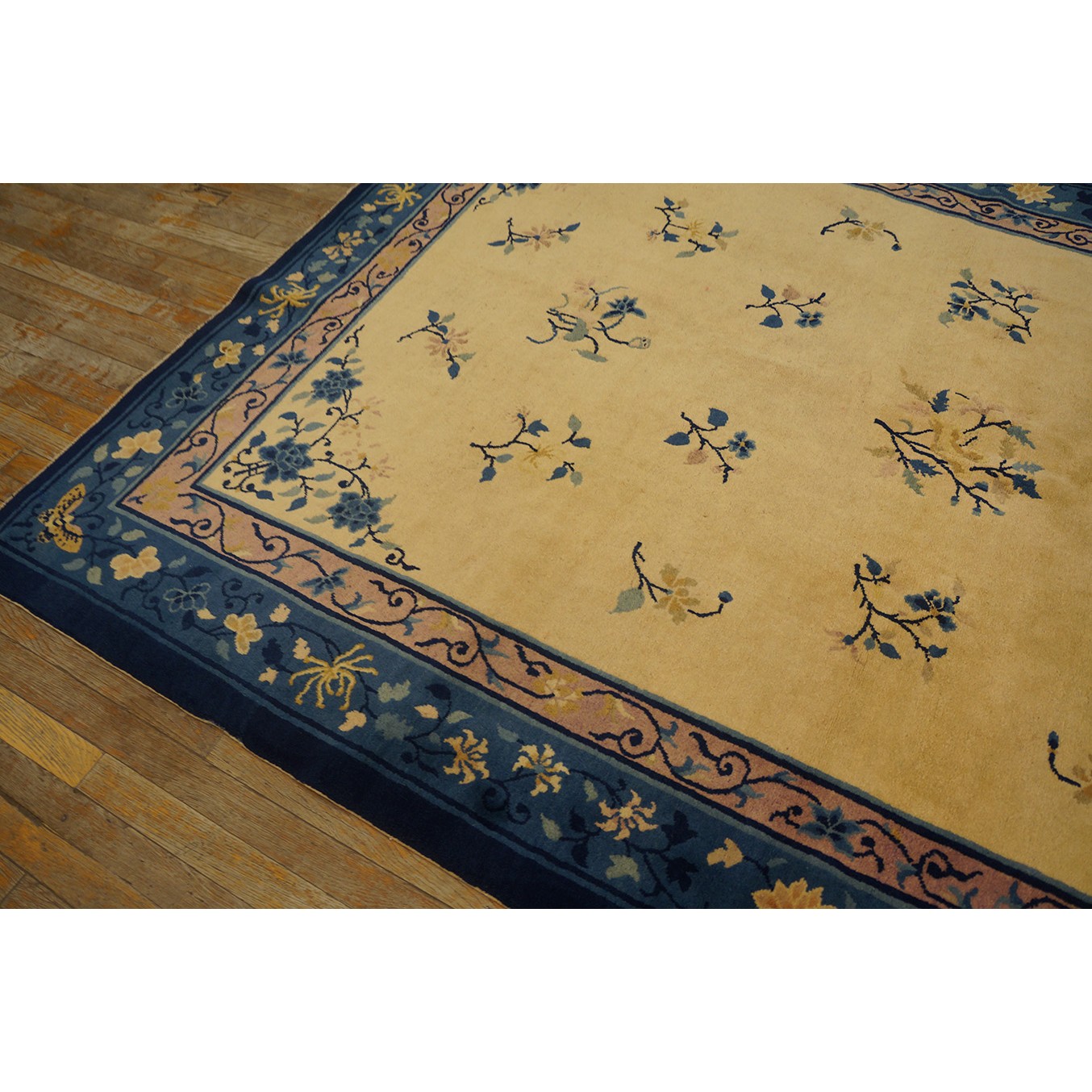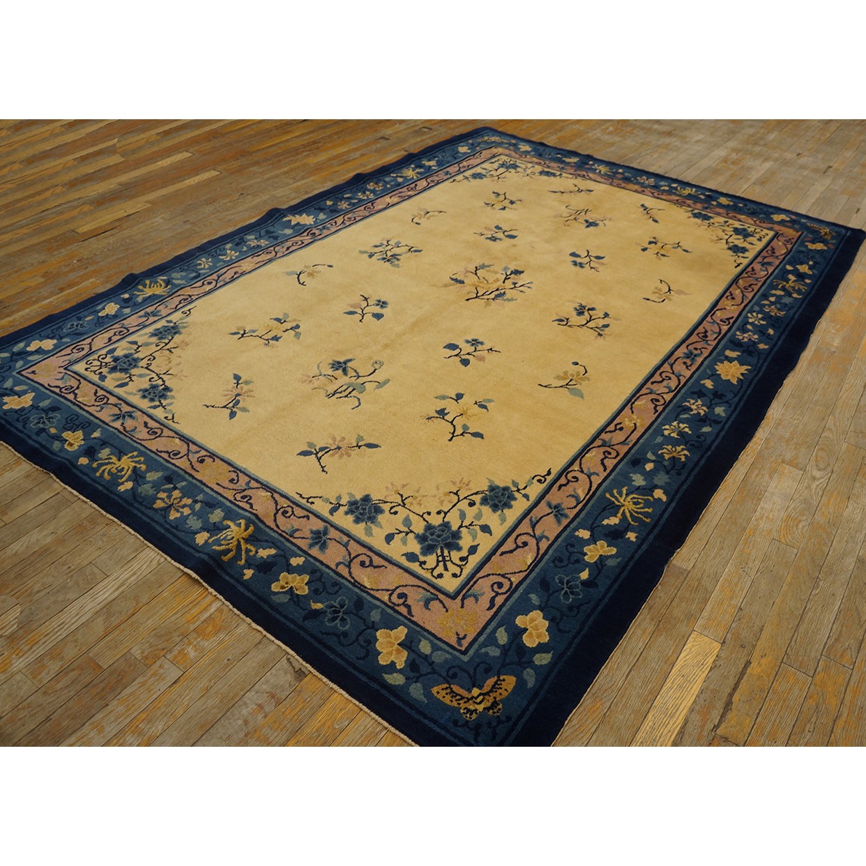 DescriptionChineseCarpets made in China proper. See entries Ningshia, Peking, Art Deco. Chinese - PekingThe commercial Peking carpet is a later 19th century development, begun by importing weaves from Ningshia (see entry) to create and export industry aimed at Western markets. The foundation is cotton and the pile is a good quality carpet wool which takes dyes particularly well. The neat medium weave is in Persian (asymmetric) knots. Designs are strictly Chinese and the whole motif repertoire of Chinese art is employed. Blue and white is the most popular color combination and red is particularly rare. Sizes tend to 9 x 12 and larger, and few small pieces appear. For a short time in the early 1920s Persian designs were woven to capitalize on the death of new Iranian goods. The industry decimated by the Communist Revolution relocated to the Pearl River area. There is a good supply of antique carpets at reasonable prices. | |
