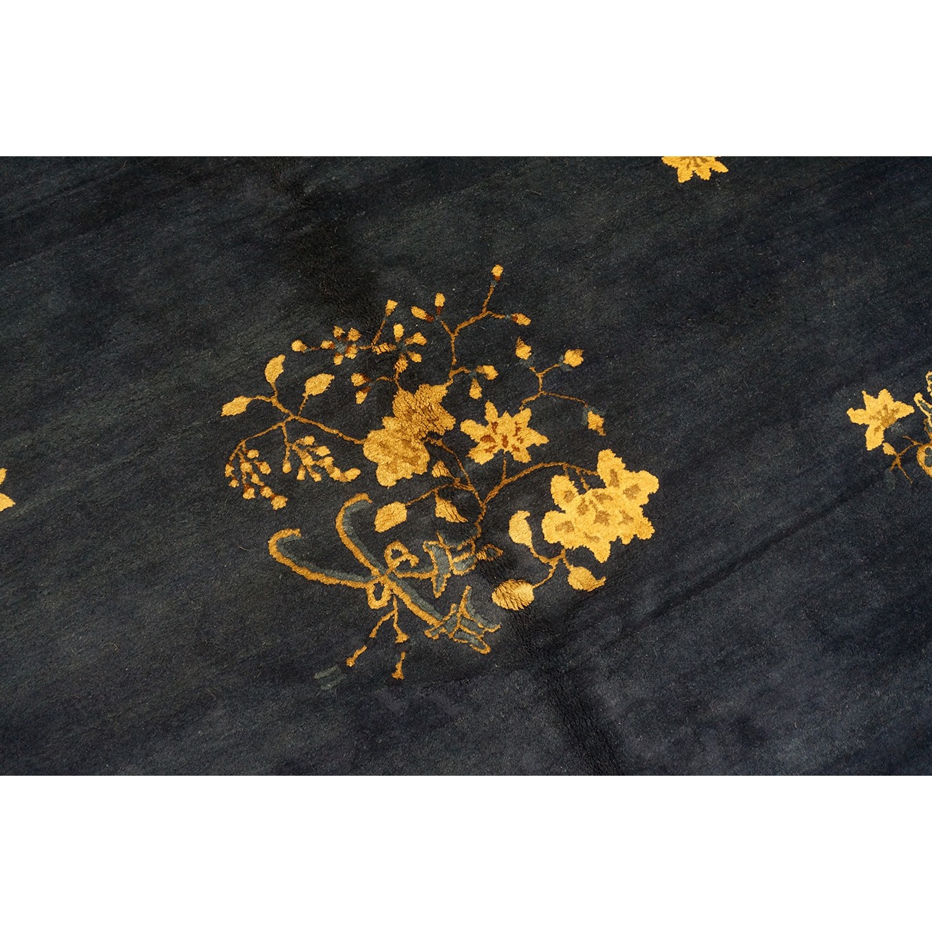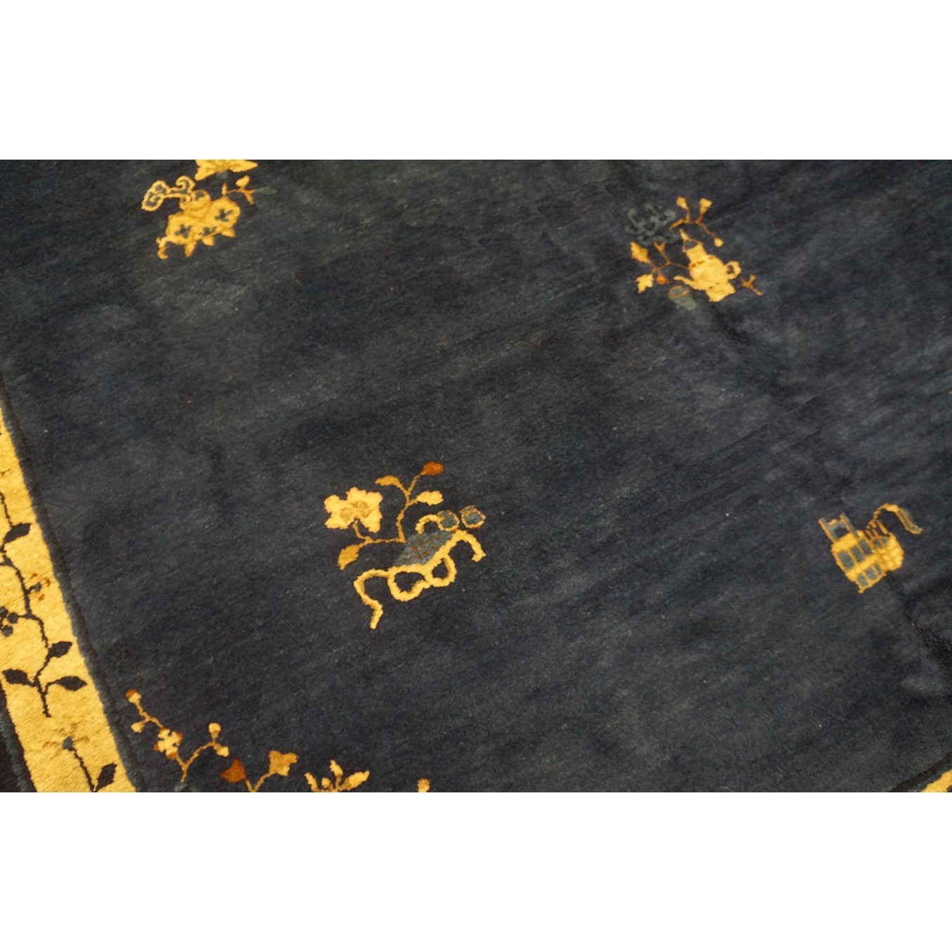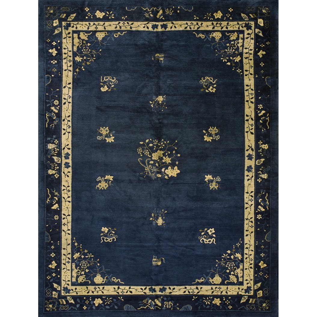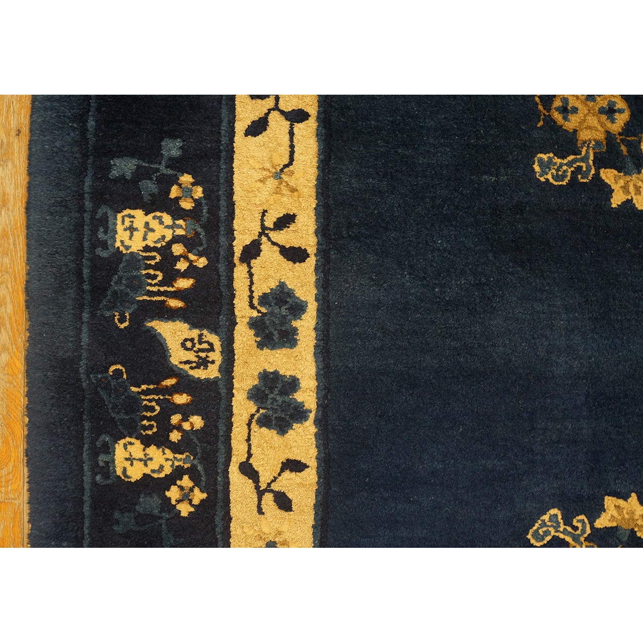 DescriptionChineseCarpets made in China proper. See entries Ningshia, Peking, Art Deco. Chinese - PekingThe commercial Peking carpet is a later 19th century development, begun by importing weaves from Ningshia (see entry) to create and export industry aimed at Western markets. The foundation is cotton and the pile is a good quality carpet wool which takes dyes particularly well. The neat medium weave is in Persian (asymmetric) knots. Designs are strictly Chinese and the whole motif repertoire of Chinese art is employed. Blue and white is the most popular color combination and red is particularly rare. Sizes tend to 9 x 12 and larger, and few small pieces appear. For a short time in the early 1920s Persian designs were woven to capitalize on the death of new Iranian goods. The industry decimated by the Communist Revolution relocated to the Pearl River area. There is a good supply of antique carpets at reasonable prices. | |