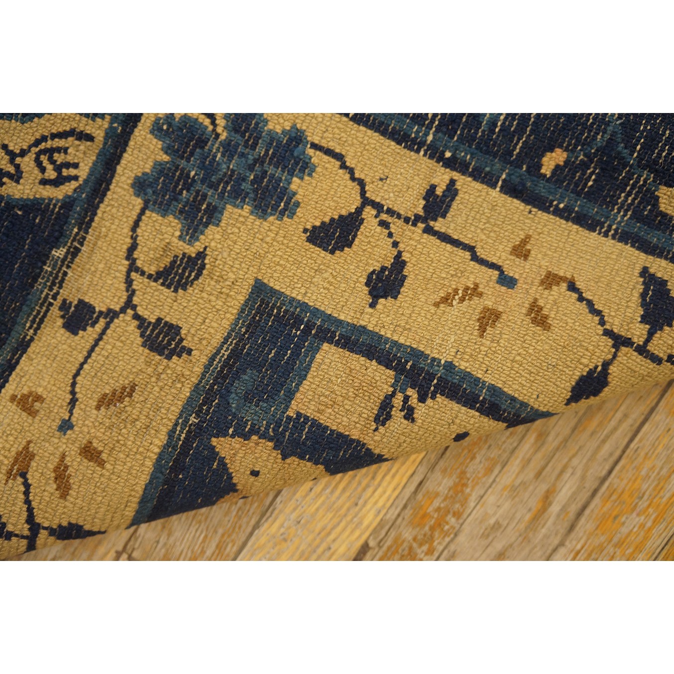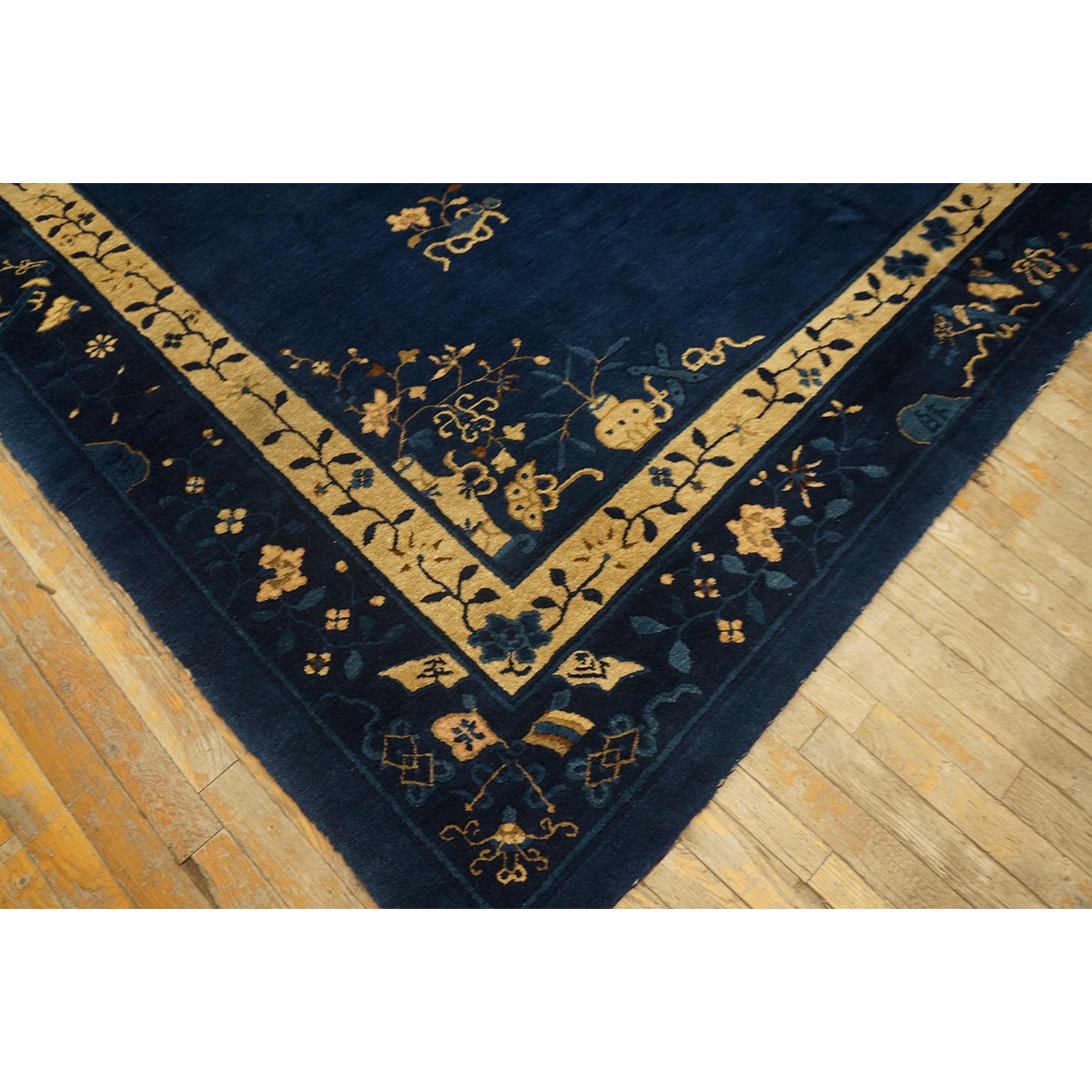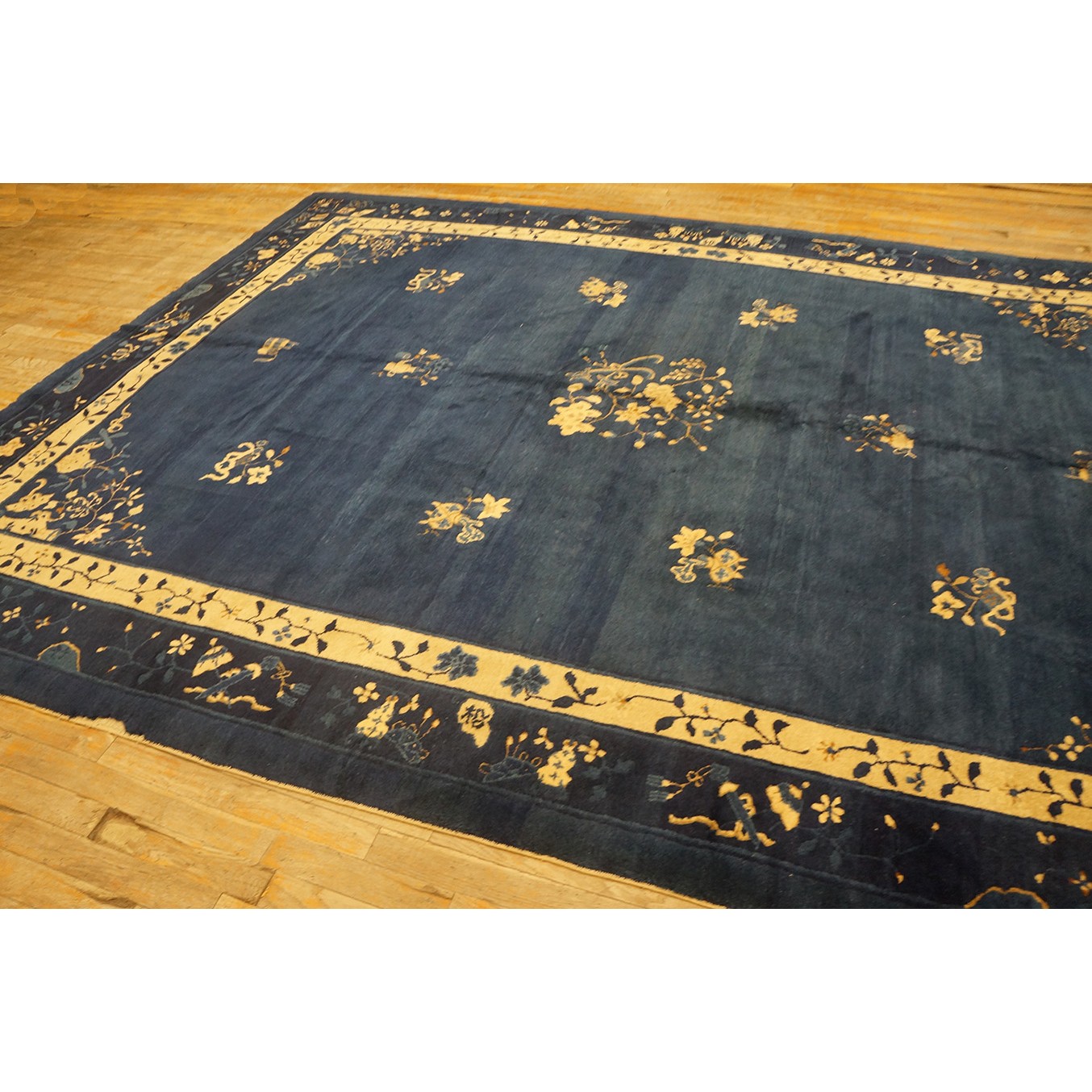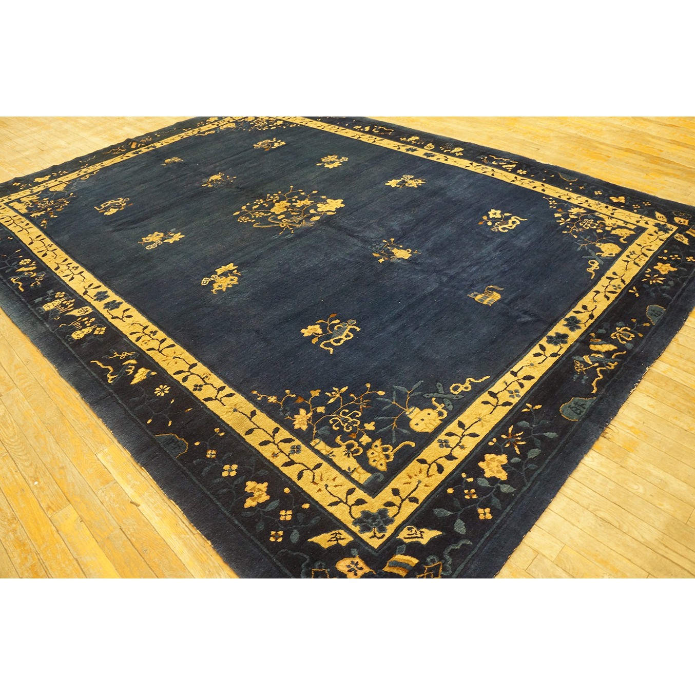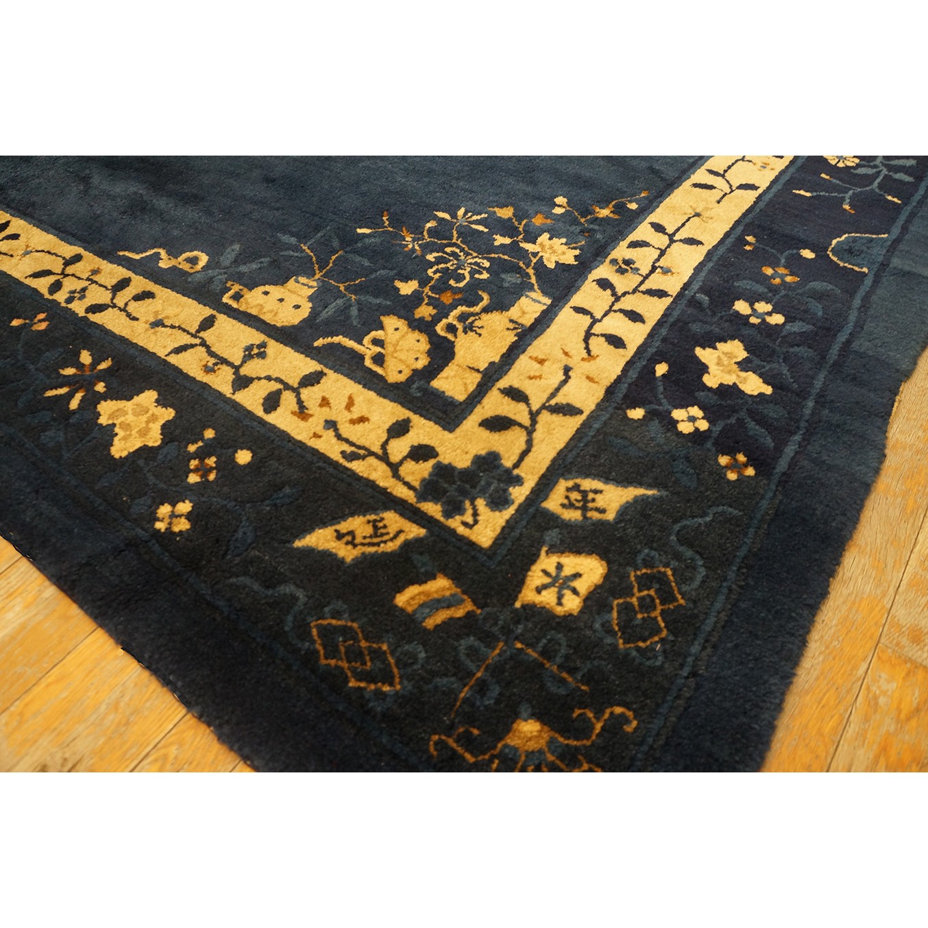 DescriptionChineseCarpets made in China proper. See entries Ningshia, Peking, Art Deco. Chinese - PekingThe commercial Peking carpet is a later 19th century development, begun by importing weaves from Ningshia (see entry) to create and export industry aimed at Western markets. The foundation is cotton and the pile is a good quality carpet wool which takes dyes particularly well. The neat medium weave is in Persian (asymmetric) knots. Designs are strictly Chinese and the whole motif repertoire of Chinese art is employed. Blue and white is the most popular color combination and red is particularly rare. Sizes tend to 9 x 12 and larger, and few small pieces appear. For a short time in the early 1920s Persian designs were woven to capitalize on the death of new Iranian goods. The industry decimated by the Communist Revolution relocated to the Pearl River area. There is a good supply of antique carpets at reasonable prices. | |