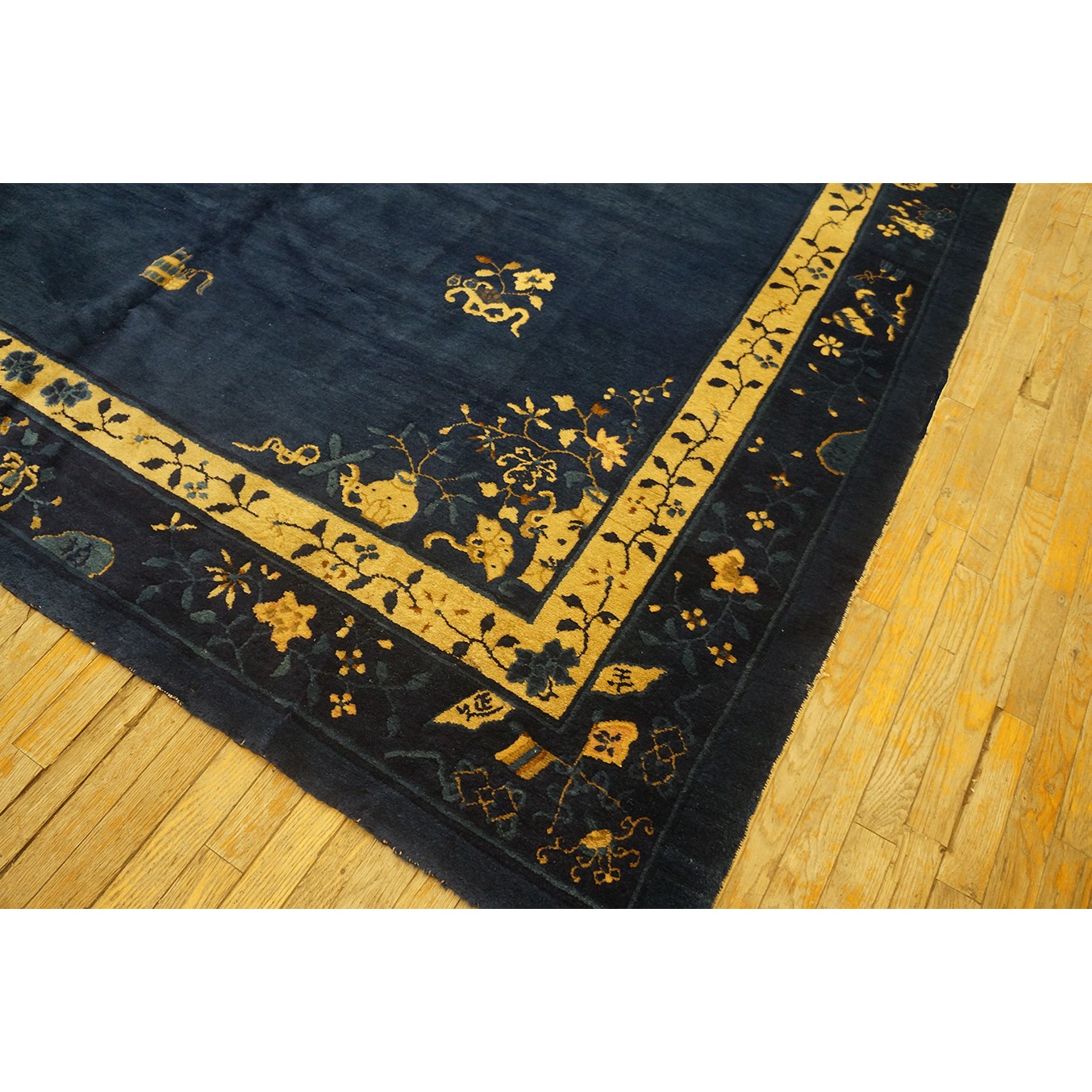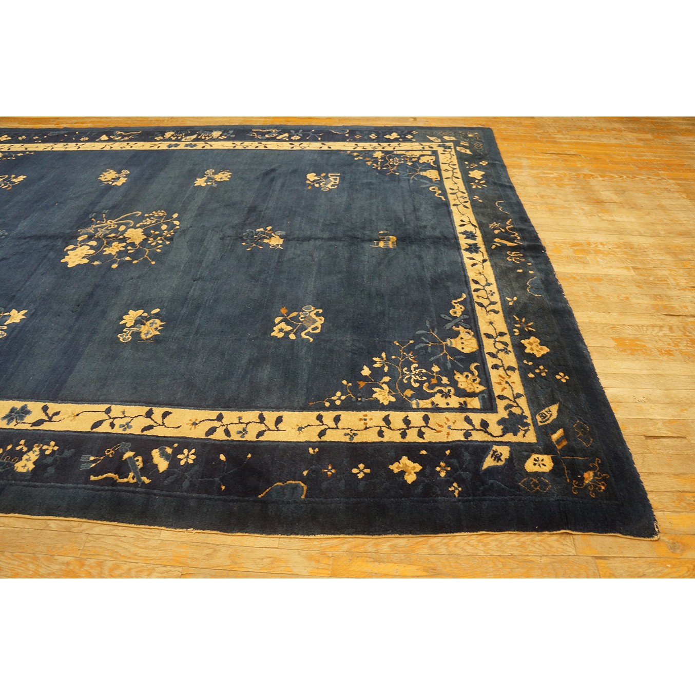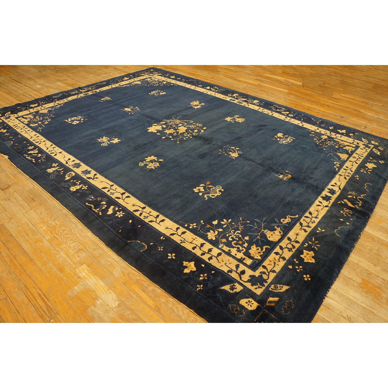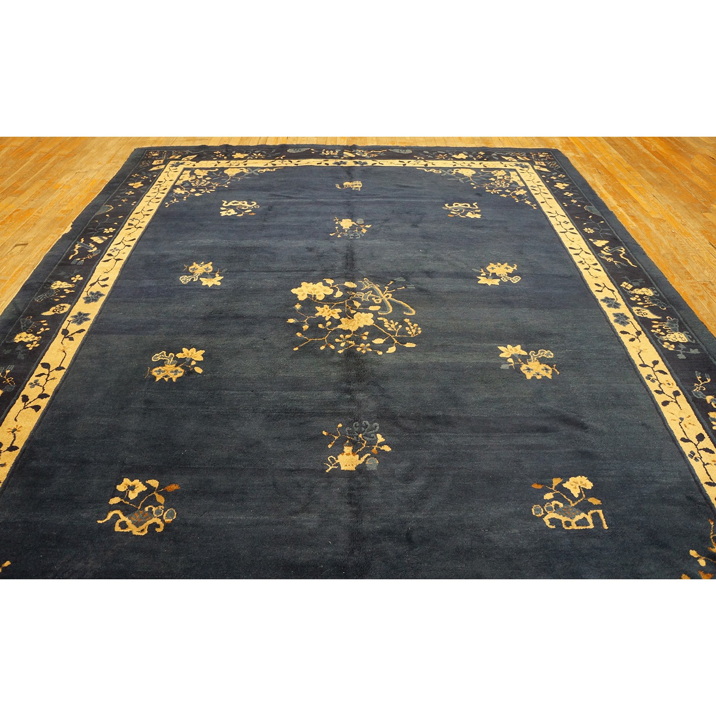 DescriptionChineseCarpets made in China proper. See entries Ningshia, Peking, Art Deco. Chinese - PekingThe commercial Peking carpet is a later 19th century development, begun by importing weaves from Ningshia (see entry) to create and export industry aimed at Western markets. The foundation is cotton and the pile is a good quality carpet wool which takes dyes particularly well. The neat medium weave is in Persian (asymmetric) knots. Designs are strictly Chinese and the whole motif repertoire of Chinese art is employed. Blue and white is the most popular color combination and red is particularly rare. Sizes tend to 9 x 12 and larger, and few small pieces appear. For a short time in the early 1920s Persian designs were woven to capitalize on the death of new Iranian goods. The industry decimated by the Communist Revolution relocated to the Pearl River area. There is a good supply of antique carpets at reasonable prices. | |