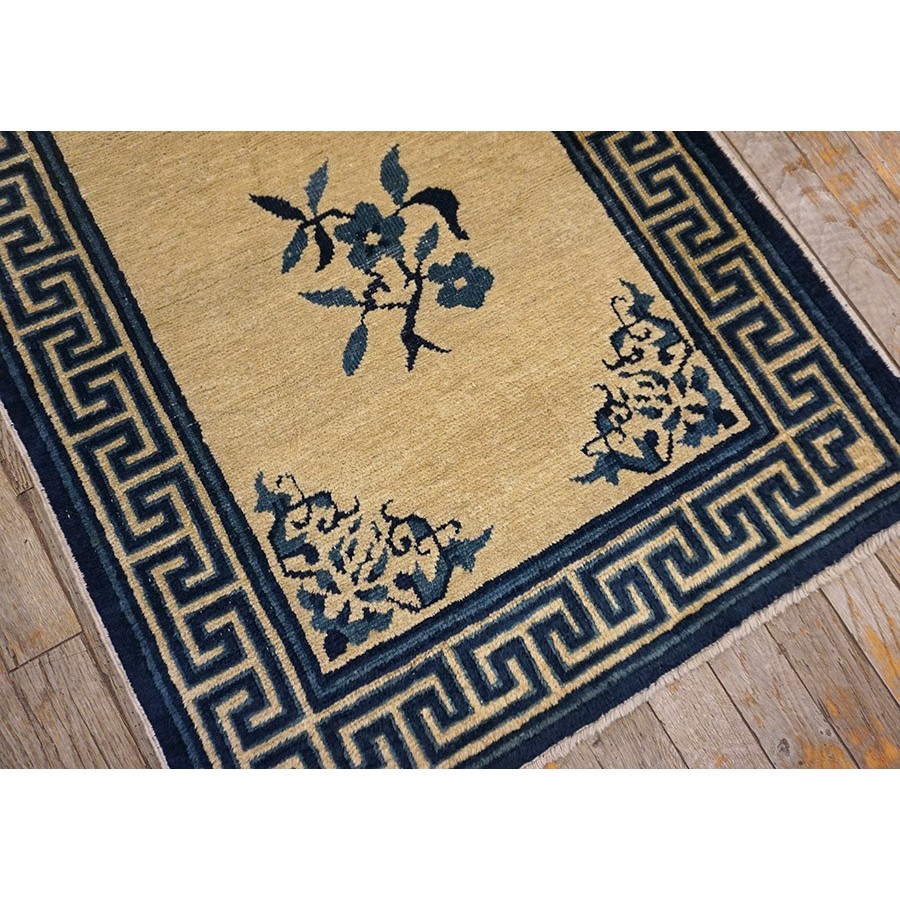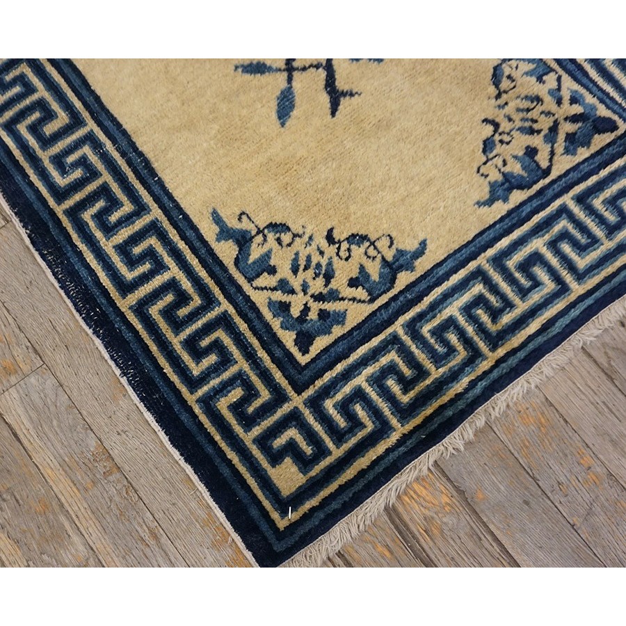 The commercial Peking carpet is a later 19th century development, begun by importing weaves from Ningshia (see entry) to create and export industry aimed at Western markets. The foundation is cotton and the pile is a good quality carpet wool which takes dyes particularly well. The neat medium weave is in Persian (asymmetric) knots. Designs are strictly Chinese and the whole motif repertoire of Chinese art is employed. Blue and white is the most popular color combination and red is particularly rare. Sizes tend to 9’ x 12’ and larger, and few small pieces appear. For a short time in the early 1920’s Persian designs were woven to capitalize on the death of new Iranian goods. The industry decimated by the Communist Revolution relocated to the Pearl River area. There is a good supply of antique carpets at reasonable prices.