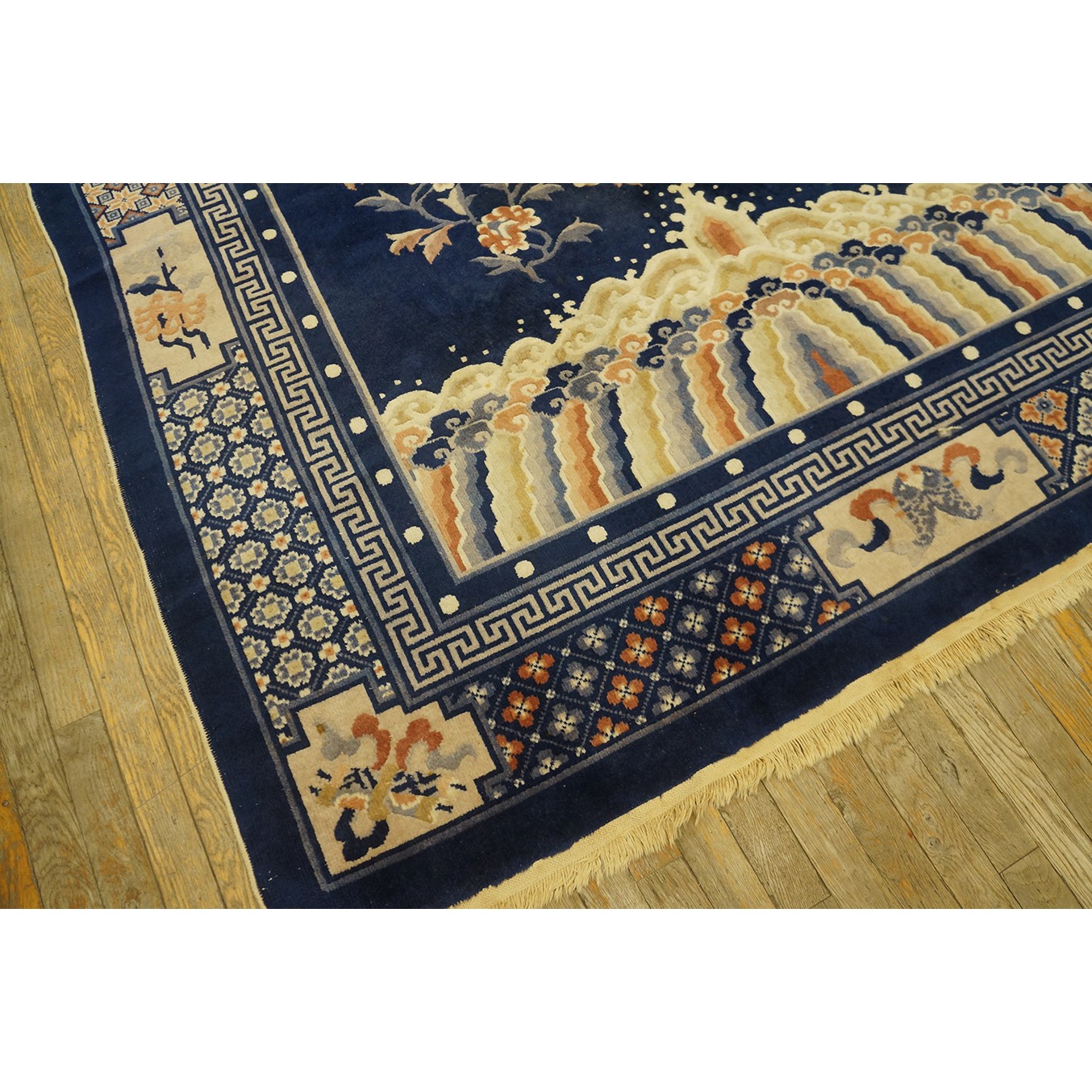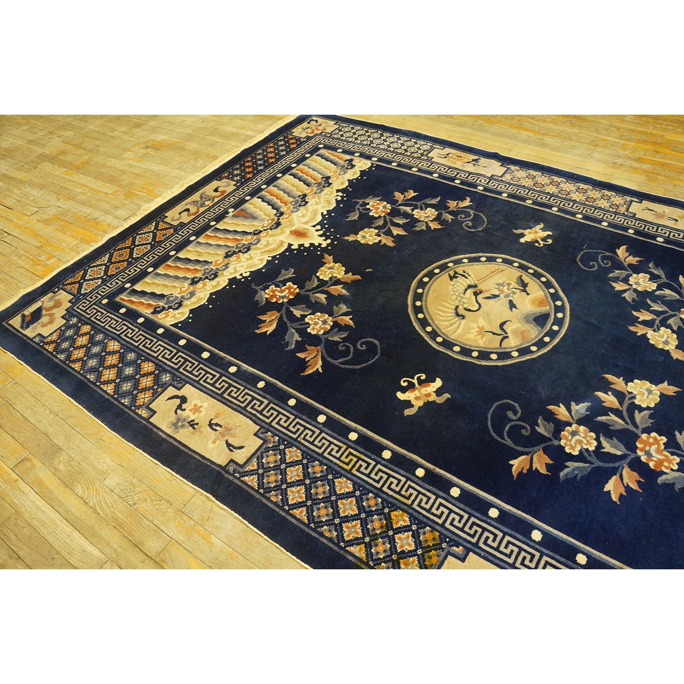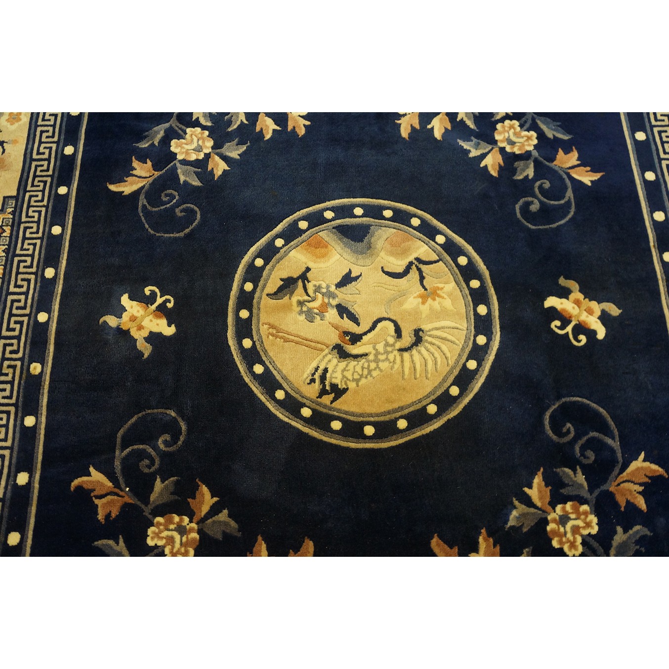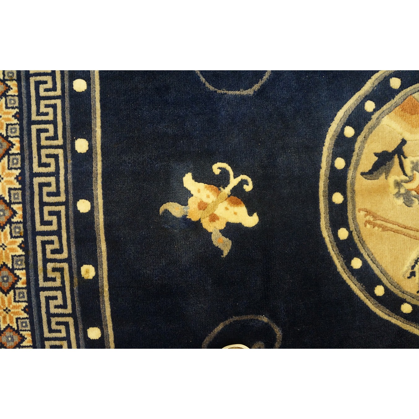 DescriptionChineseCarpets made in China proper. See entries Ningshia, Peking, Art Deco. Chinese - PekingThe commercial Peking carpet is a later 19th century development, begun by importing weaves from Ningshia (see entry) to create and export industry aimed at Western markets. The foundation is cotton and the pile is a good quality carpet wool which takes dyes particularly well. The neat medium weave is in Persian (asymmetric) knots. Designs are strictly Chinese and the whole motif repertoire of Chinese art is employed. Blue and white is the most popular color combination and red is particularly rare. Sizes tend to 9 x 12 and larger, and few small pieces appear. For a short time in the early 1920s Persian designs were woven to capitalize on the death of new Iranian goods. The industry decimated by the Communist Revolution relocated to the Pearl River area. There is a good supply of antique carpets at reasonable prices. | |