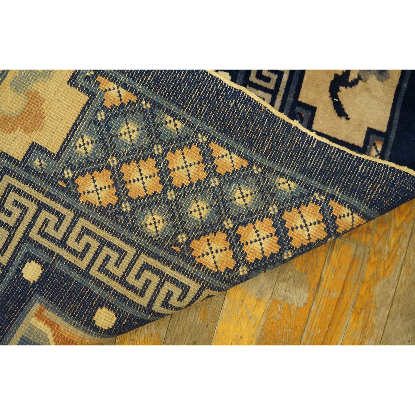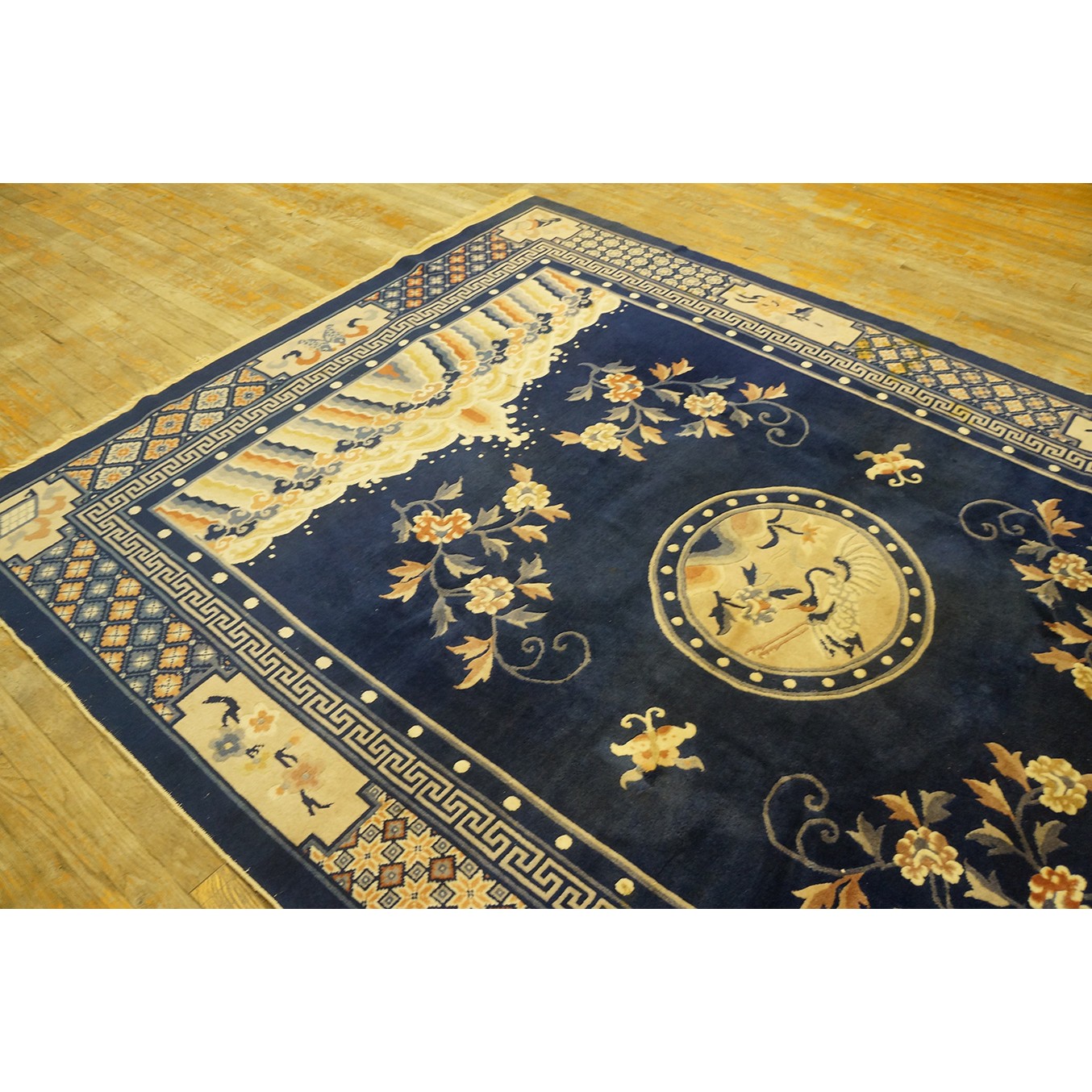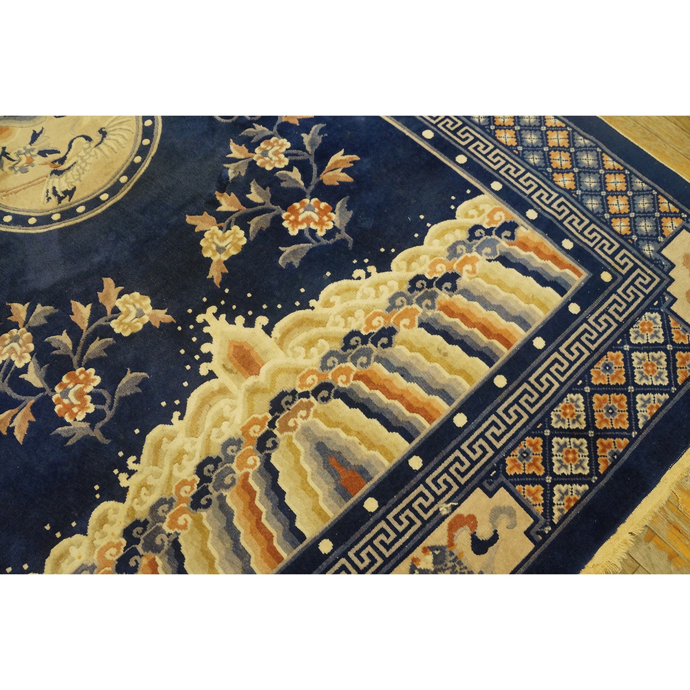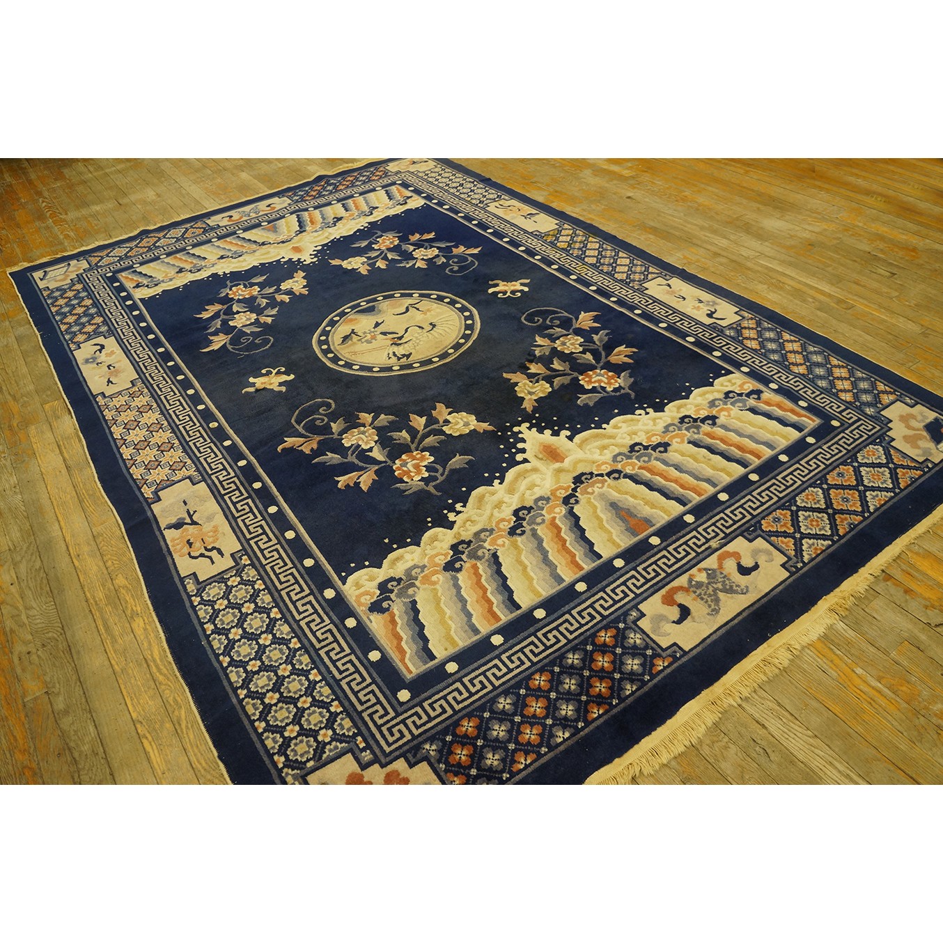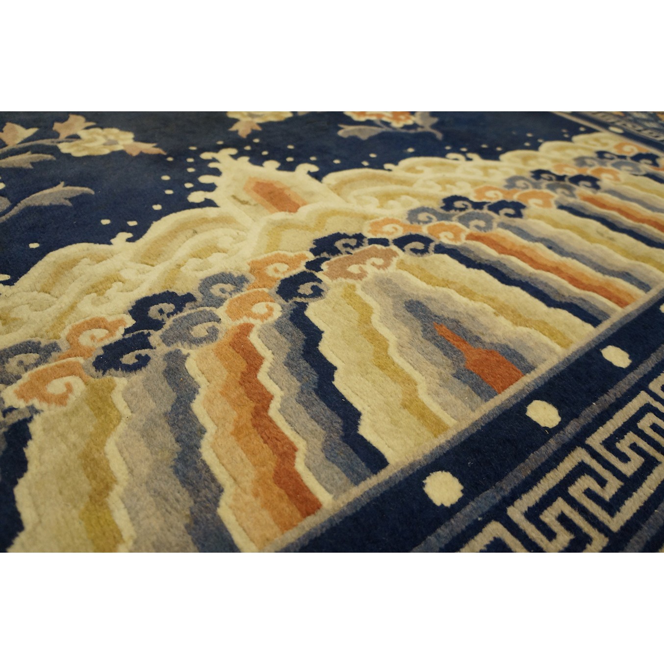 DescriptionChineseCarpets made in China proper. See entries Ningshia, Peking, Art Deco. Chinese - PekingThe commercial Peking carpet is a later 19th century development, begun by importing weaves from Ningshia (see entry) to create and export industry aimed at Western markets. The foundation is cotton and the pile is a good quality carpet wool which takes dyes particularly well. The neat medium weave is in Persian (asymmetric) knots. Designs are strictly Chinese and the whole motif repertoire of Chinese art is employed. Blue and white is the most popular color combination and red is particularly rare. Sizes tend to 9 x 12 and larger, and few small pieces appear. For a short time in the early 1920s Persian designs were woven to capitalize on the death of new Iranian goods. The industry decimated by the Communist Revolution relocated to the Pearl River area. There is a good supply of antique carpets at reasonable prices. | |