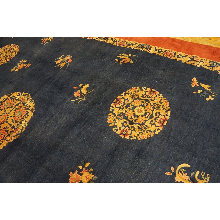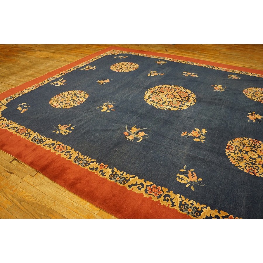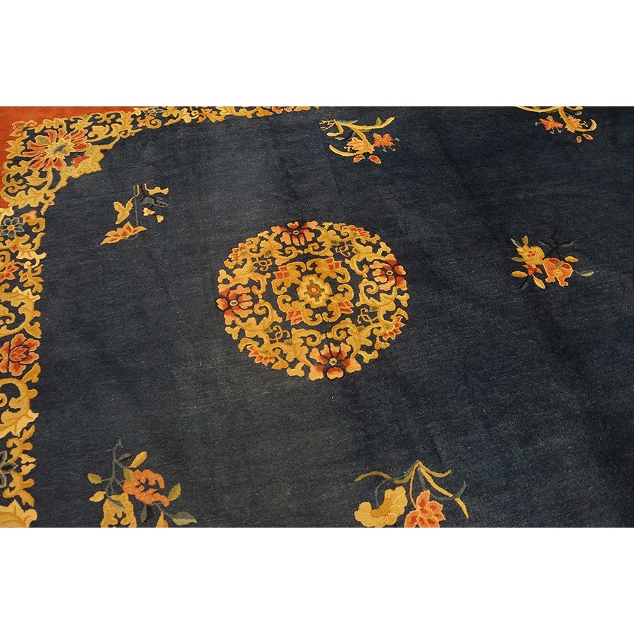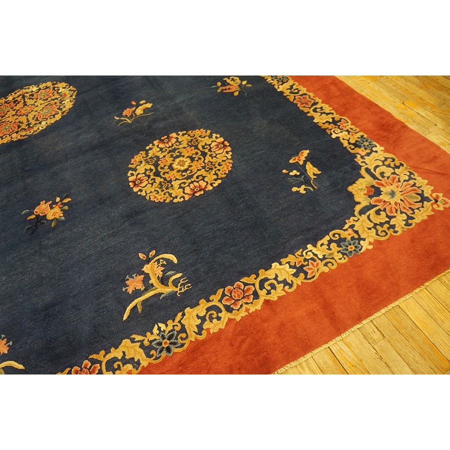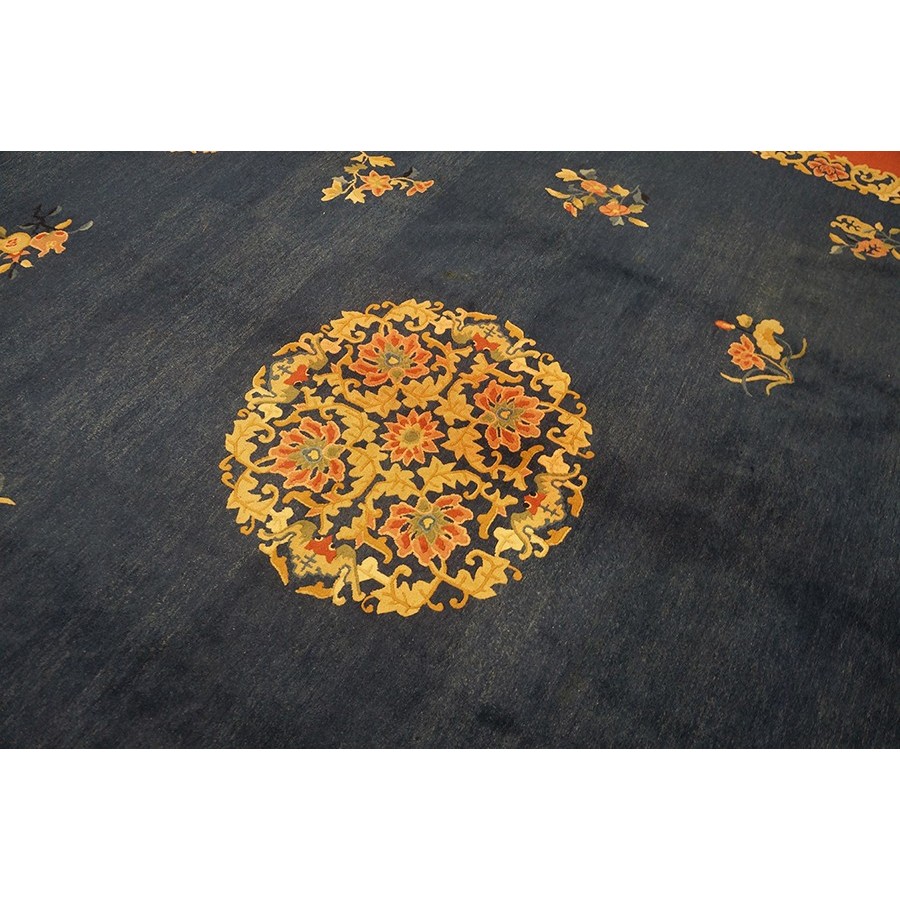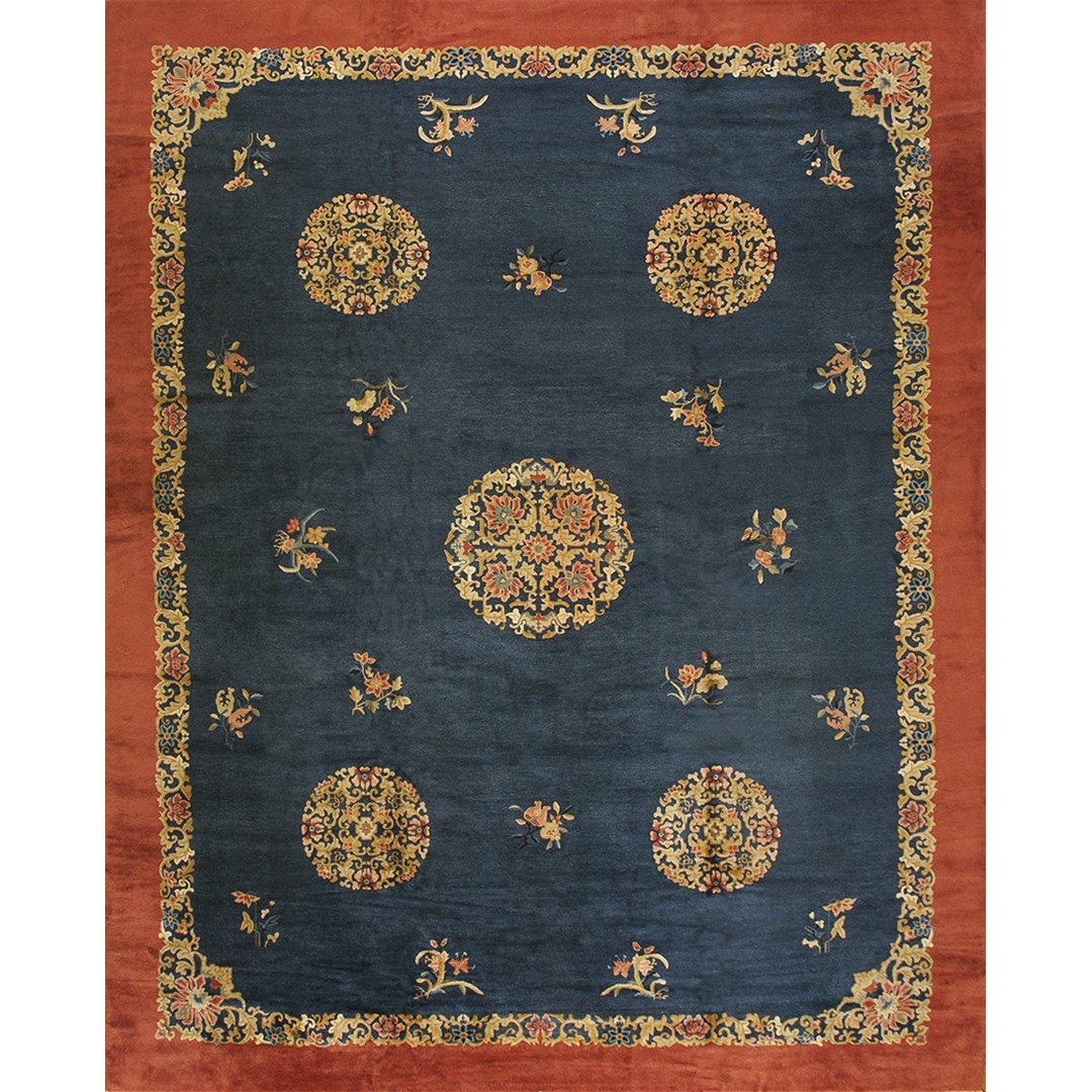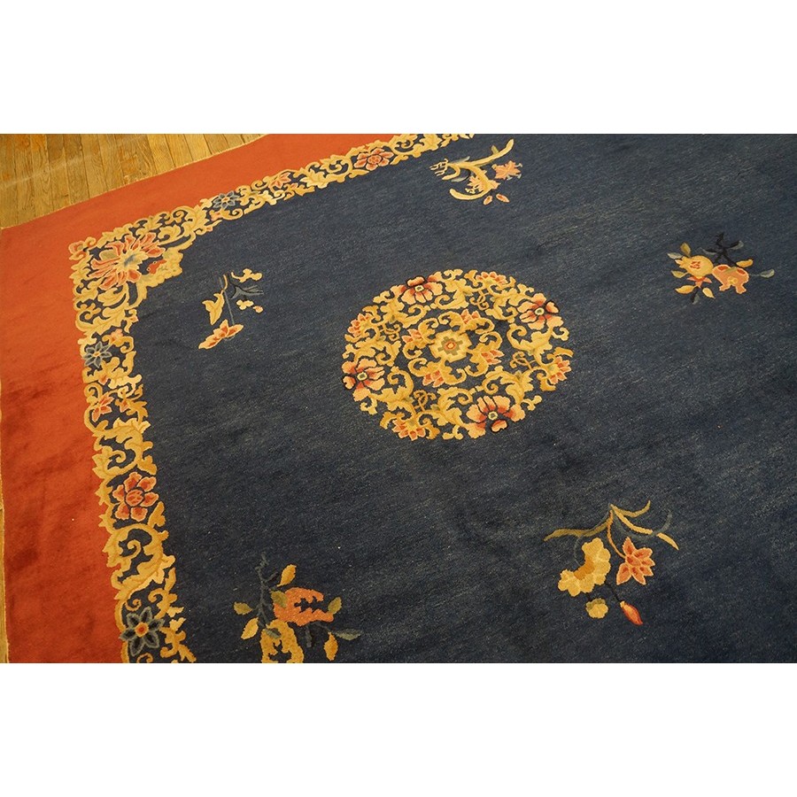 DescriptionChineseCarpets made in China proper. See entries Ningshia, Peking, Art Deco. Chinese - PekingThe commercial Peking carpet is a later 19th century development, begun by importing weaves from Ningshia (see entry) to create and export industry aimed at Western markets. The foundation is cotton and the pile is a good quality carpet wool which takes dyes particularly well. The neat medium weave is in Persian (asymmetric) knots. Designs are strictly Chinese and the whole motif repertoire of Chinese art is employed. Blue and white is the most popular color combination and red is particularly rare. Sizes tend to 9 x 12 and larger, and few small pieces appear. For a short time in the early 1920s Persian designs were woven to capitalize on the death of new Iranian goods. The industry decimated by the Communist Revolution relocated to the Pearl River area. There is a good supply of antique carpets at reasonable prices. | |