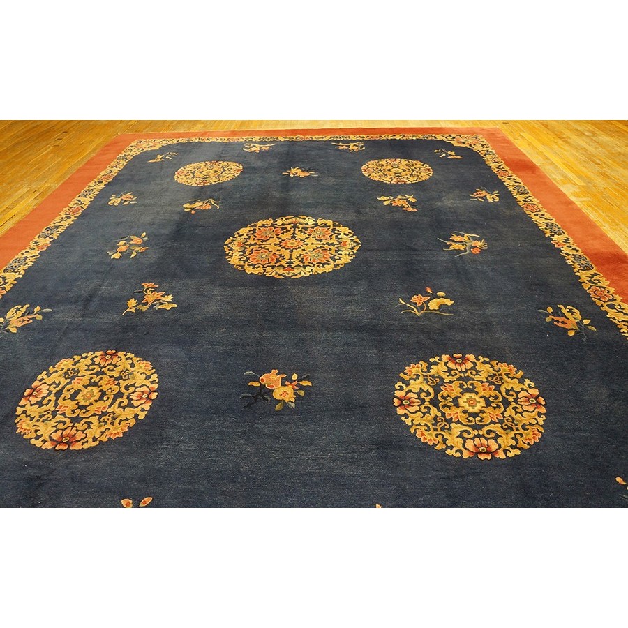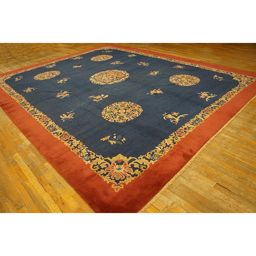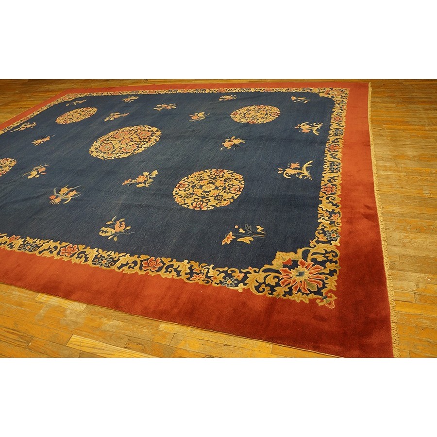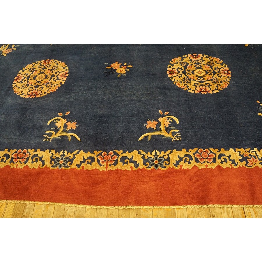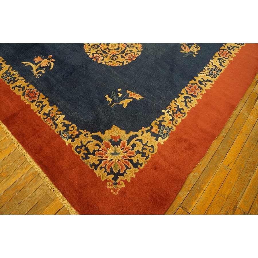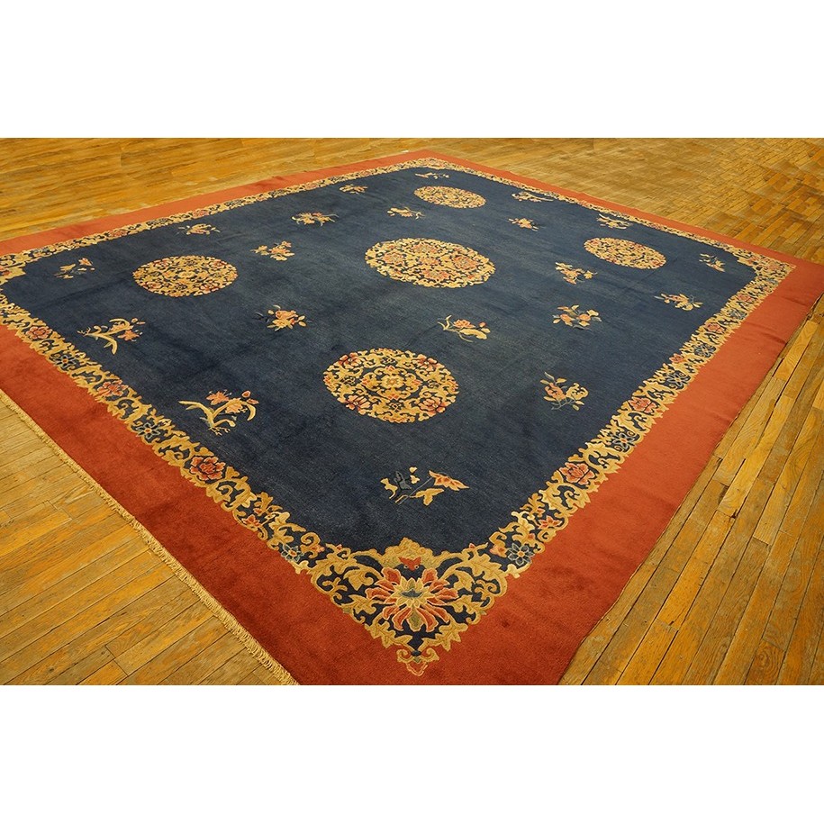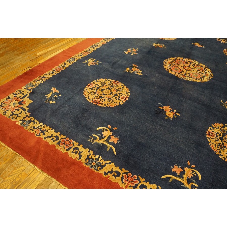 DescriptionChineseCarpets made in China proper. See entries Ningshia, Peking, Art Deco. Chinese - PekingThe commercial Peking carpet is a later 19th century development, begun by importing weaves from Ningshia (see entry) to create and export industry aimed at Western markets. The foundation is cotton and the pile is a good quality carpet wool which takes dyes particularly well. The neat medium weave is in Persian (asymmetric) knots. Designs are strictly Chinese and the whole motif repertoire of Chinese art is employed. Blue and white is the most popular color combination and red is particularly rare. Sizes tend to 9 x 12 and larger, and few small pieces appear. For a short time in the early 1920s Persian designs were woven to capitalize on the death of new Iranian goods. The industry decimated by the Communist Revolution relocated to the Pearl River area. There is a good supply of antique carpets at reasonable prices. | |
