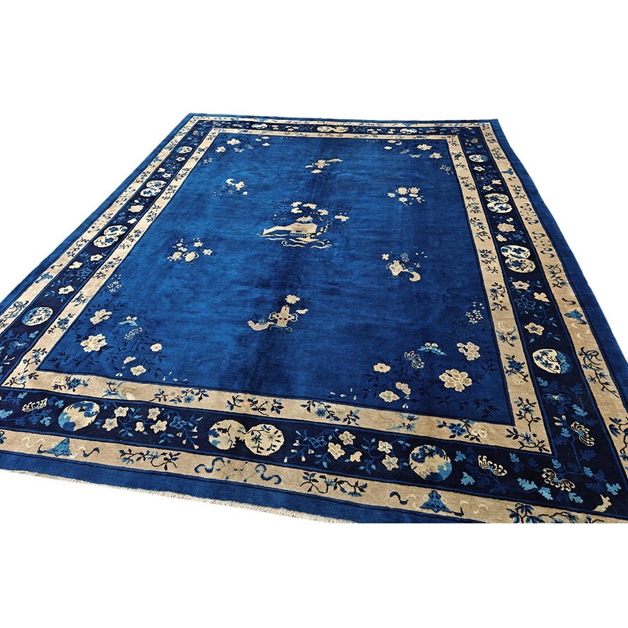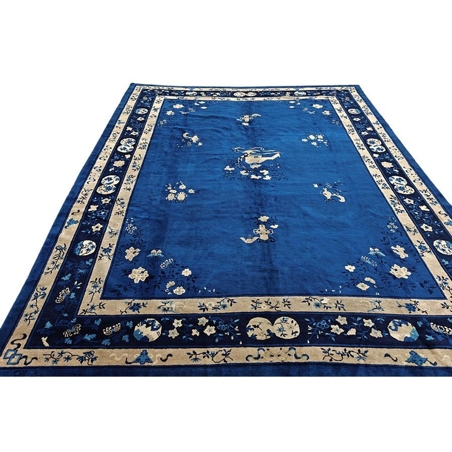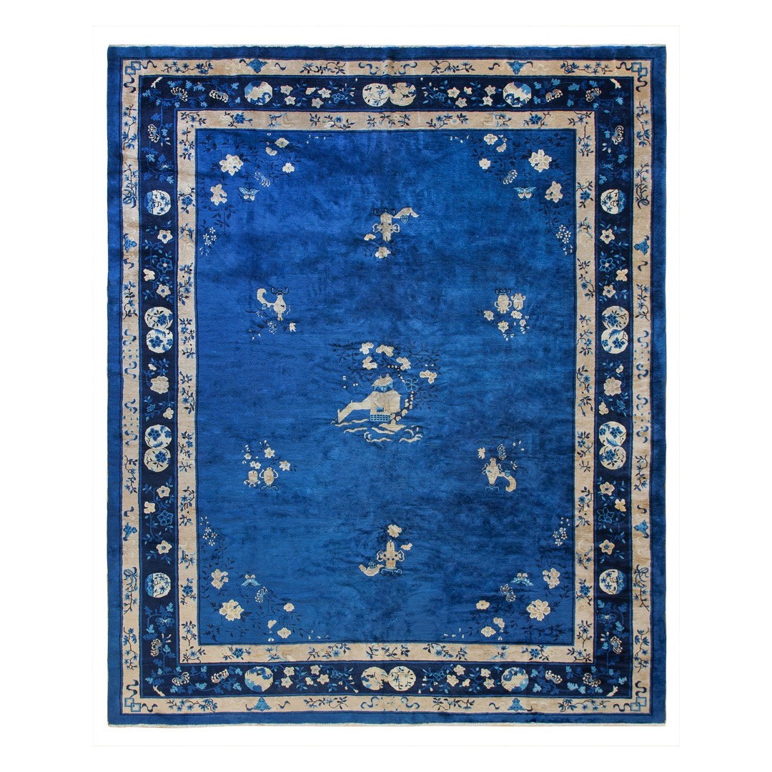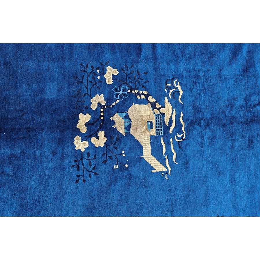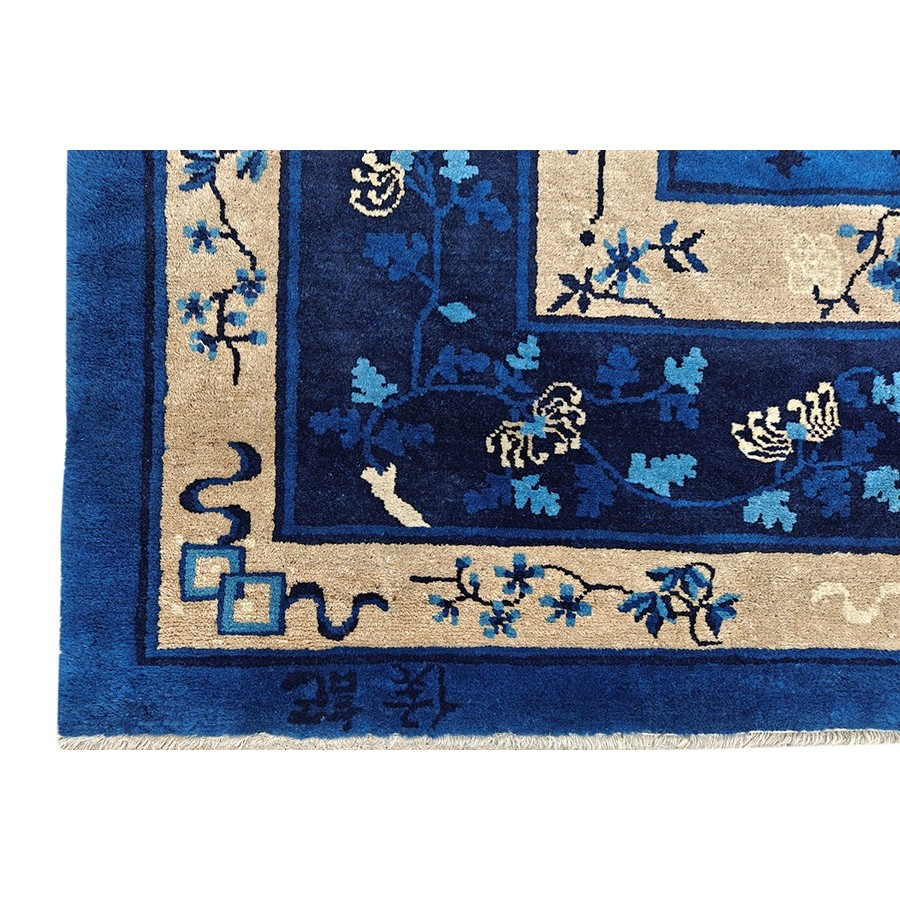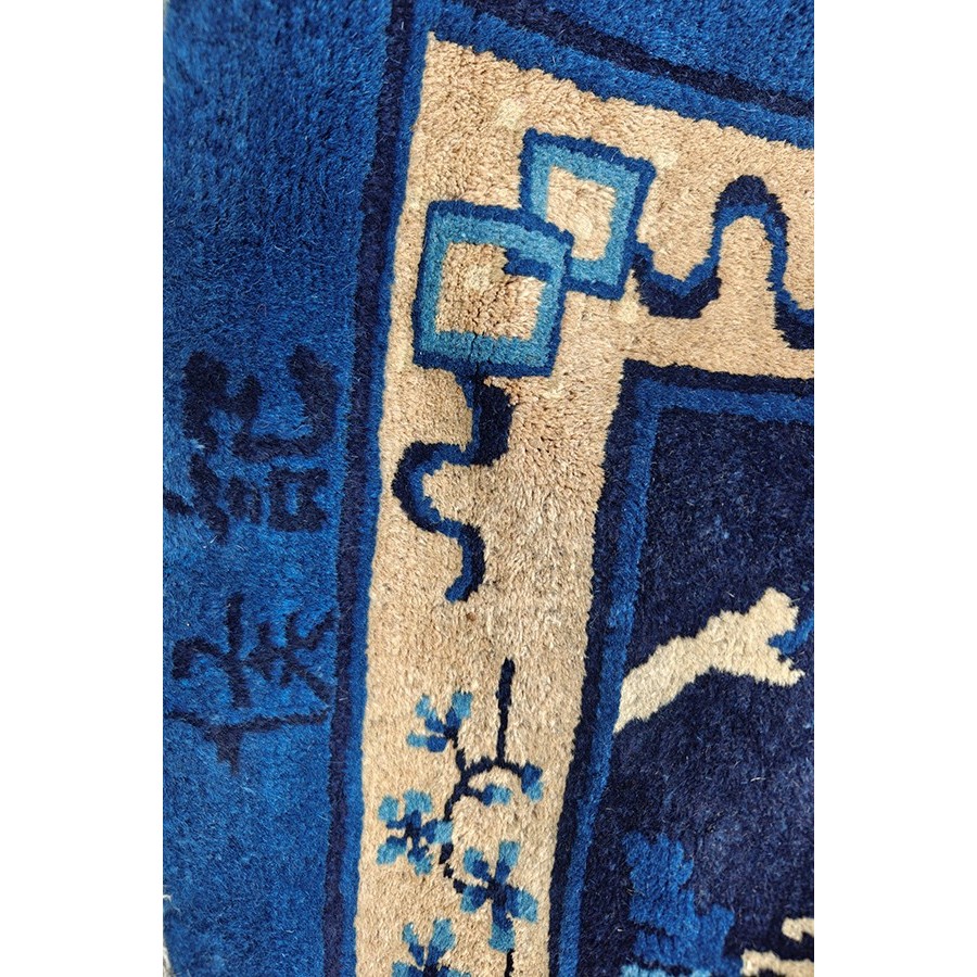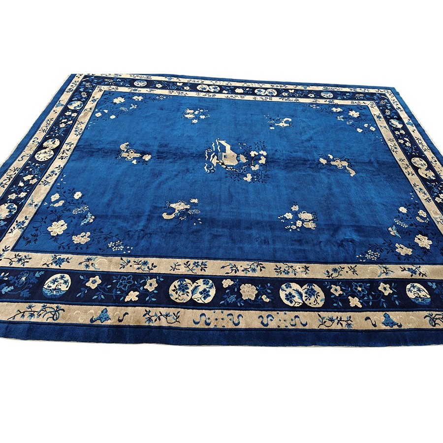 DescriptionChineseCarpets made in China proper. See entries Ningshia, Peking, Art Deco. Chinese - PekingThe commercial Peking carpet is a later 19th century development, begun by importing weaves from Ningshia (see entry) to create and export industry aimed at Western markets. The foundation is cotton and the pile is a good quality carpet wool which takes dyes particularly well. The neat medium weave is in Persian (asymmetric) knots. Designs are strictly Chinese and the whole motif repertoire of Chinese art is employed. Blue and white is the most popular color combination and red is particularly rare. Sizes tend to 9 x 12 and larger, and few small pieces appear. For a short time in the early 1920s Persian designs were woven to capitalize on the death of new Iranian goods. The industry decimated by the Communist Revolution relocated to the Pearl River area. There is a good supply of antique carpets at reasonable prices. | |