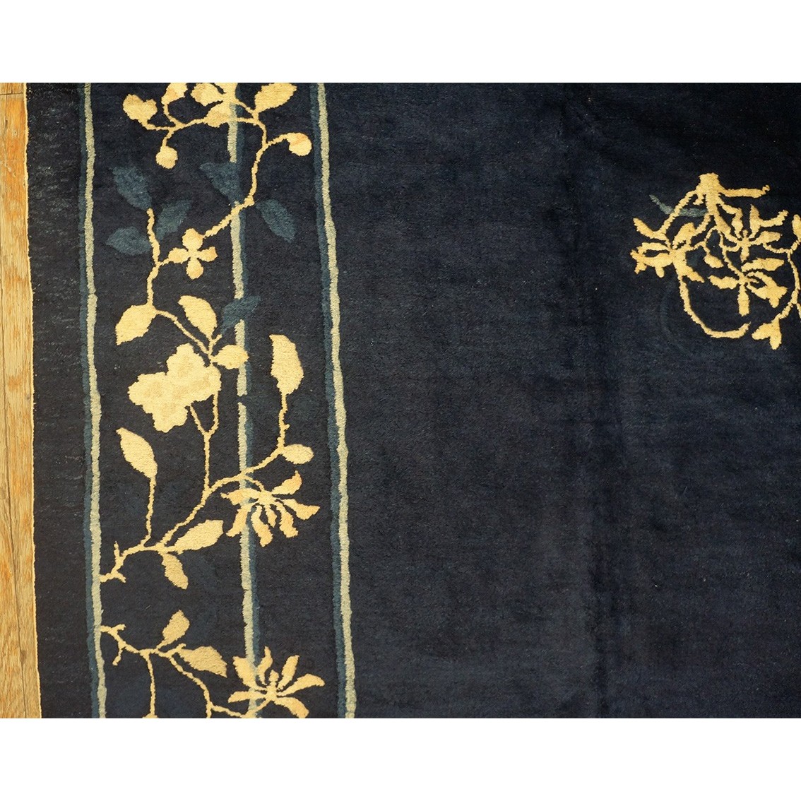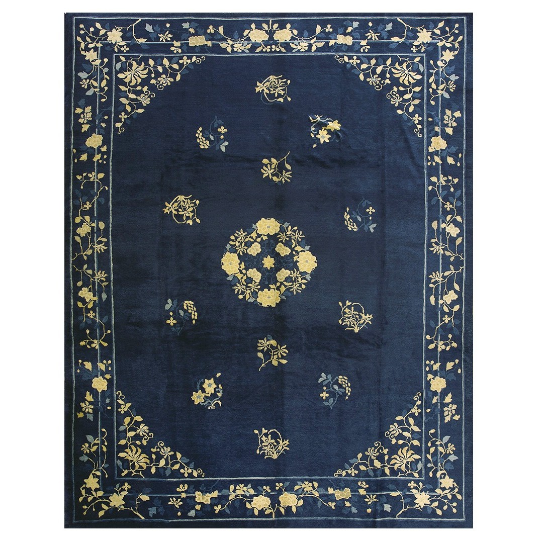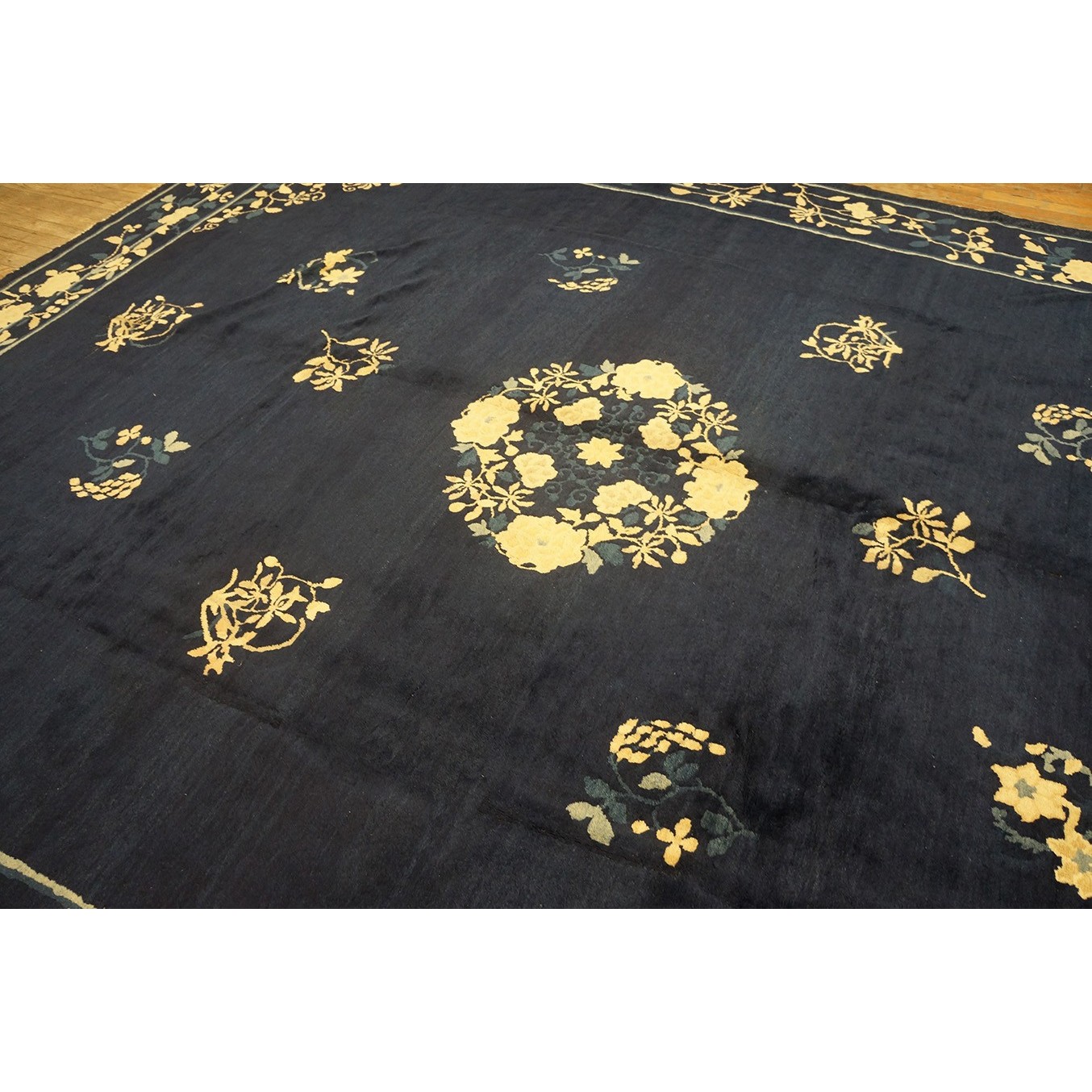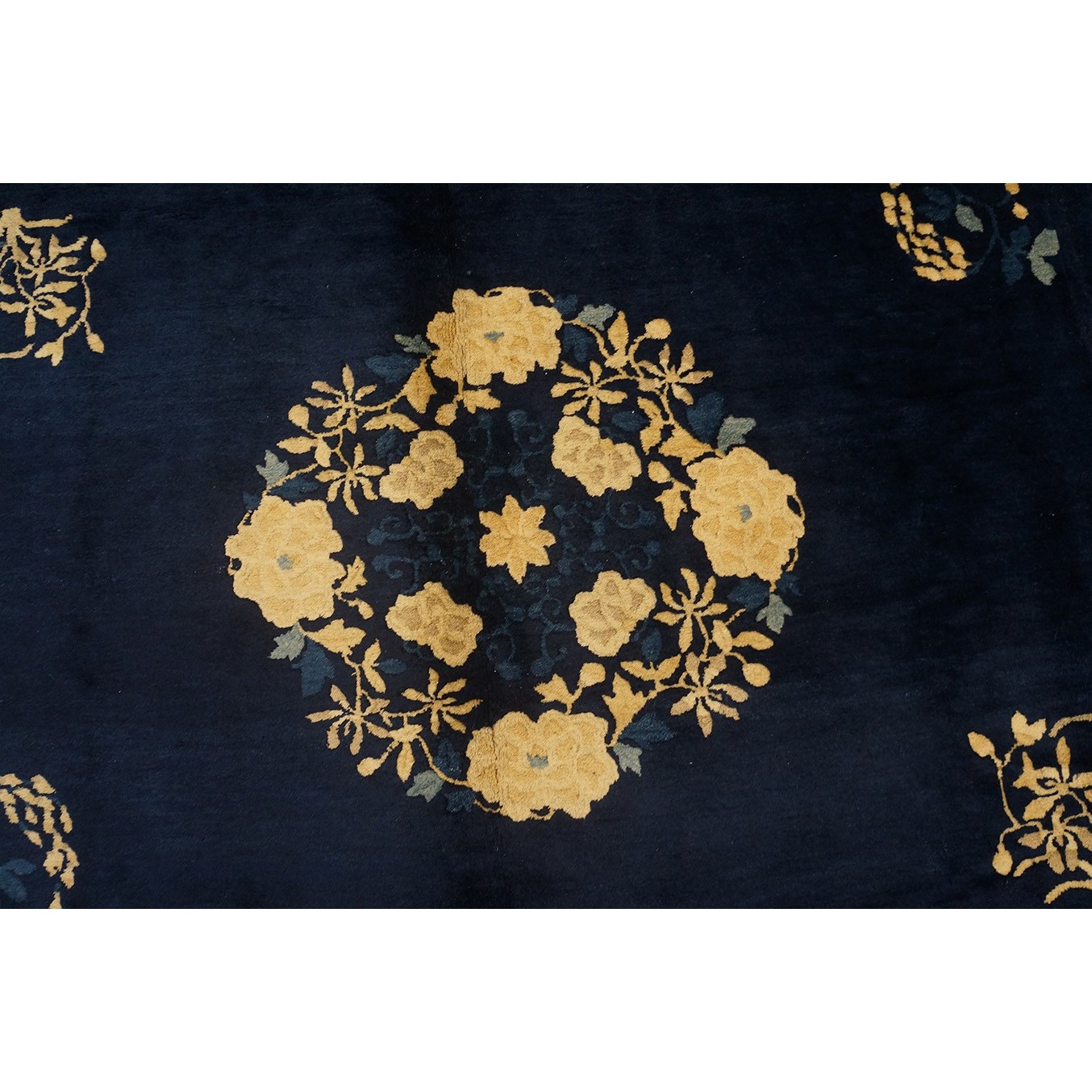 DescriptionChineseCarpets made in China proper. See entries Ningshia, Peking, Art Deco. Chinese - PekingThe commercial Peking carpet is a later 19th century development, begun by importing weaves from Ningshia (see entry) to create and export industry aimed at Western markets. The foundation is cotton and the pile is a good quality carpet wool which takes dyes particularly well. The neat medium weave is in Persian (asymmetric) knots. Designs are strictly Chinese and the whole motif repertoire of Chinese art is employed. Blue and white is the most popular color combination and red is particularly rare. Sizes tend to 9 x 12 and larger, and few small pieces appear. For a short time in the early 1920s Persian designs were woven to capitalize on the death of new Iranian goods. The industry decimated by the Communist Revolution relocated to the Pearl River area. There is a good supply of antique carpets at reasonable prices. | |