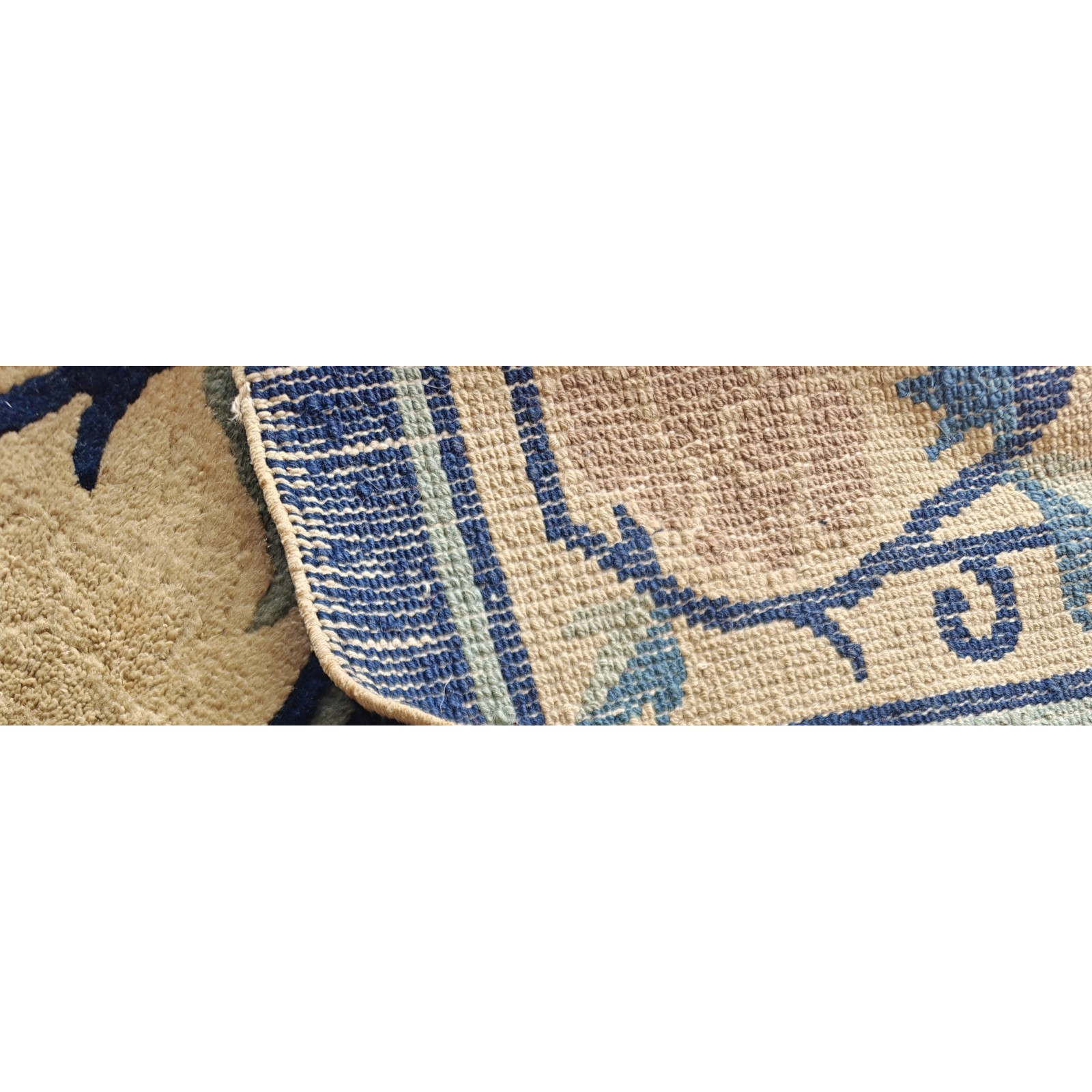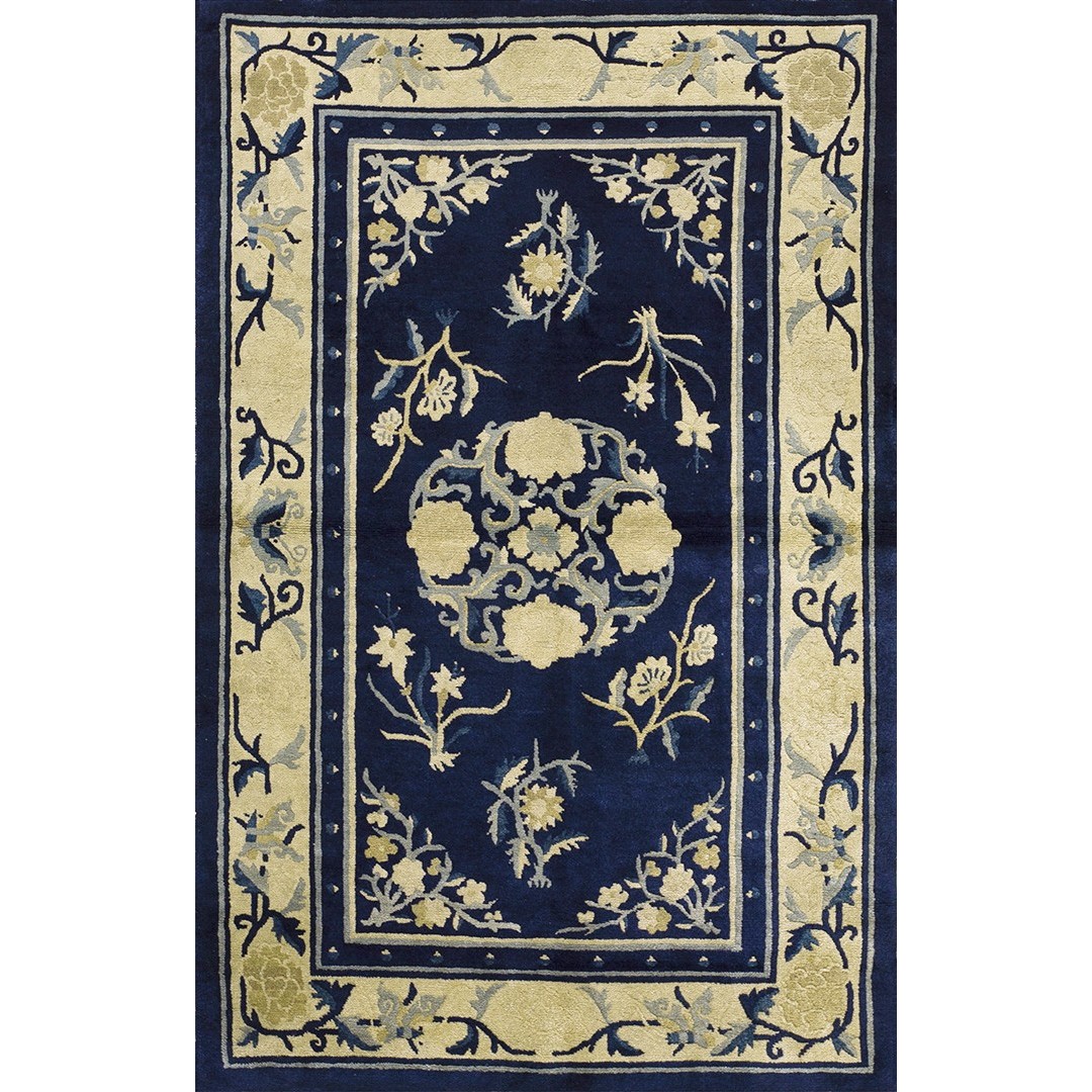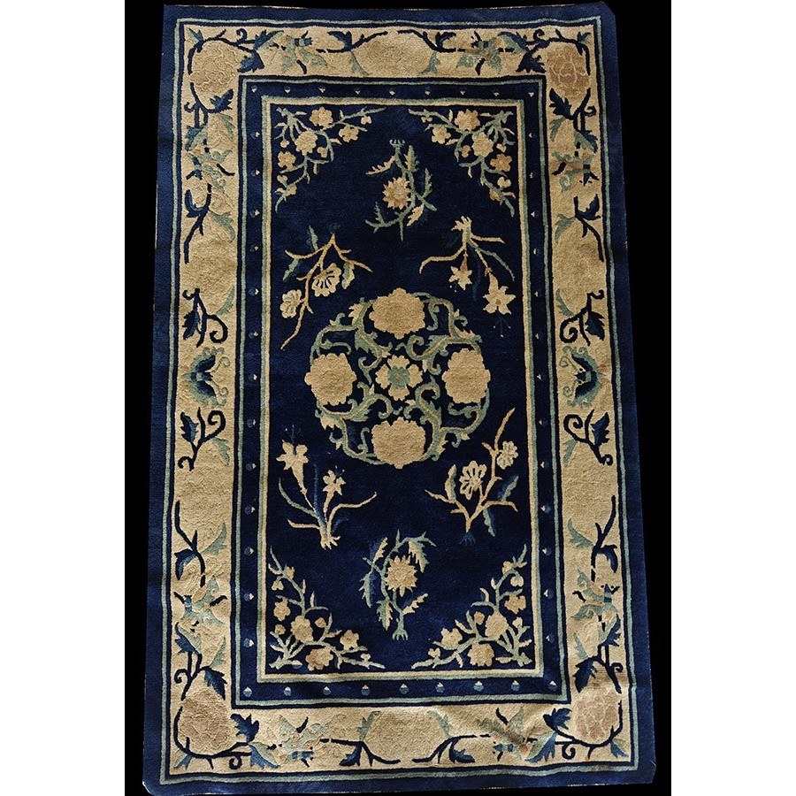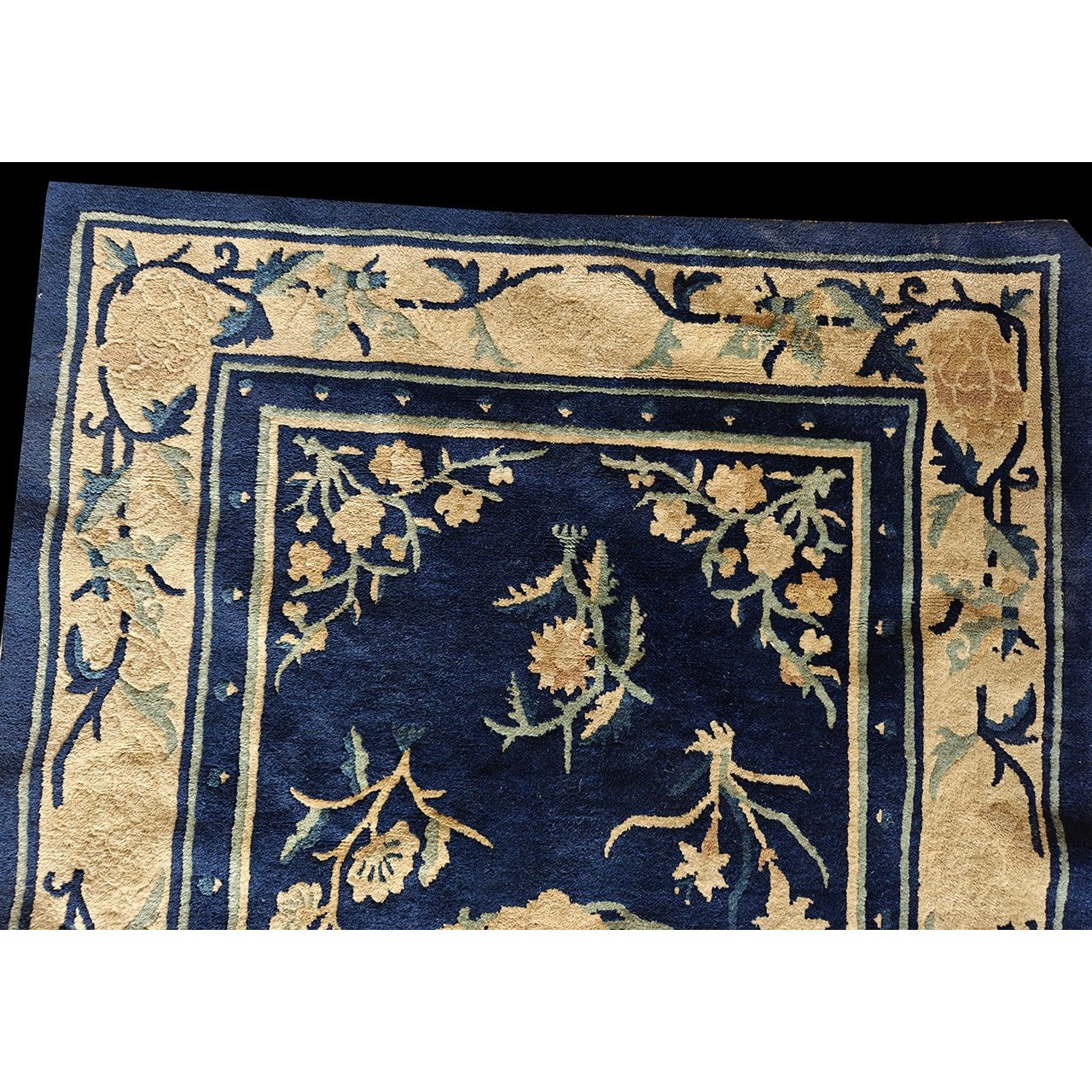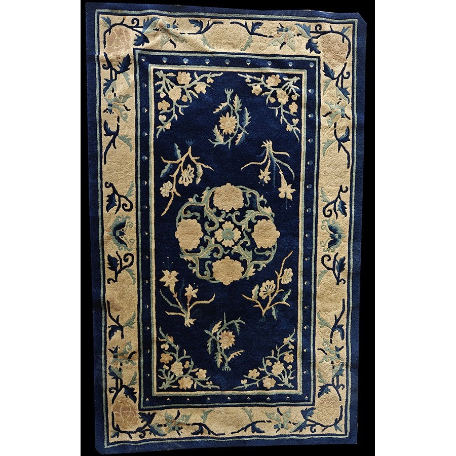DescriptionChineseCarpets made in China proper. See entries Ningshia, Peking, Art Deco. Chinese - PekingThe commercial Peking carpet is a later 19th century development, begun by importing weaves from Ningshia (see entry) to create and export industry aimed at Western markets. The foundation is cotton and the pile is a good quality carpet wool which takes dyes particularly well. The neat medium weave is in Persian (asymmetric) knots. Designs are strictly Chinese and the whole motif repertoire of Chinese art is employed. Blue and white is the most popular color combination and red is particularly rare. Sizes tend to 9 x 12 and larger, and few small pieces appear. For a short time in the early 1920s Persian designs were woven to capitalize on the death of new Iranian goods. The industry decimated by the Communist Revolution relocated to the Pearl River area. There is a good supply of antique carpets at reasonable prices. | |