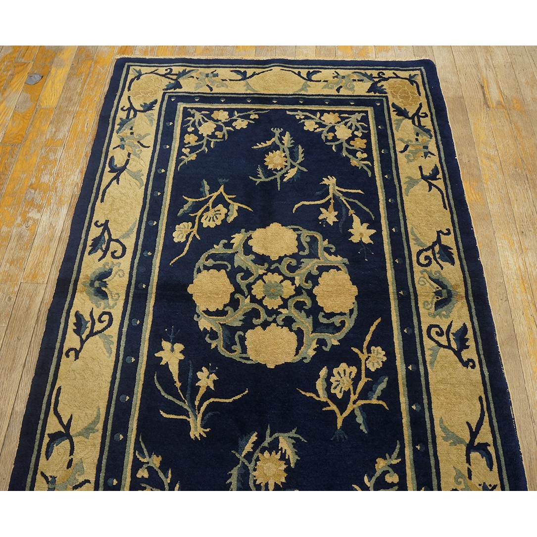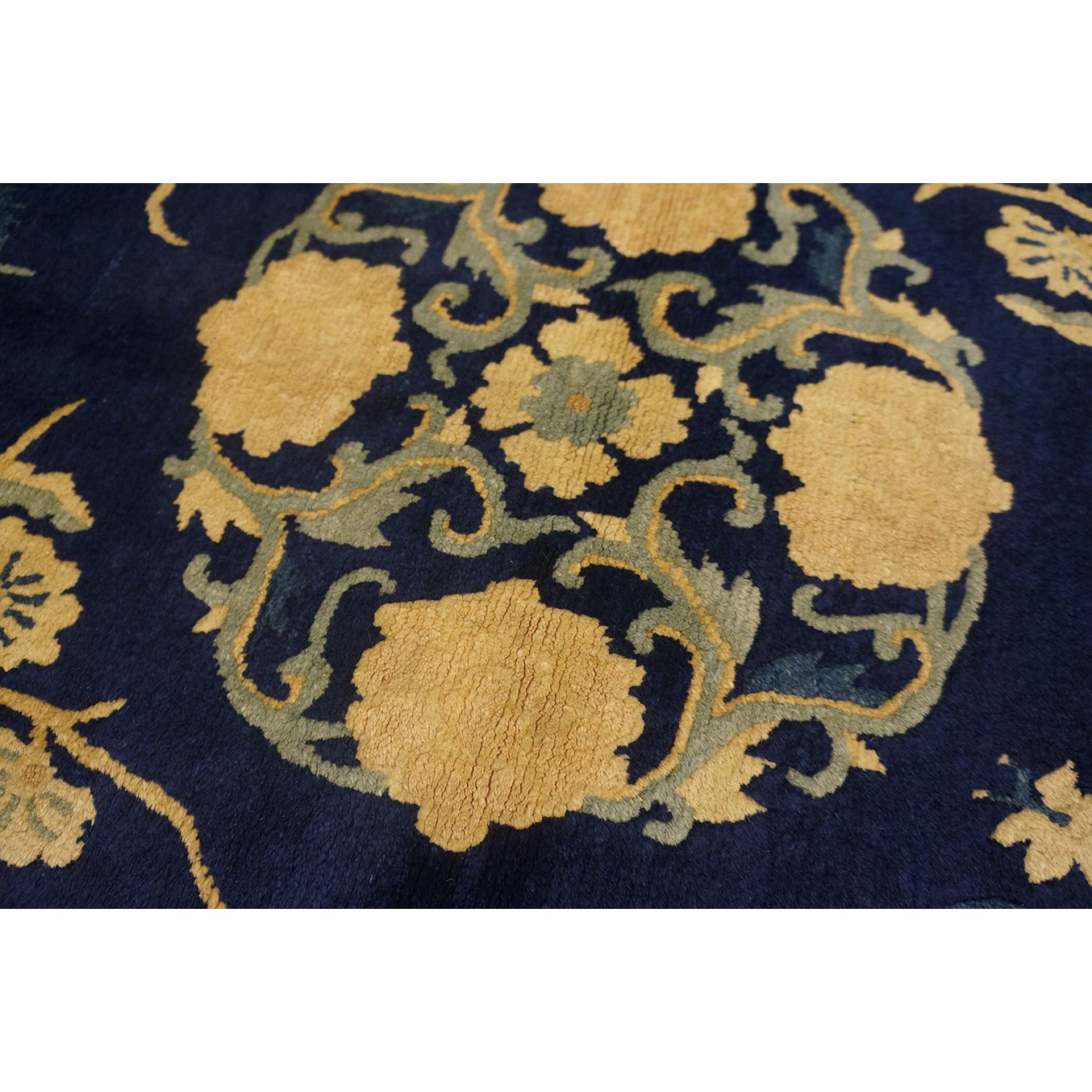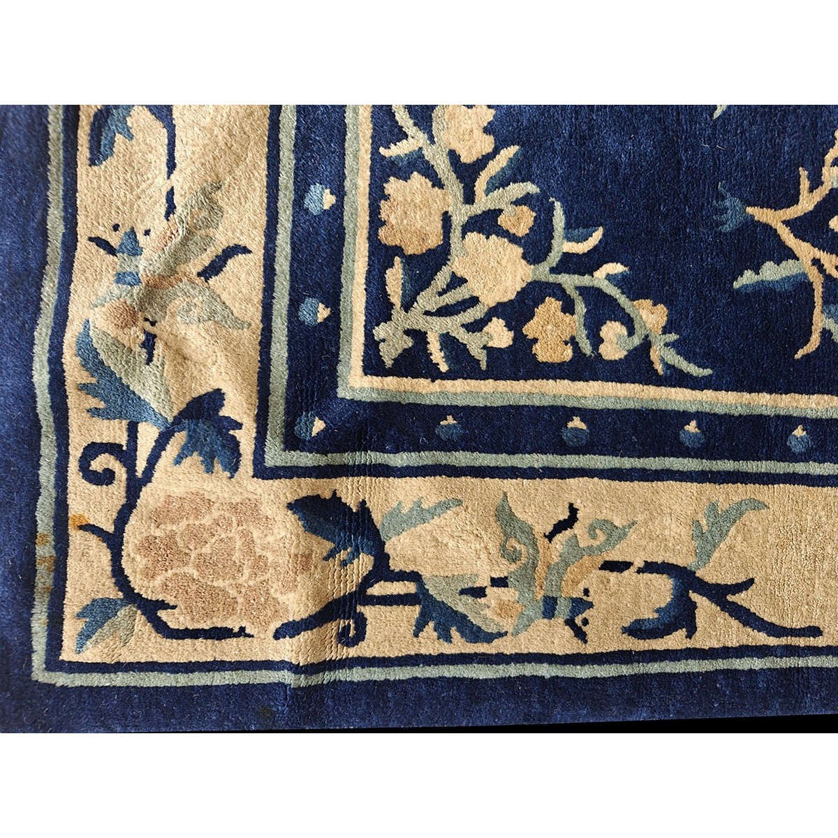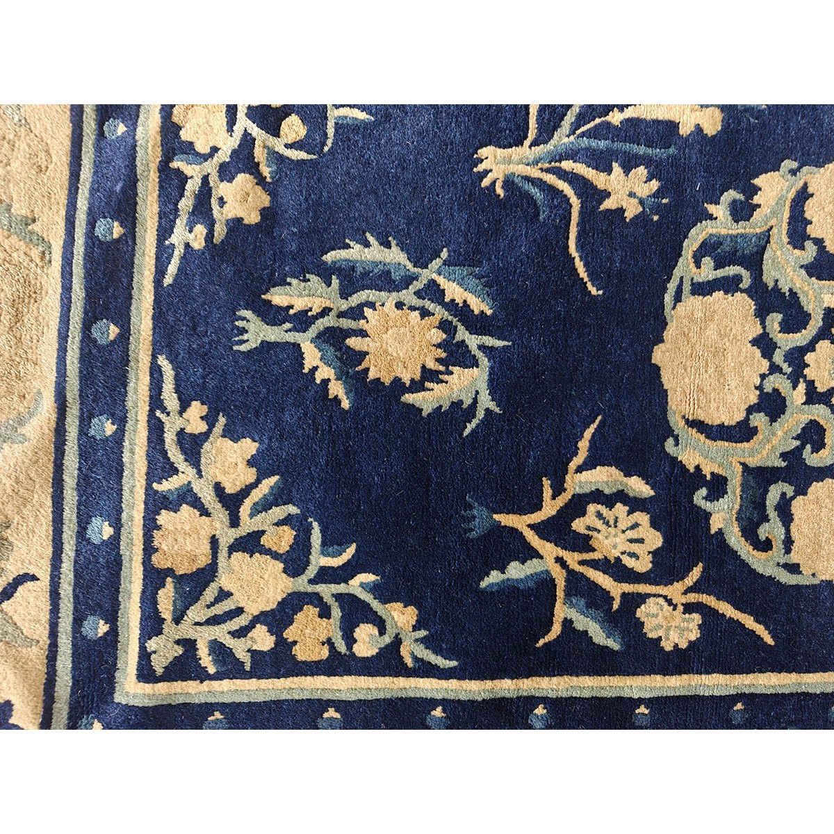 DescriptionChineseCarpets made in China proper. See entries Ningshia, Peking, Art Deco. Chinese - PekingThe commercial Peking carpet is a later 19th century development, begun by importing weaves from Ningshia (see entry) to create and export industry aimed at Western markets. The foundation is cotton and the pile is a good quality carpet wool which takes dyes particularly well. The neat medium weave is in Persian (asymmetric) knots. Designs are strictly Chinese and the whole motif repertoire of Chinese art is employed. Blue and white is the most popular color combination and red is particularly rare. Sizes tend to 9 x 12 and larger, and few small pieces appear. For a short time in the early 1920s Persian designs were woven to capitalize on the death of new Iranian goods. The industry decimated by the Communist Revolution relocated to the Pearl River area. There is a good supply of antique carpets at reasonable prices. | |