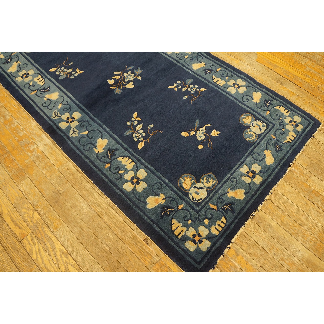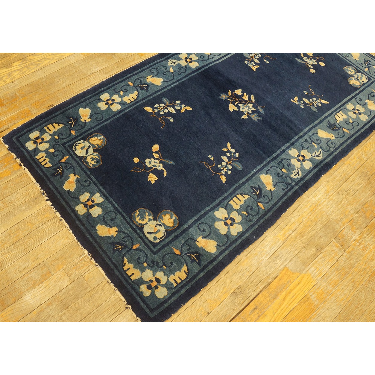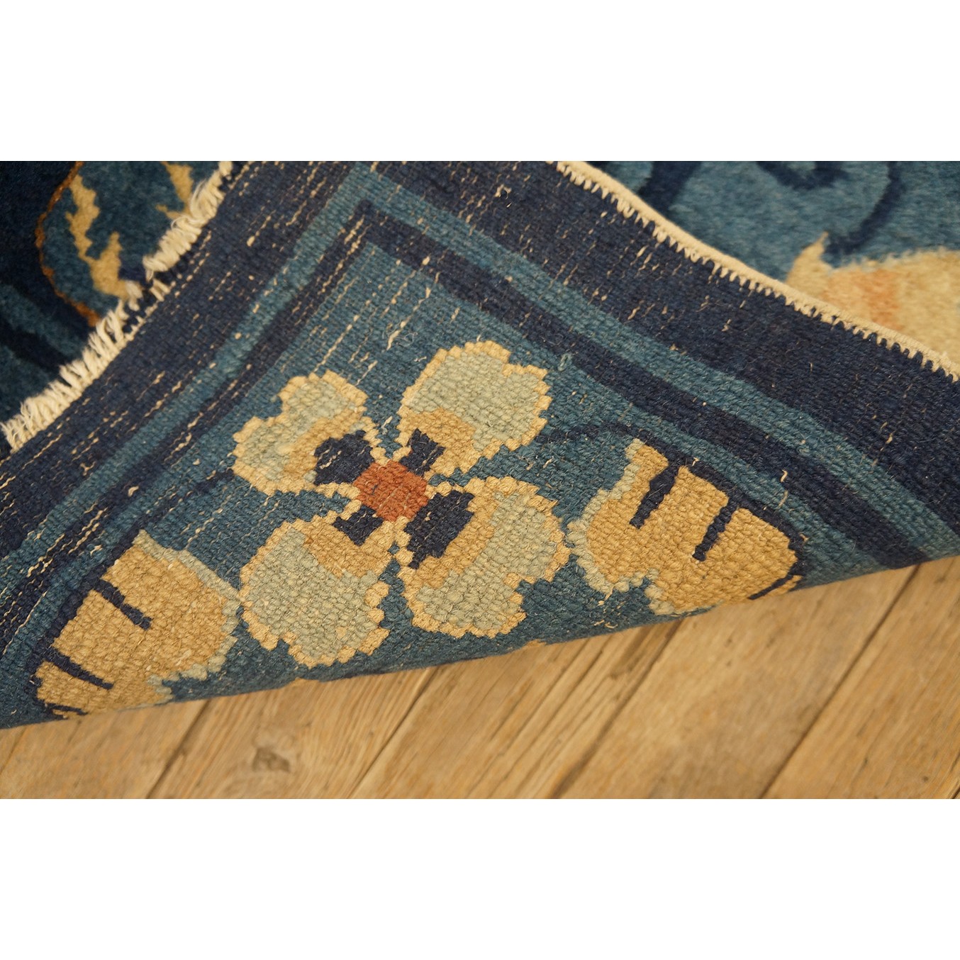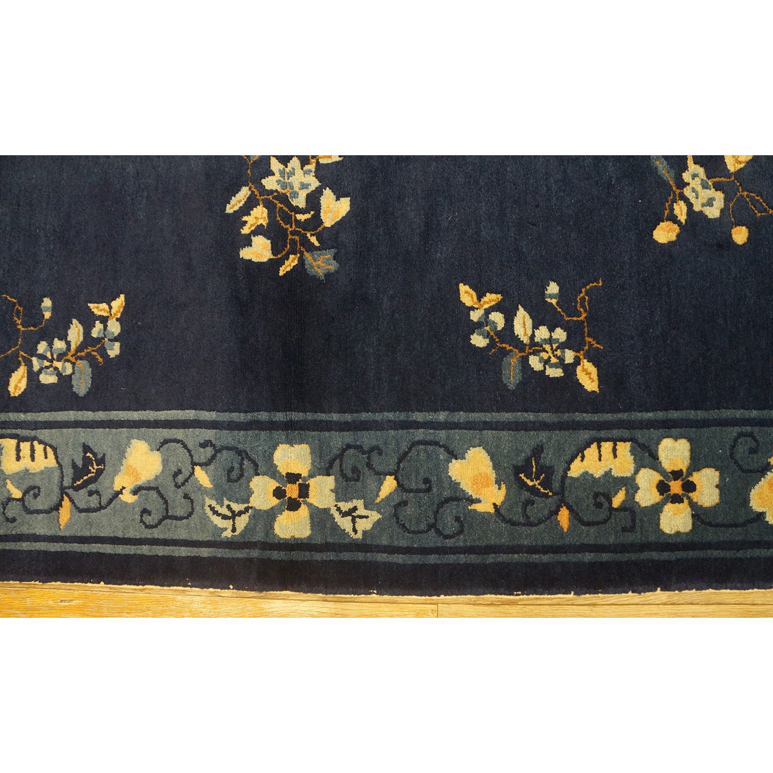 DescriptionChineseCarpets made in China proper. See entries Ningshia, Peking, Art Deco. Chinese - PekingThe commercial Peking carpet is a later 19th century development, begun by importing weaves from Ningshia (see entry) to create and export industry aimed at Western markets. The foundation is cotton and the pile is a good quality carpet wool which takes dyes particularly well. The neat medium weave is in Persian (asymmetric) knots. Designs are strictly Chinese and the whole motif repertoire of Chinese art is employed. Blue and white is the most popular color combination and red is particularly rare. Sizes tend to 9 x 12 and larger, and few small pieces appear. For a short time in the early 1920s Persian designs were woven to capitalize on the death of new Iranian goods. The industry decimated by the Communist Revolution relocated to the Pearl River area. There is a good supply of antique carpets at reasonable prices. | |