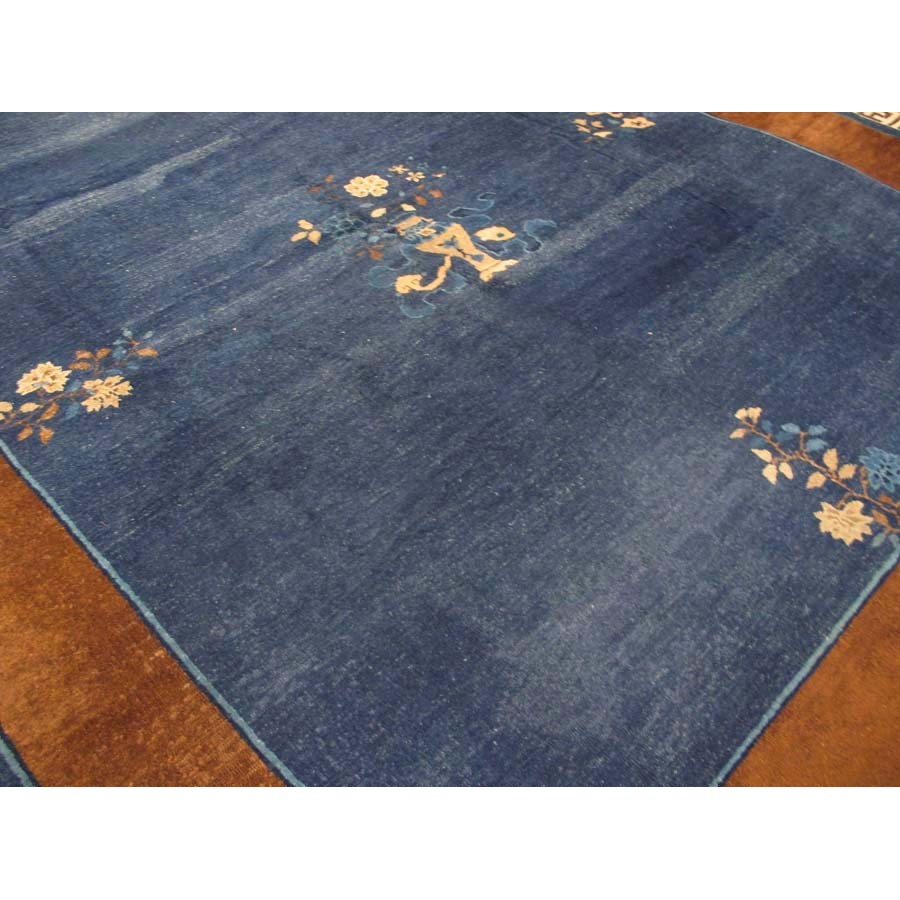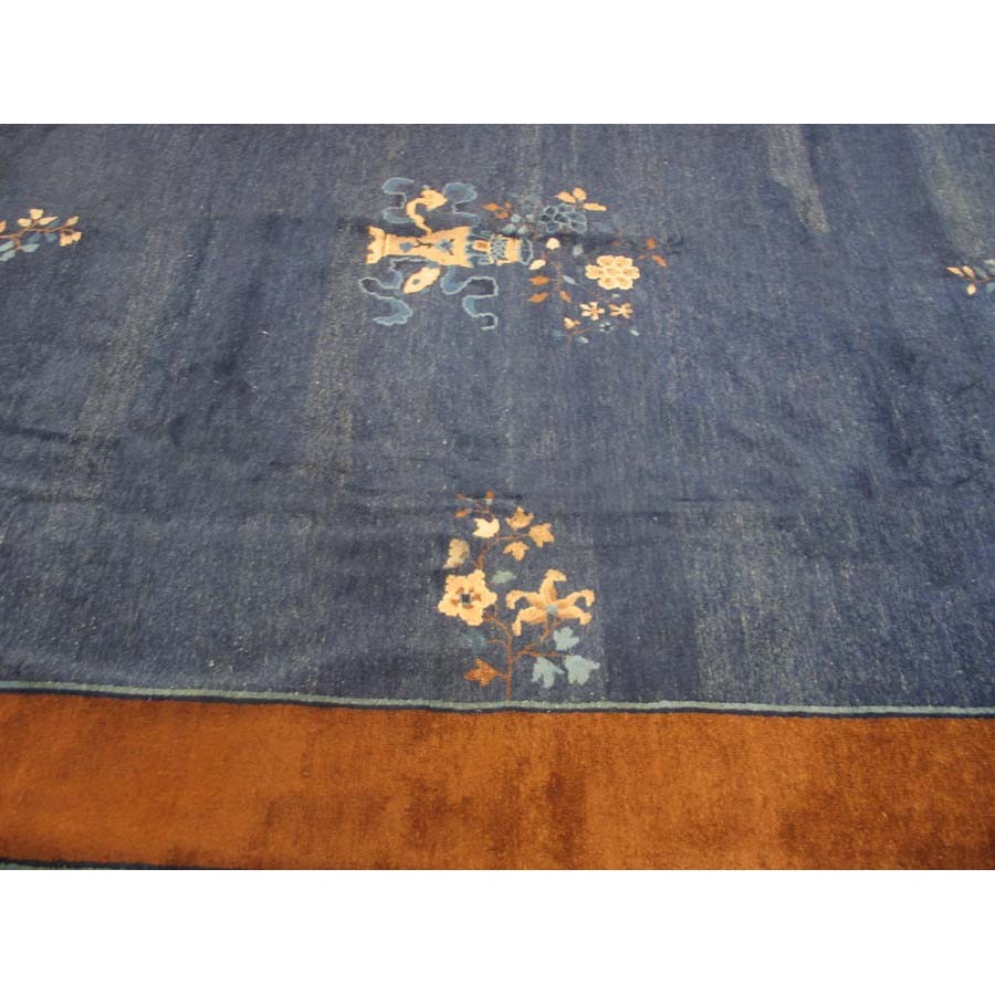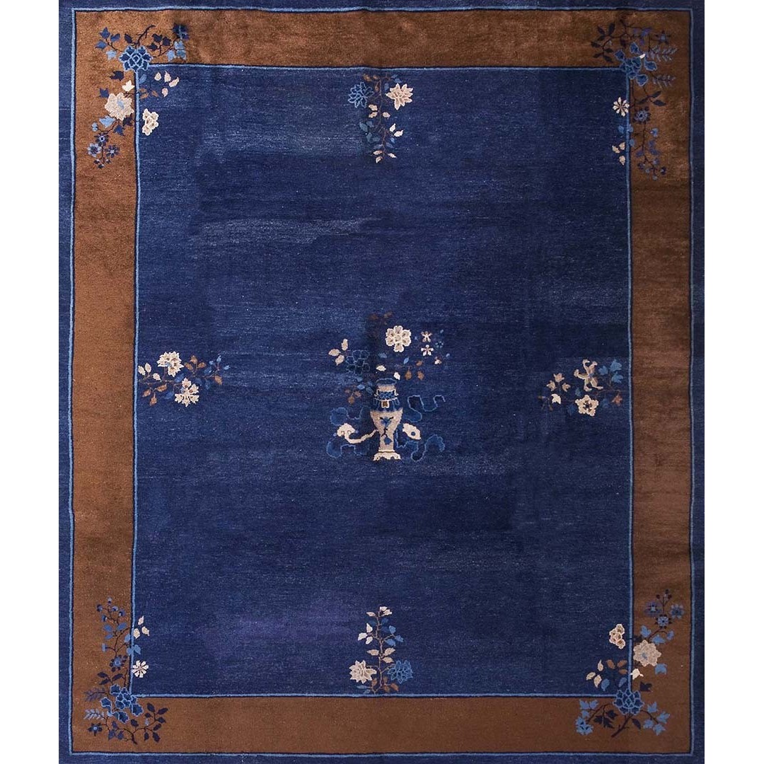 DescriptionChineseCarpets made in China proper. See entries Ningshia, Peking, Art Deco. Chinese - PekingThe commercial Peking carpet is a later 19th century development, begun by importing weaves from Ningshia (see entry) to create and export industry aimed at Western markets. The foundation is cotton and the pile is a good quality carpet wool which takes dyes particularly well. The neat medium weave is in Persian (asymmetric) knots. Designs are strictly Chinese and the whole motif repertoire of Chinese art is employed. Blue and white is the most popular color combination and red is particularly rare. Sizes tend to 9 x 12 and larger, and few small pieces appear. For a short time in the early 1920s Persian designs were woven to capitalize on the death of new Iranian goods. The industry decimated by the Communist Revolution relocated to the Pearl River area. There is a good supply of antique carpets at reasonable prices. | |
