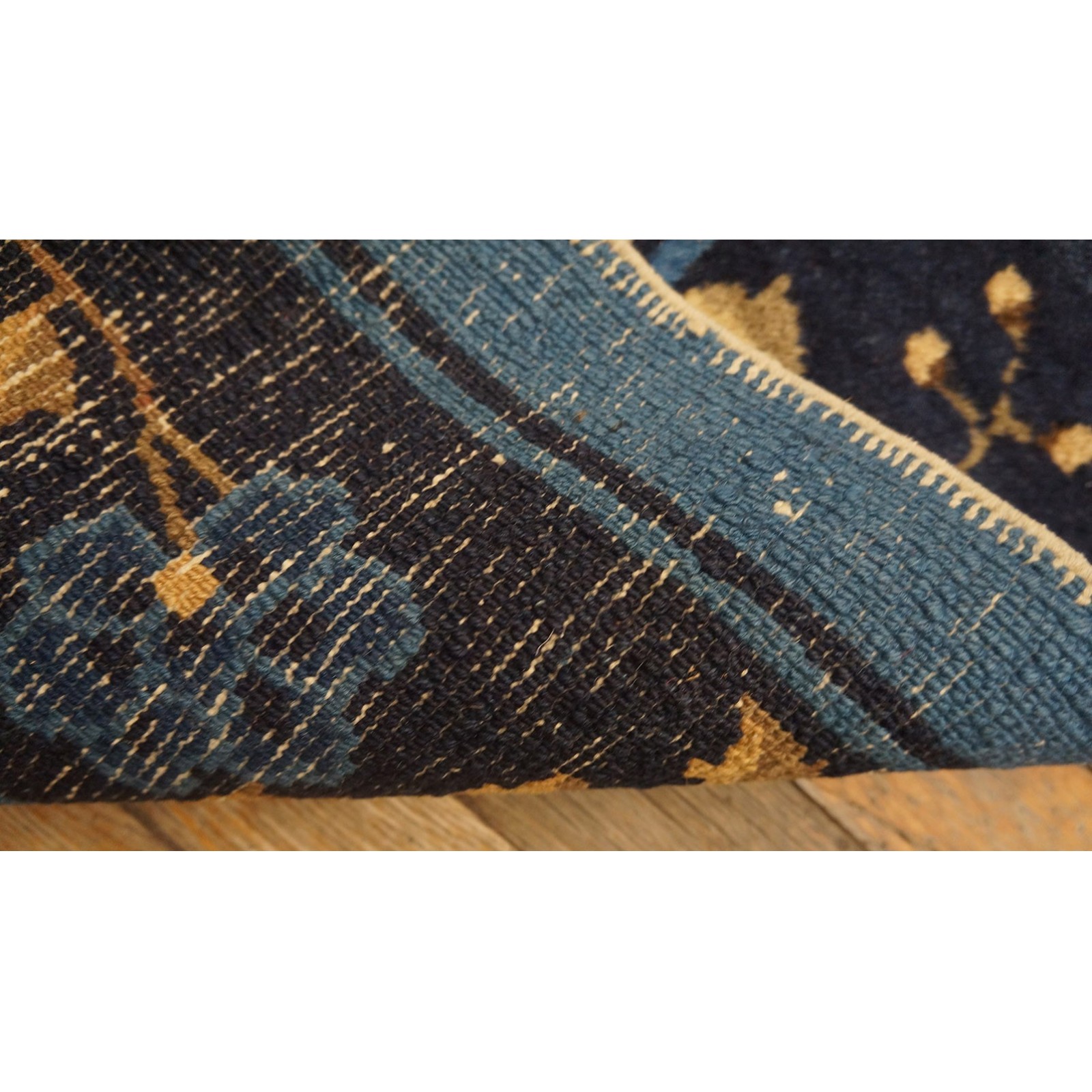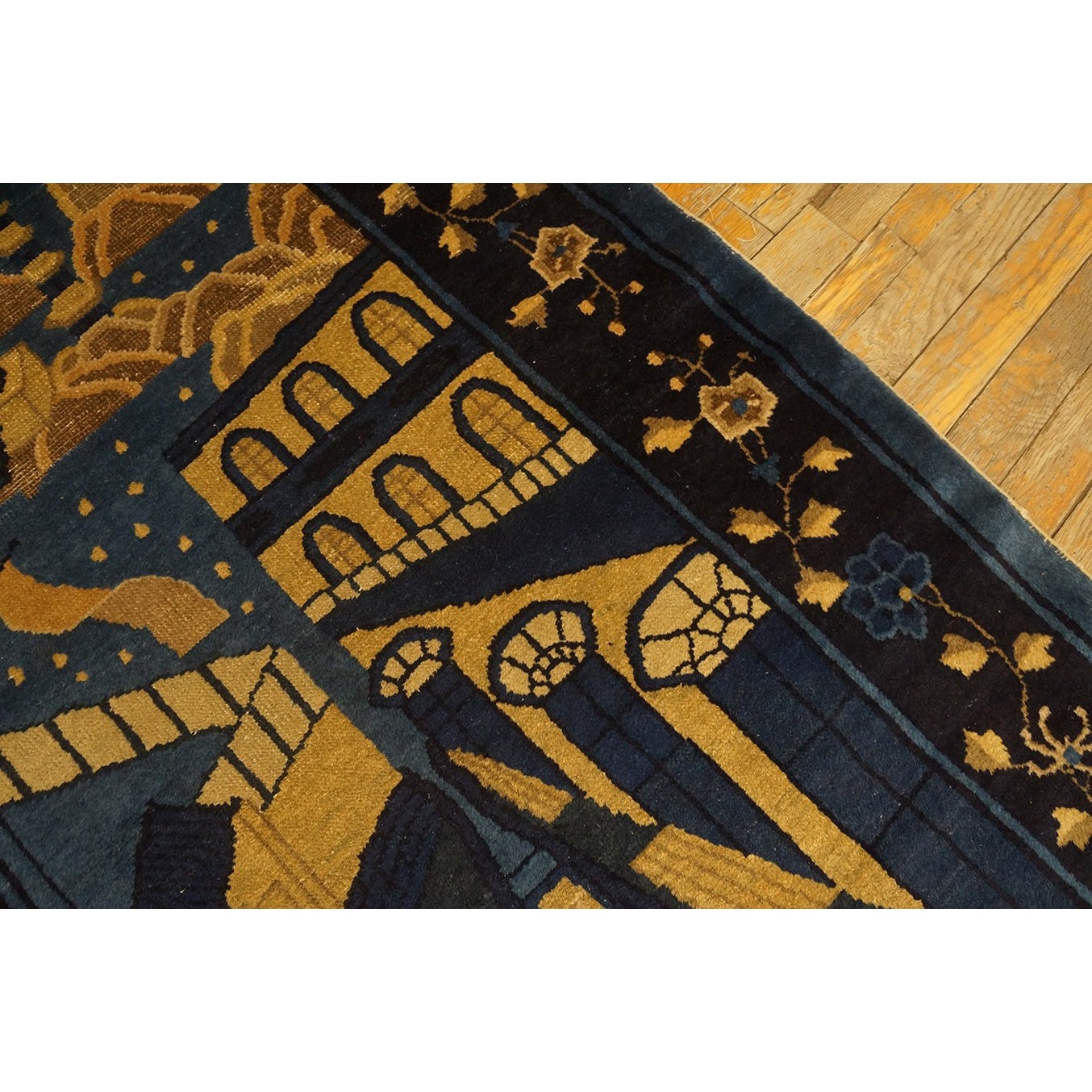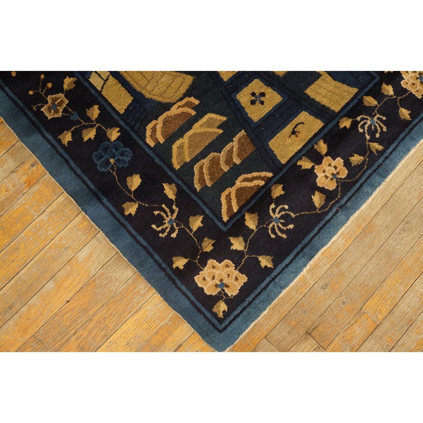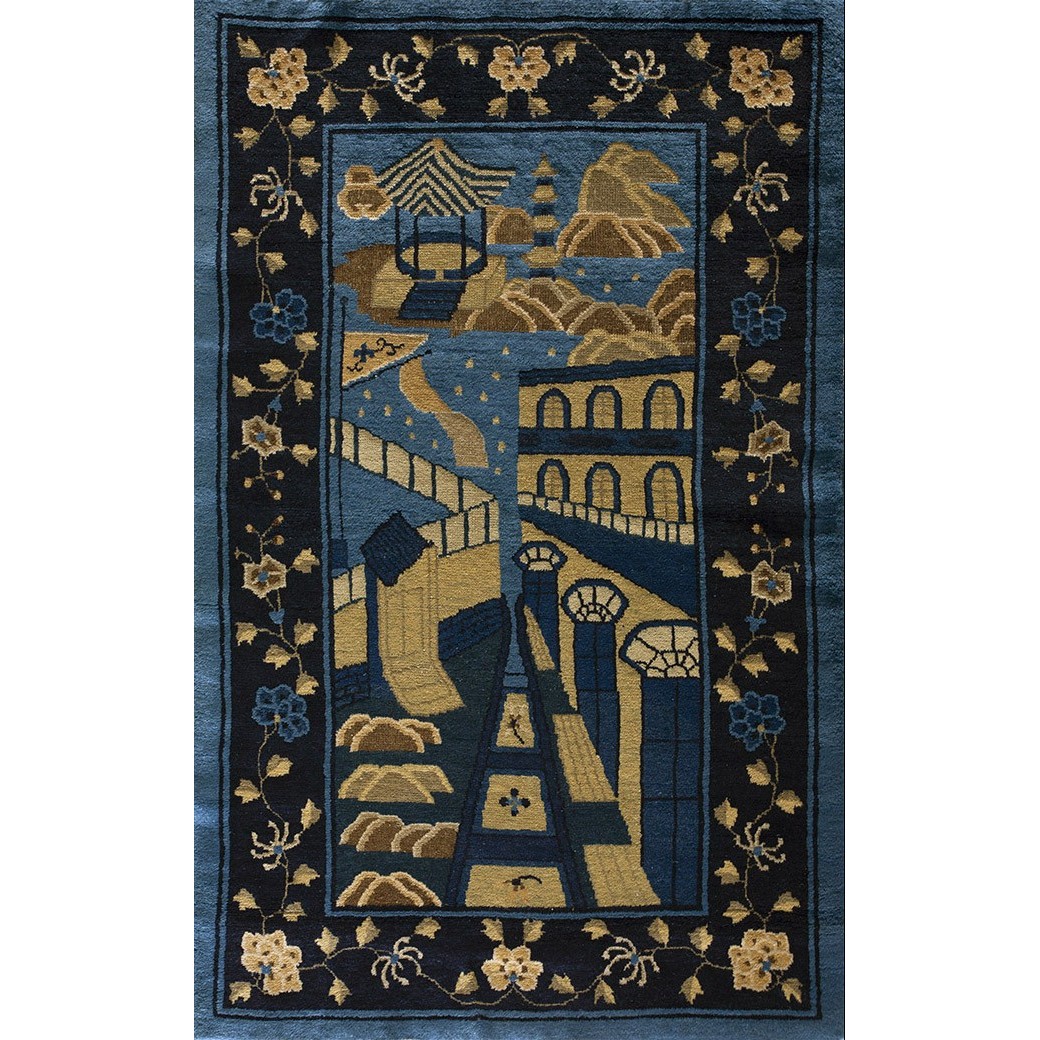 DescriptionChineseCarpets made in China proper. See entries Ningshia, Peking, Art Deco. Chinese - PekingThe commercial Peking carpet is a later 19th century development, begun by importing weaves from Ningshia (see entry) to create and export industry aimed at Western markets. The foundation is cotton and the pile is a good quality carpet wool which takes dyes particularly well. The neat medium weave is in Persian (asymmetric) knots. Designs are strictly Chinese and the whole motif repertoire of Chinese art is employed. Blue and white is the most popular color combination and red is particularly rare. Sizes tend to 9 x 12 and larger, and few small pieces appear. For a short time in the early 1920s Persian designs were woven to capitalize on the death of new Iranian goods. The industry decimated by the Communist Revolution relocated to the Pearl River area. There is a good supply of antique carpets at reasonable prices. | |