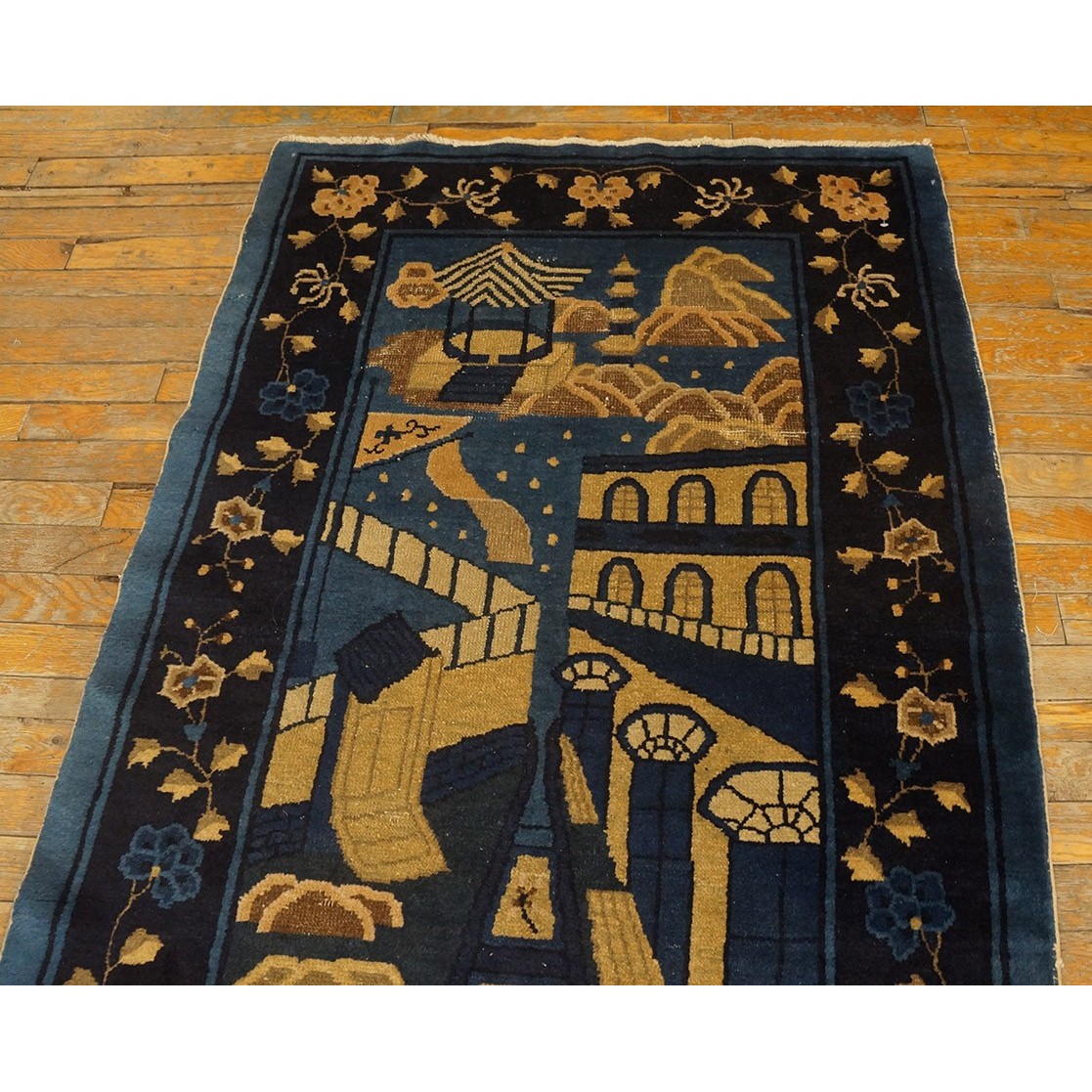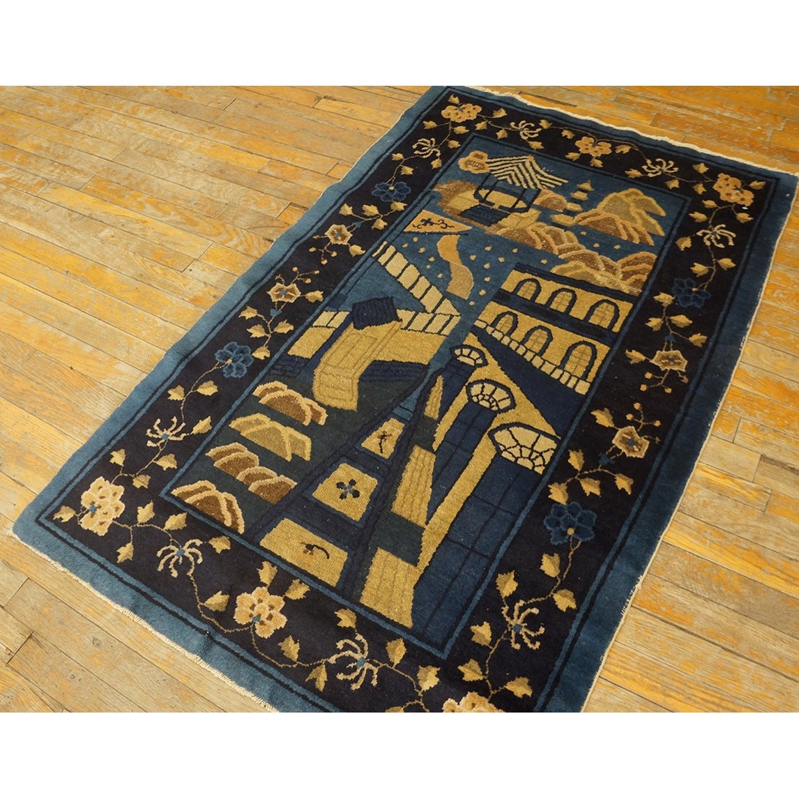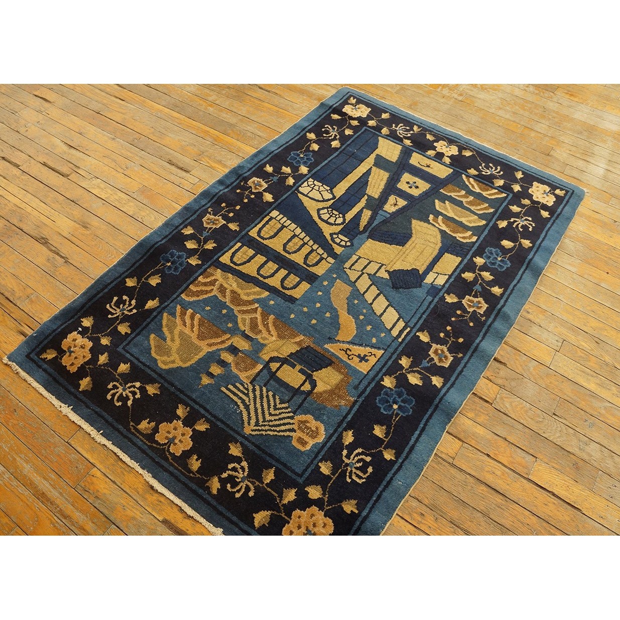 DescriptionChineseCarpets made in China proper. See entries Ningshia, Peking, Art Deco. Chinese - PekingThe commercial Peking carpet is a later 19th century development, begun by importing weaves from Ningshia (see entry) to create and export industry aimed at Western markets. The foundation is cotton and the pile is a good quality carpet wool which takes dyes particularly well. The neat medium weave is in Persian (asymmetric) knots. Designs are strictly Chinese and the whole motif repertoire of Chinese art is employed. Blue and white is the most popular color combination and red is particularly rare. Sizes tend to 9 x 12 and larger, and few small pieces appear. For a short time in the early 1920s Persian designs were woven to capitalize on the death of new Iranian goods. The industry decimated by the Communist Revolution relocated to the Pearl River area. There is a good supply of antique carpets at reasonable prices. | |