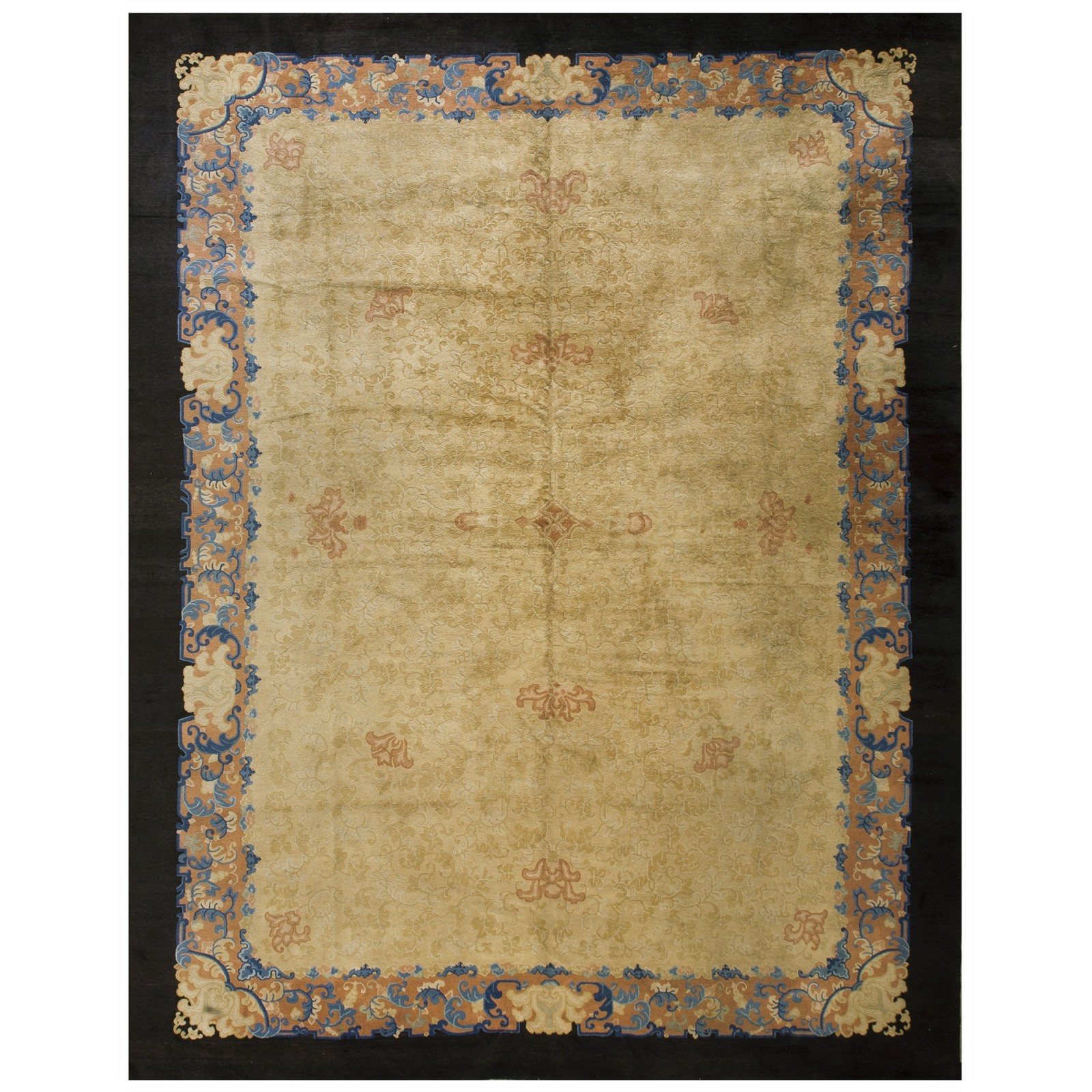 DescriptionChineseCarpets made in China proper. See entries Ningshia, Peking, Art Deco. Chinese - PekingThe commercial Peking carpet is a later 19th century development, begun by importing weaves from Ningshia (see entry) to create and export industry aimed at Western markets. The foundation is cotton and the pile is a good quality carpet wool which takes dyes particularly well. The neat medium weave is in Persian (asymmetric) knots. Designs are strictly Chinese and the whole motif repertoire of Chinese art is employed. Blue and white is the most popular color combination and red is particularly rare. Sizes tend to 9 x 12 and larger, and few small pieces appear. For a short time in the early 1920s Persian designs were woven to capitalize on the death of new Iranian goods. The industry decimated by the Communist Revolution relocated to the Pearl River area. There is a good supply of antique carpets at reasonable prices. | |