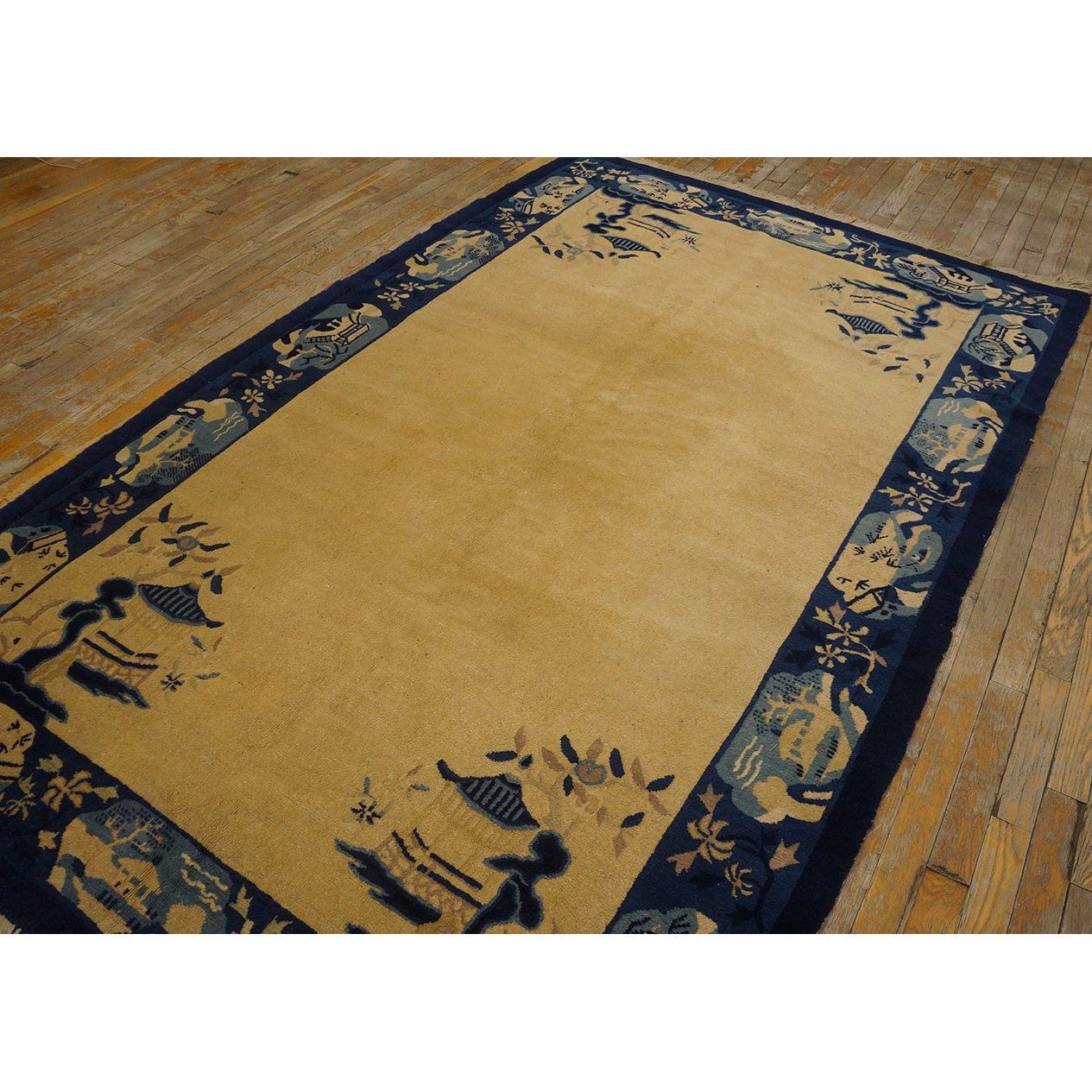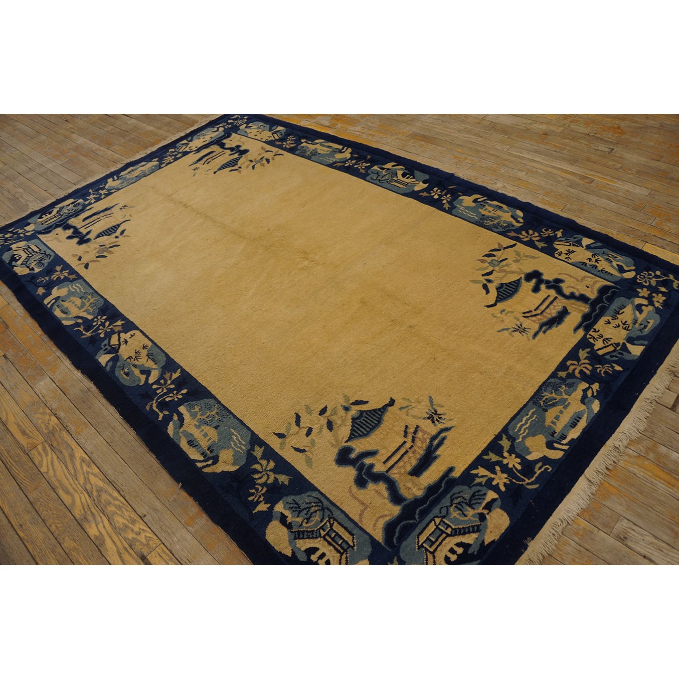 The commercial Peking carpet is a later 19th century development, begun by importing weaves from Ningshia (see entry) to create and export industry aimed at Western markets. The foundation is cotton and the pile is a good quality carpet wool which takes dyes particularly well. The neat medium weave is in Persian (asymmetric) knots. Designs are strictly Chinese and the whole motif repertoire of Chinese art is employed. Blue and white is the most popular color combination and red is particularly rare. Sizes tend to 9’ x 12’ and larger, and few small pieces appear. For a short time in the early 1920’s Persian designs were woven to capitalize on the death of new Iranian goods. The industry decimated by the Communist Revolution relocated to the Pearl River area. There is a good supply of antique carpets at reasonable prices.
