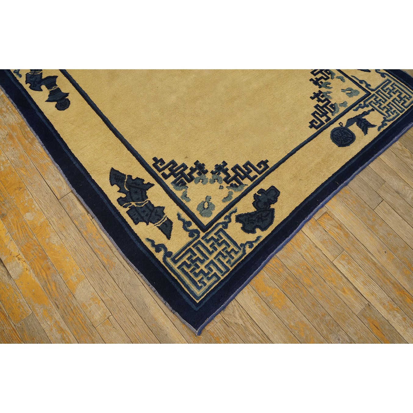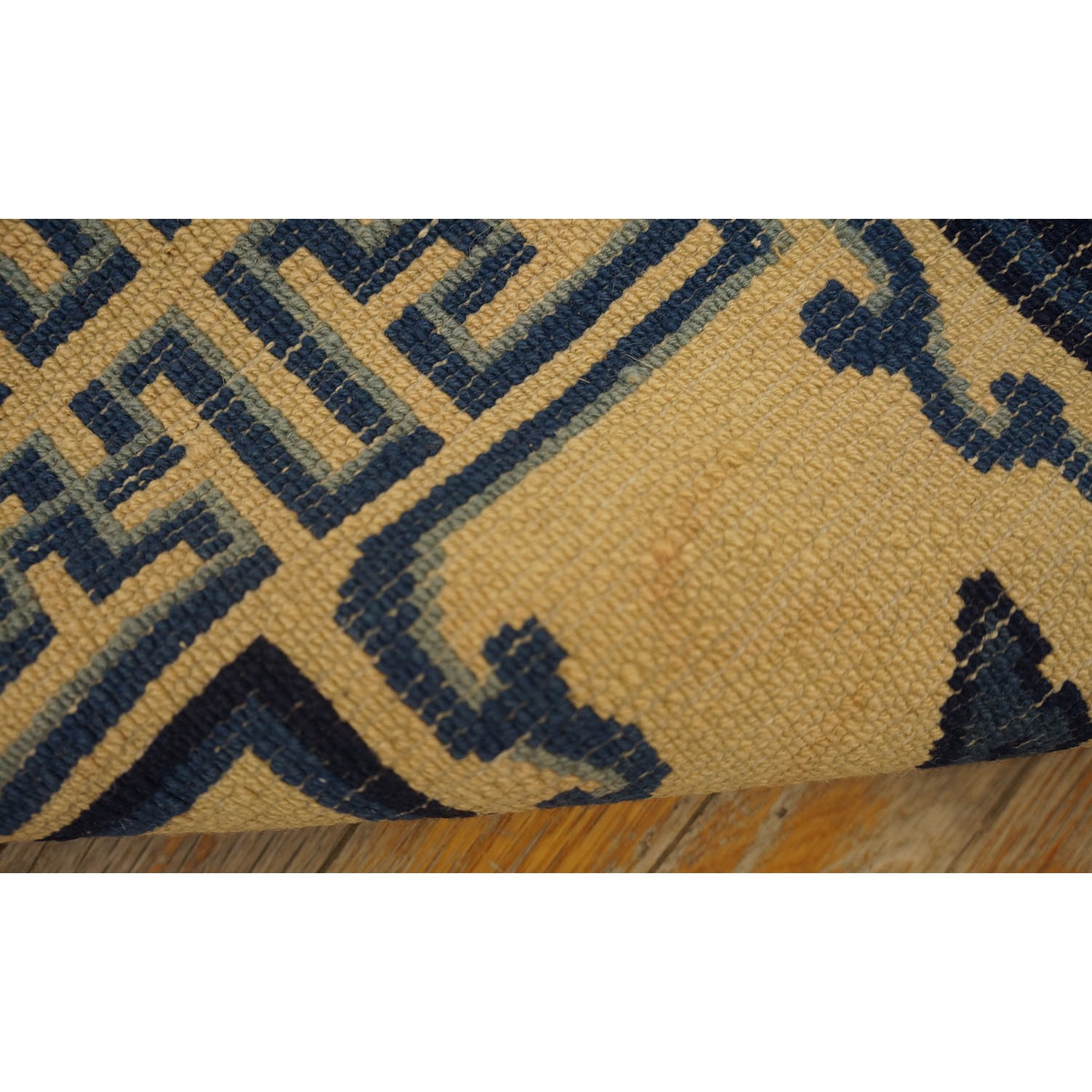 DescriptionChineseCarpets made in China proper. See entries Ningshia, Peking, Art Deco. Chinese - PekingThe commercial Peking carpet is a later 19th century development, begun by importing weaves from Ningshia (see entry) to create and export industry aimed at Western markets. The foundation is cotton and the pile is a good quality carpet wool which takes dyes particularly well. The neat medium weave is in Persian (asymmetric) knots. Designs are strictly Chinese and the whole motif repertoire of Chinese art is employed. Blue and white is the most popular color combination and red is particularly rare. Sizes tend to 9 x 12 and larger, and few small pieces appear. For a short time in the early 1920s Persian designs were woven to capitalize on the death of new Iranian goods. The industry decimated by the Communist Revolution relocated to the Pearl River area. There is a good supply of antique carpets at reasonable prices. | |