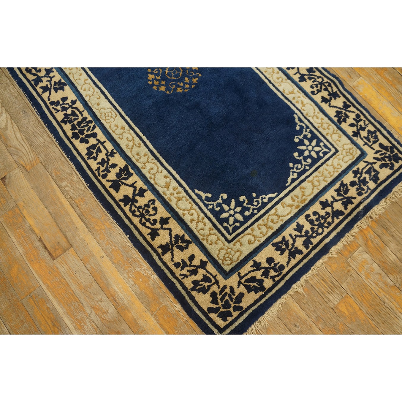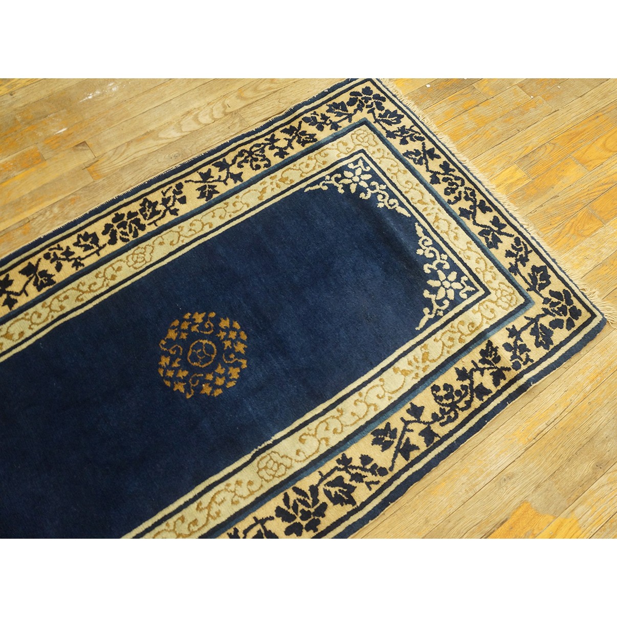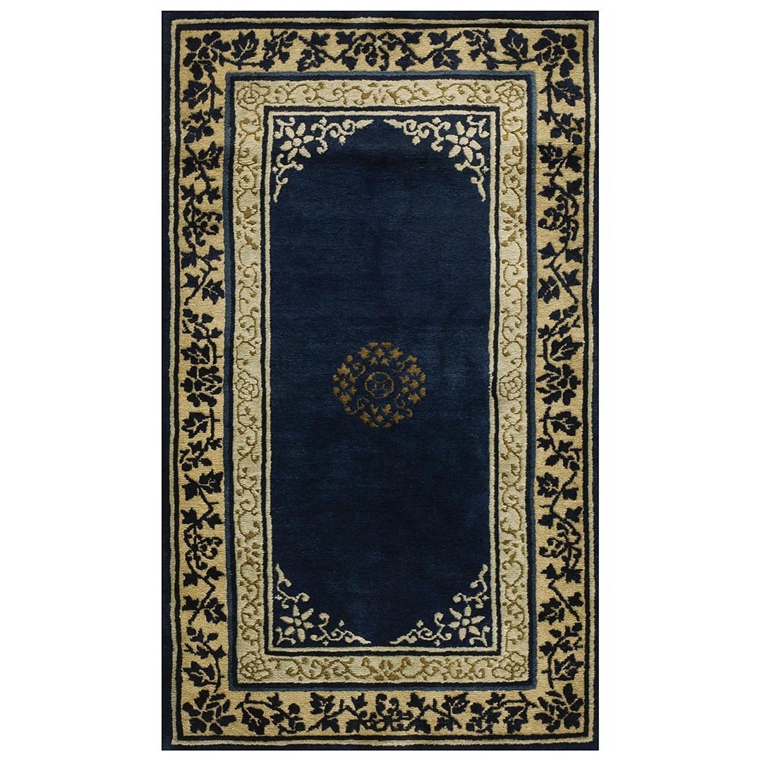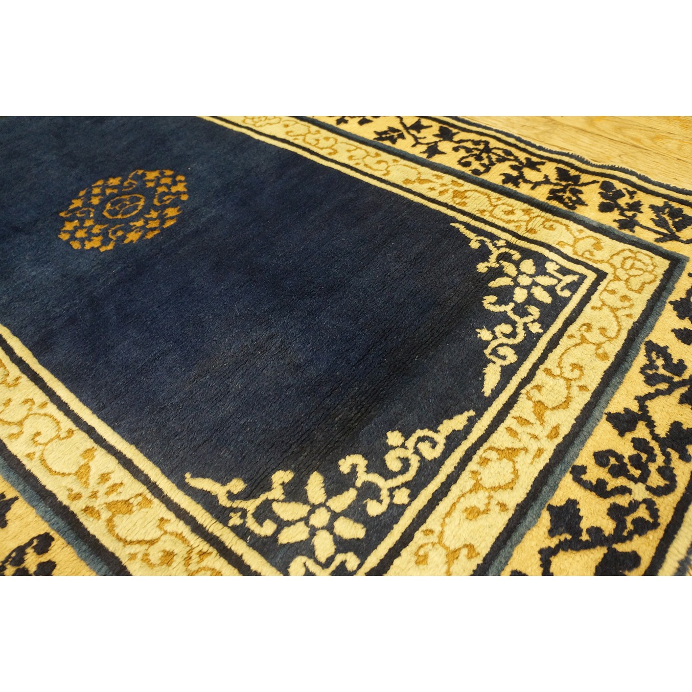 DescriptionChineseCarpets made in China proper. See entries Ningshia, Peking, Art Deco. Chinese - PekingThe commercial Peking carpet is a later 19th century development, begun by importing weaves from Ningshia (see entry) to create and export industry aimed at Western markets. The foundation is cotton and the pile is a good quality carpet wool which takes dyes particularly well. The neat medium weave is in Persian (asymmetric) knots. Designs are strictly Chinese and the whole motif repertoire of Chinese art is employed. Blue and white is the most popular color combination and red is particularly rare. Sizes tend to 9 x 12 and larger, and few small pieces appear. For a short time in the early 1920s Persian designs were woven to capitalize on the death of new Iranian goods. The industry decimated by the Communist Revolution relocated to the Pearl River area. There is a good supply of antique carpets at reasonable prices. | |