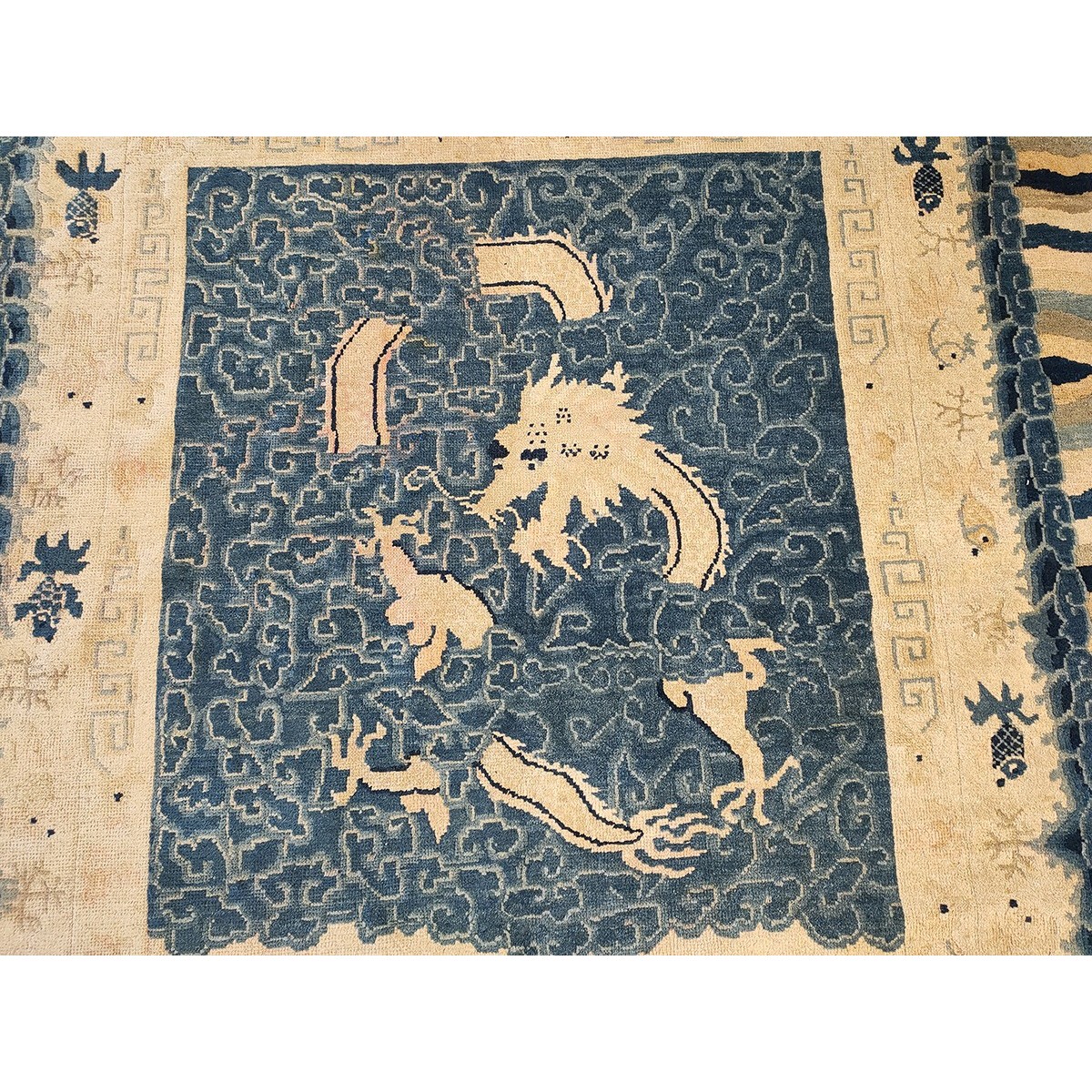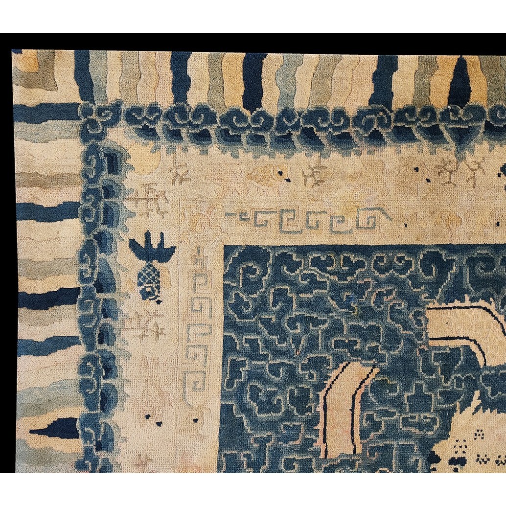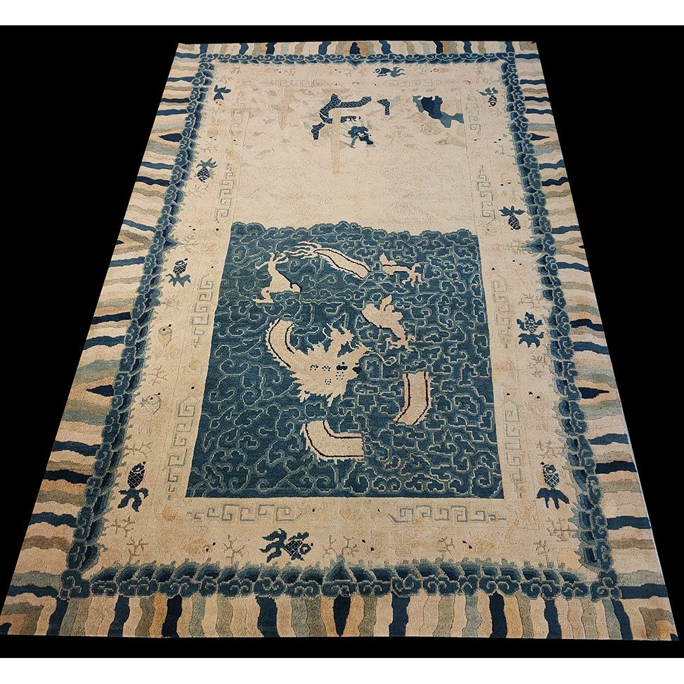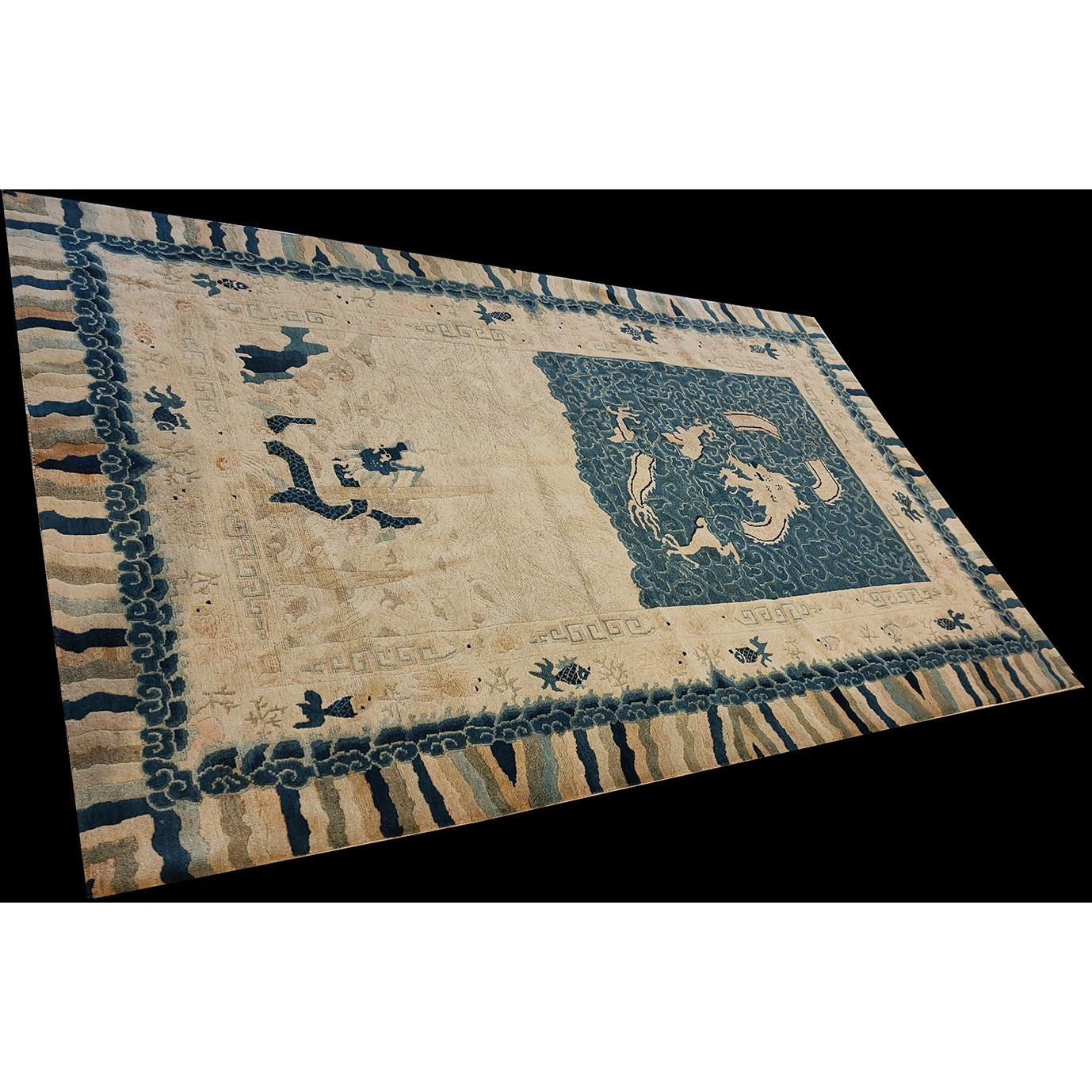 DescriptionChineseCarpets made in China proper. See entries Ningshia, Peking, Art Deco. Chinese - PekingThe commercial Peking carpet is a later 19th century development, begun by importing weaves from Ningshia (see entry) to create and export industry aimed at Western markets. The foundation is cotton and the pile is a good quality carpet wool which takes dyes particularly well. The neat medium weave is in Persian (asymmetric) knots. Designs are strictly Chinese and the whole motif repertoire of Chinese art is employed. Blue and white is the most popular color combination and red is particularly rare. Sizes tend to 9 x 12 and larger, and few small pieces appear. For a short time in the early 1920s Persian designs were woven to capitalize on the death of new Iranian goods. The industry decimated by the Communist Revolution relocated to the Pearl River area. There is a good supply of antique carpets at reasonable prices. | |