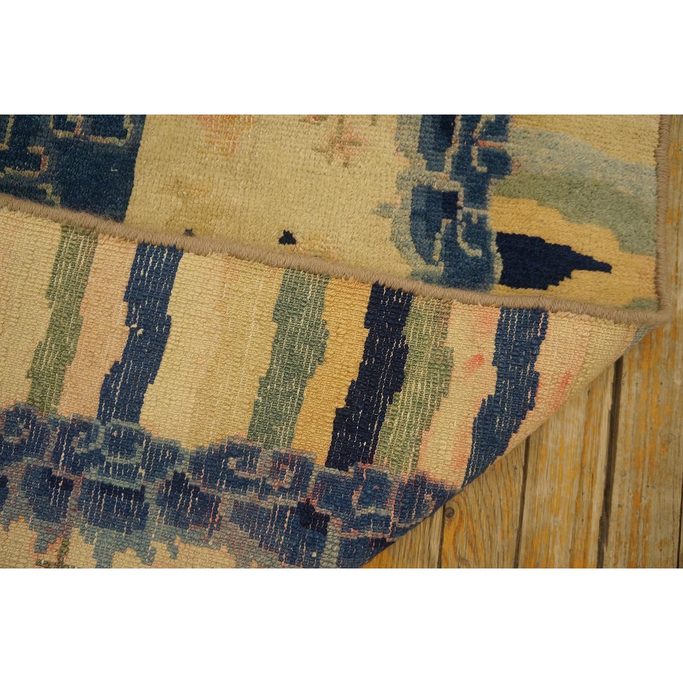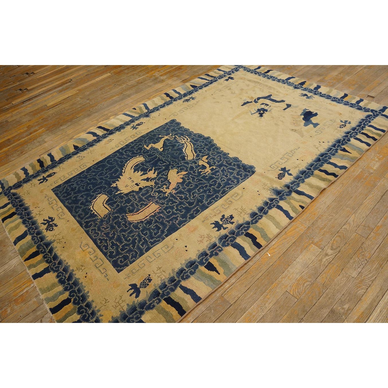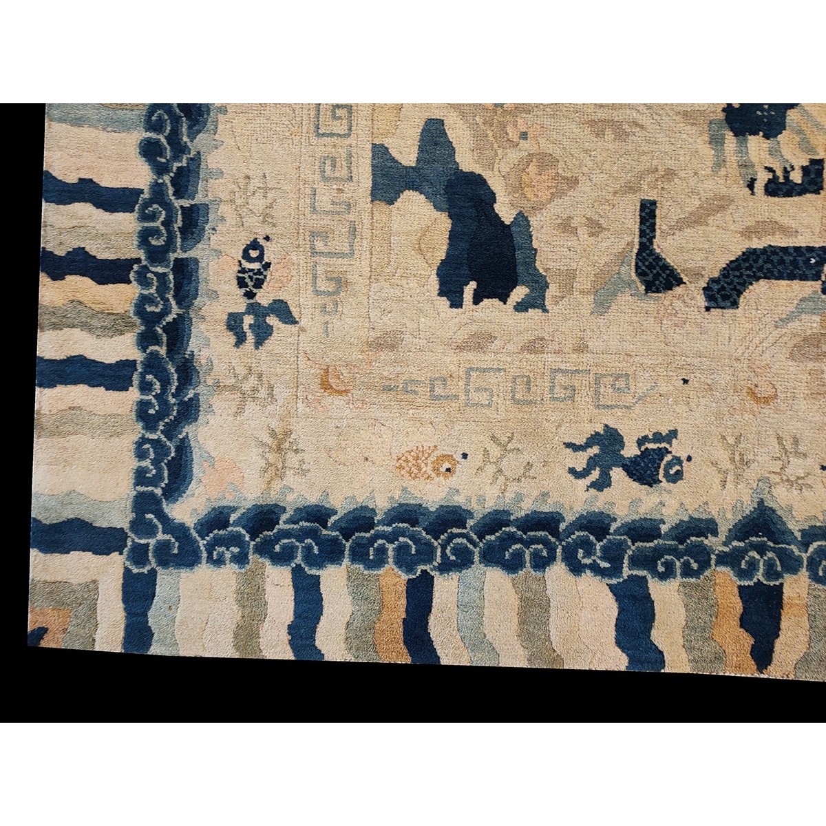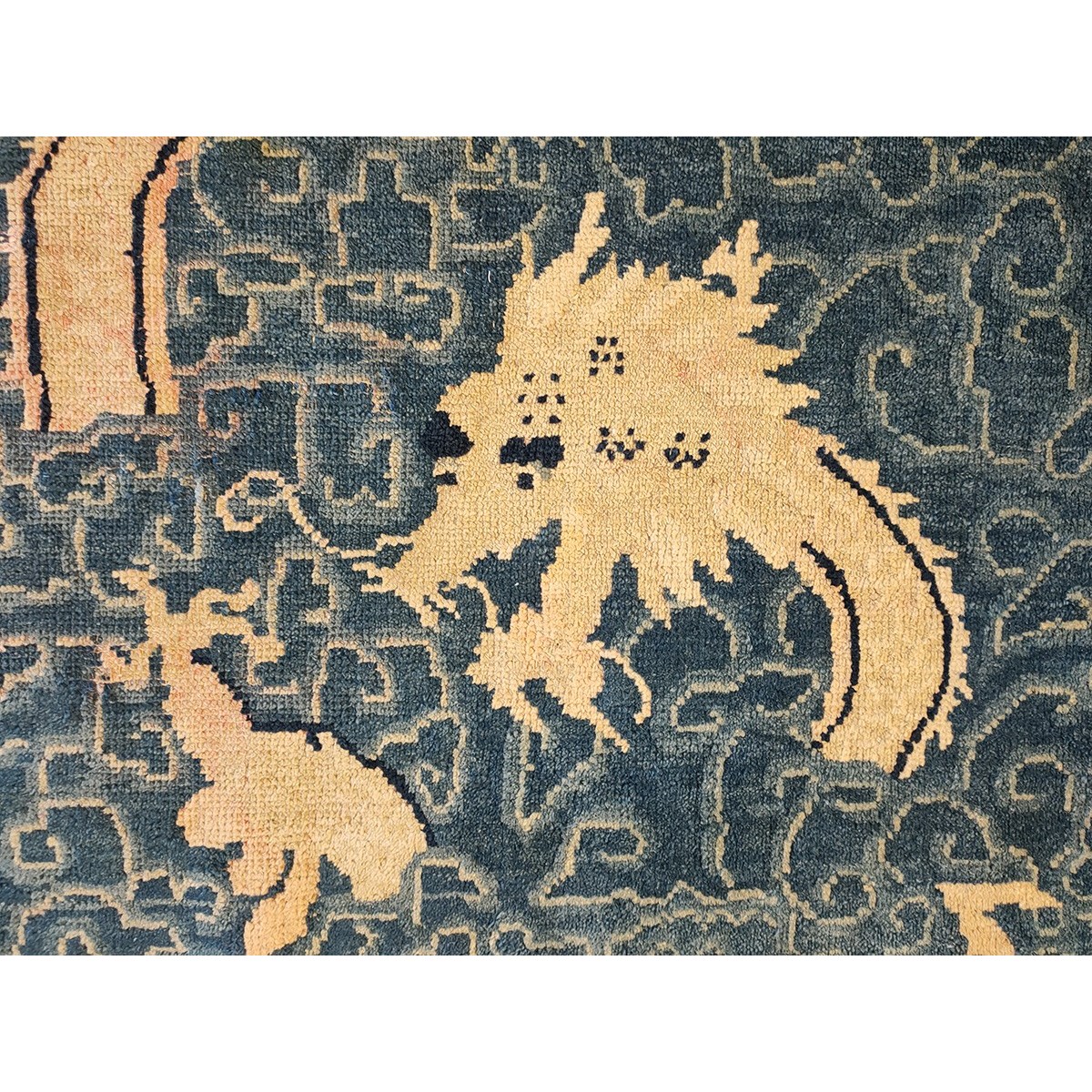 DescriptionChineseCarpets made in China proper. See entries Ningshia, Peking, Art Deco. Chinese - PekingThe commercial Peking carpet is a later 19th century development, begun by importing weaves from Ningshia (see entry) to create and export industry aimed at Western markets. The foundation is cotton and the pile is a good quality carpet wool which takes dyes particularly well. The neat medium weave is in Persian (asymmetric) knots. Designs are strictly Chinese and the whole motif repertoire of Chinese art is employed. Blue and white is the most popular color combination and red is particularly rare. Sizes tend to 9 x 12 and larger, and few small pieces appear. For a short time in the early 1920s Persian designs were woven to capitalize on the death of new Iranian goods. The industry decimated by the Communist Revolution relocated to the Pearl River area. There is a good supply of antique carpets at reasonable prices. | |