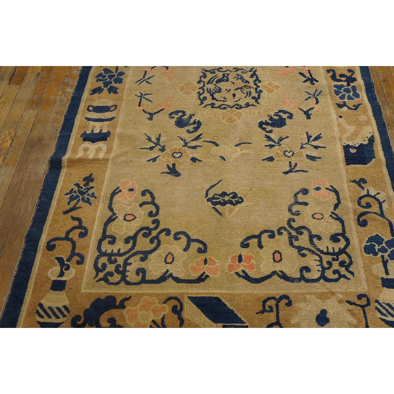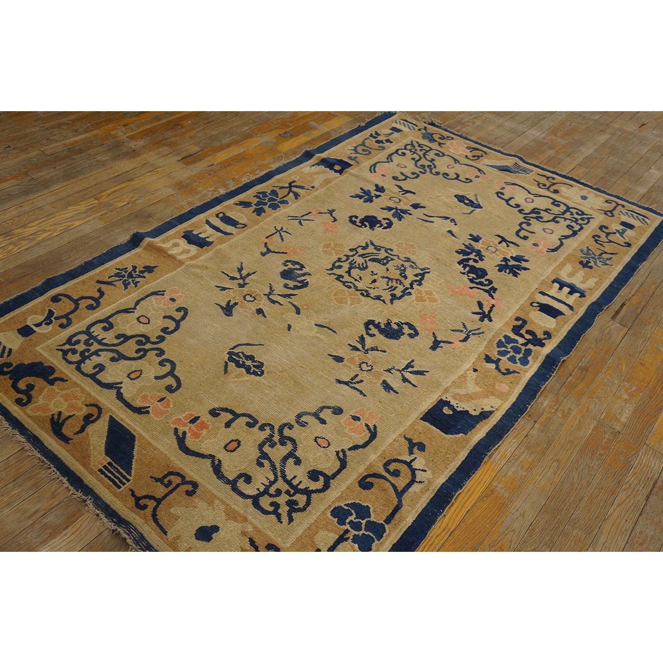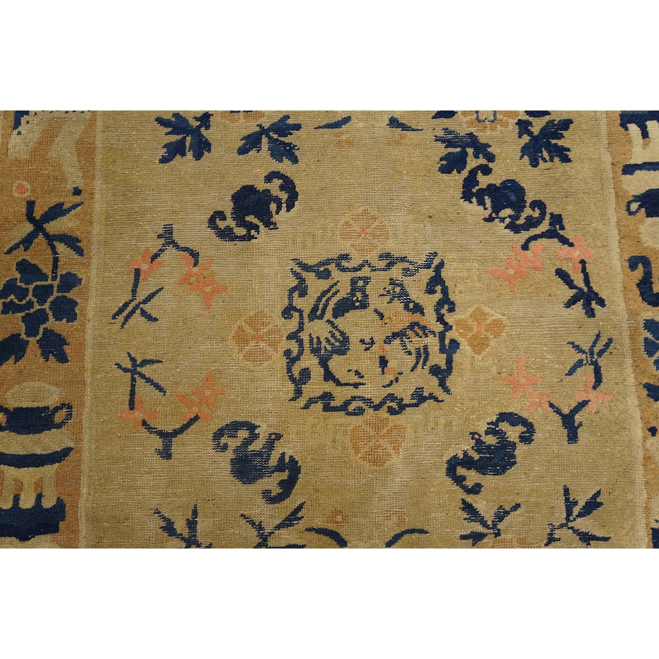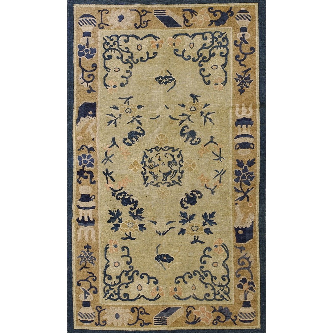 DescriptionChineseCarpets made in China proper. See entries Ningshia, Peking, Art Deco. Chinese - PekingThe commercial Peking carpet is a later 19th century development, begun by importing weaves from Ningshia (see entry) to create and export industry aimed at Western markets. The foundation is cotton and the pile is a good quality carpet wool which takes dyes particularly well. The neat medium weave is in Persian (asymmetric) knots. Designs are strictly Chinese and the whole motif repertoire of Chinese art is employed. Blue and white is the most popular color combination and red is particularly rare. Sizes tend to 9 x 12 and larger, and few small pieces appear. For a short time in the early 1920s Persian designs were woven to capitalize on the death of new Iranian goods. The industry decimated by the Communist Revolution relocated to the Pearl River area. There is a good supply of antique carpets at reasonable prices. | |