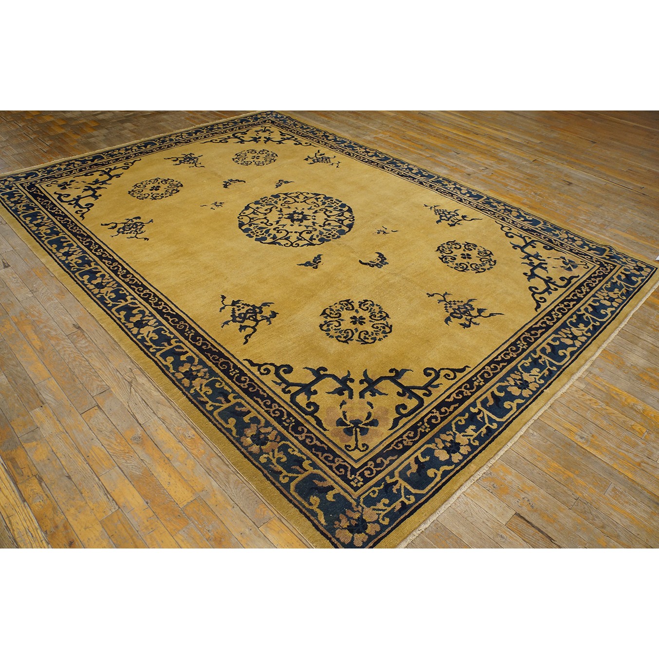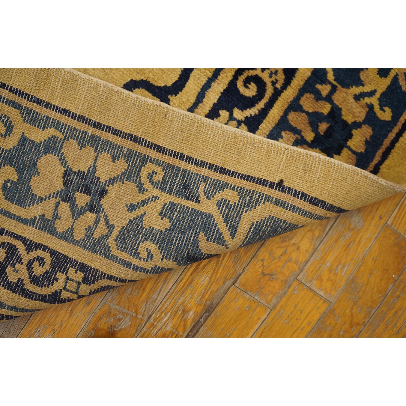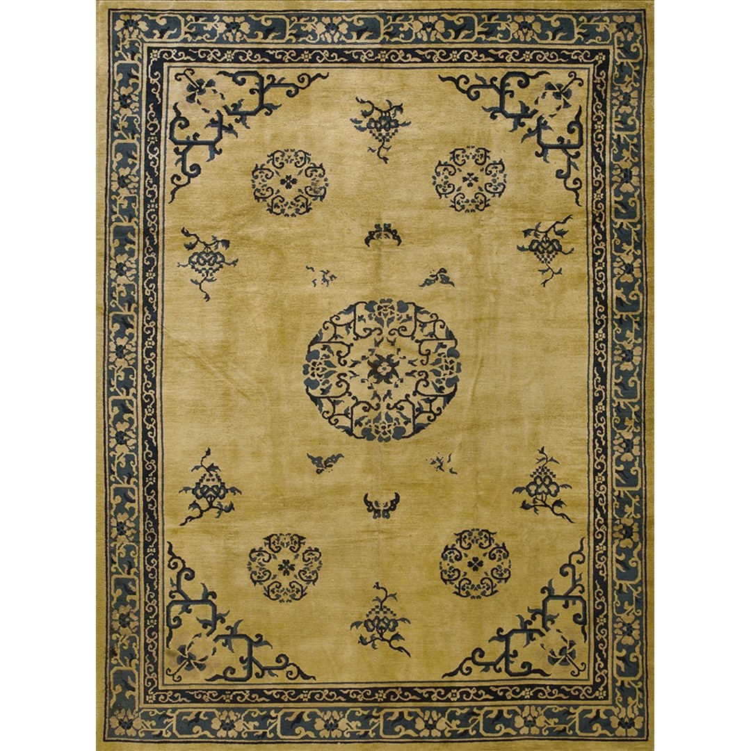 DescriptionChineseCarpets made in China proper. See entries Ningshia, Peking, Art Deco. Chinese - PekingThe commercial Peking carpet is a later 19th century development, begun by importing weaves from Ningshia (see entry) to create and export industry aimed at Western markets. The foundation is cotton and the pile is a good quality carpet wool which takes dyes particularly well. The neat medium weave is in Persian (asymmetric) knots. Designs are strictly Chinese and the whole motif repertoire of Chinese art is employed. Blue and white is the most popular color combination and red is particularly rare. Sizes tend to 9 x 12 and larger, and few small pieces appear. For a short time in the early 1920s Persian designs were woven to capitalize on the death of new Iranian goods. The industry decimated by the Communist Revolution relocated to the Pearl River area. There is a good supply of antique carpets at reasonable prices. | |