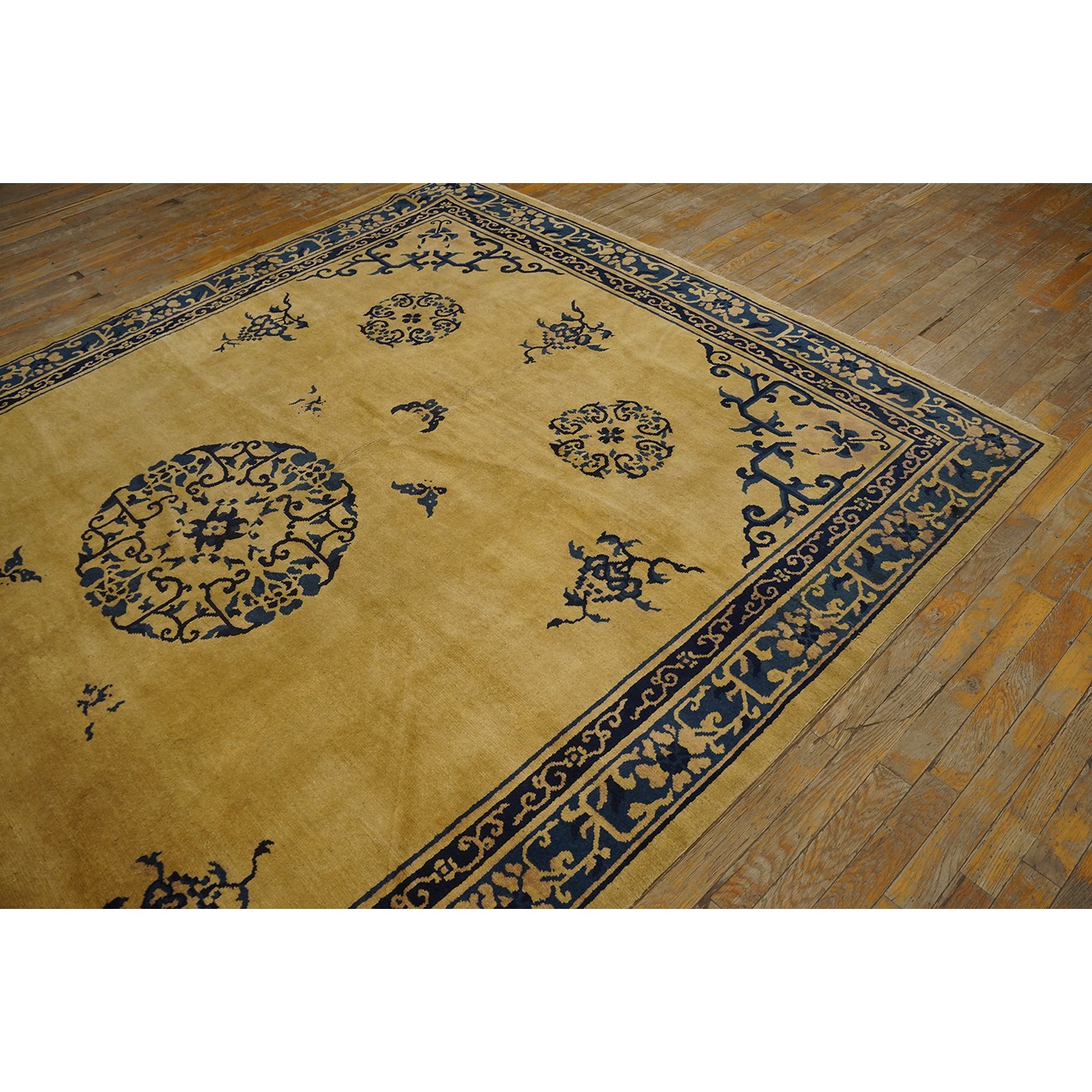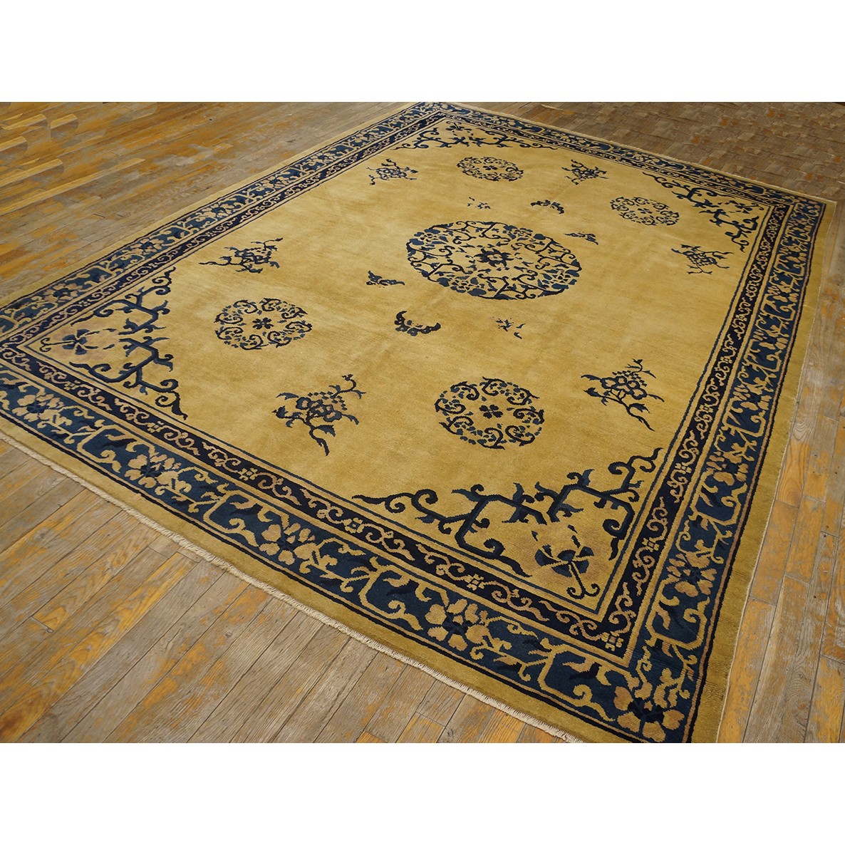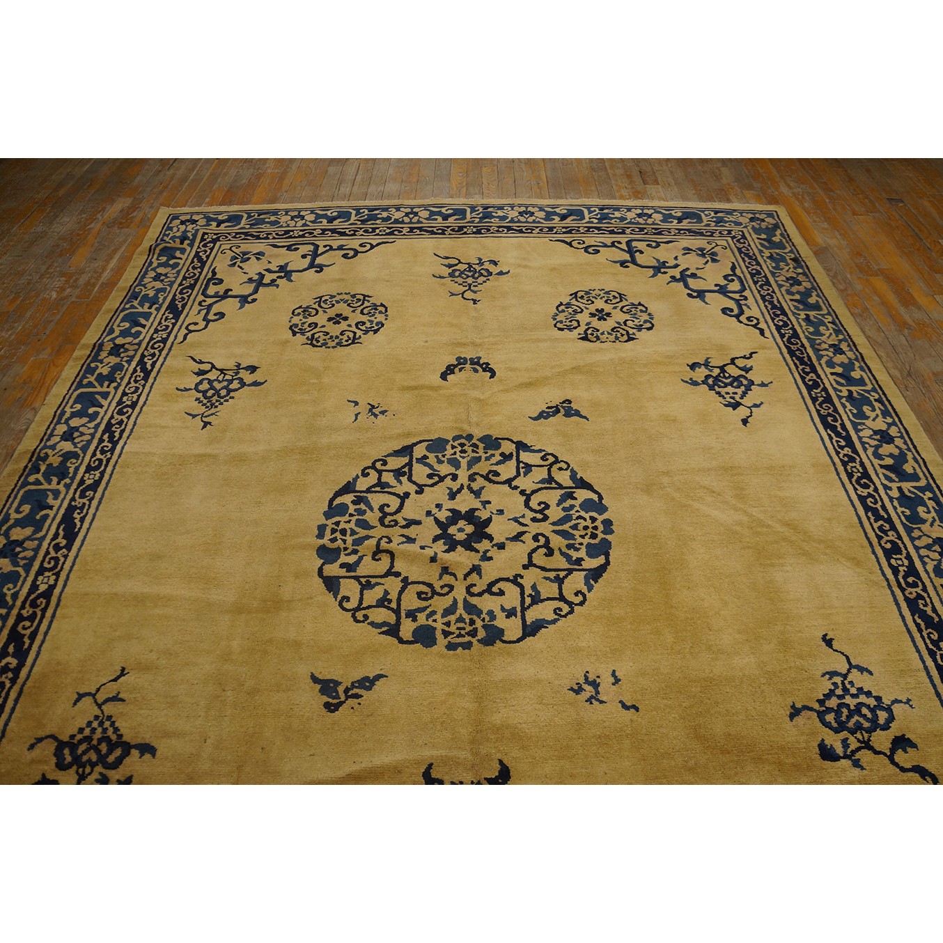 DescriptionChineseCarpets made in China proper. See entries Ningshia, Peking, Art Deco. Chinese - PekingThe commercial Peking carpet is a later 19th century development, begun by importing weaves from Ningshia (see entry) to create and export industry aimed at Western markets. The foundation is cotton and the pile is a good quality carpet wool which takes dyes particularly well. The neat medium weave is in Persian (asymmetric) knots. Designs are strictly Chinese and the whole motif repertoire of Chinese art is employed. Blue and white is the most popular color combination and red is particularly rare. Sizes tend to 9 x 12 and larger, and few small pieces appear. For a short time in the early 1920s Persian designs were woven to capitalize on the death of new Iranian goods. The industry decimated by the Communist Revolution relocated to the Pearl River area. There is a good supply of antique carpets at reasonable prices. | |