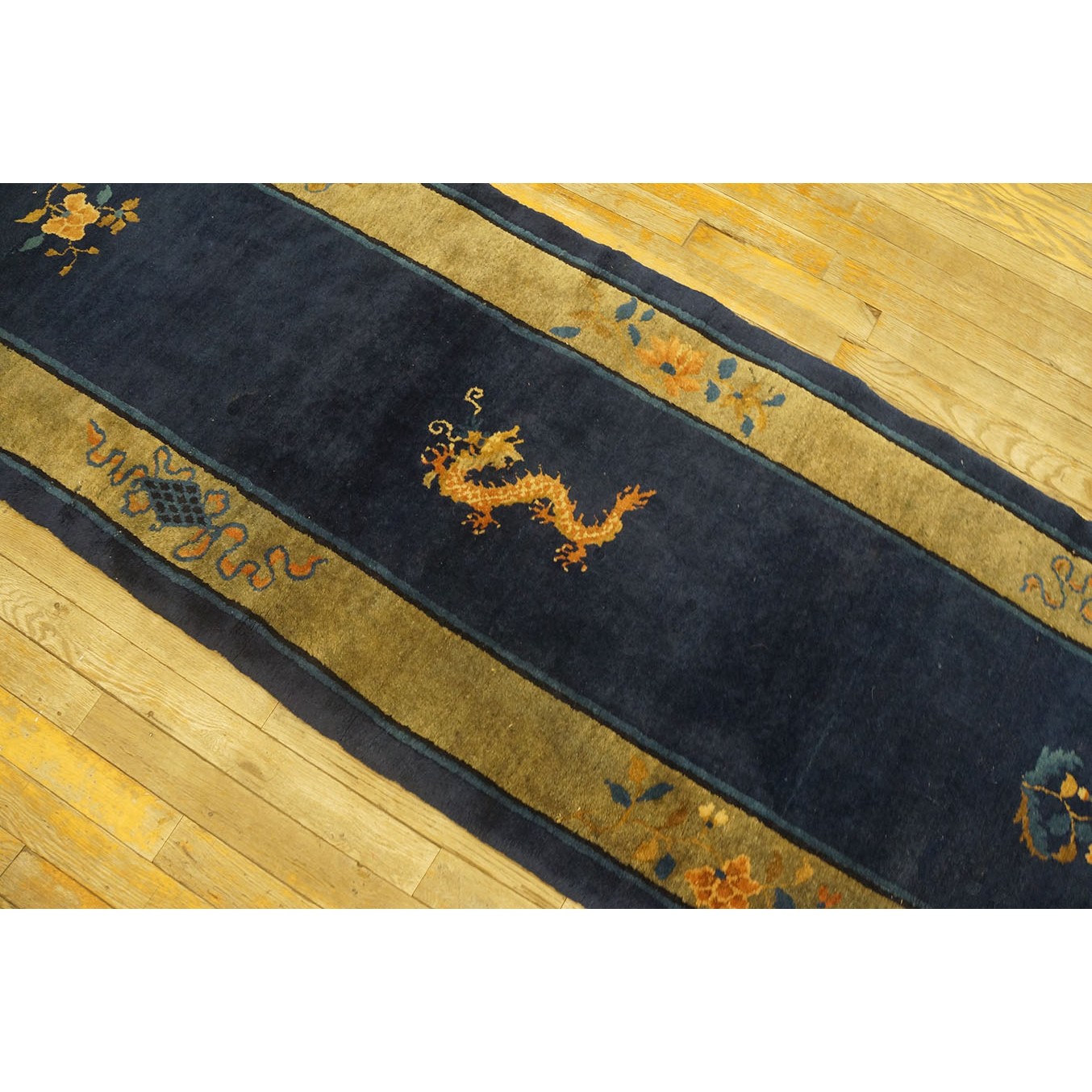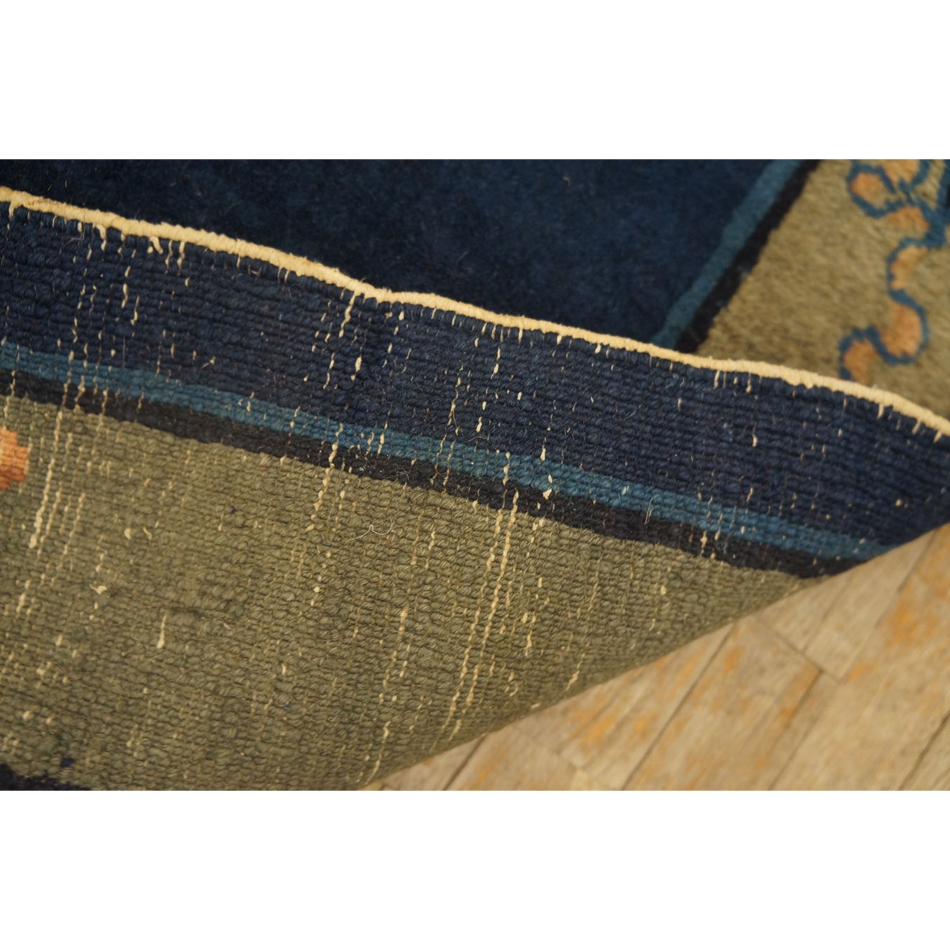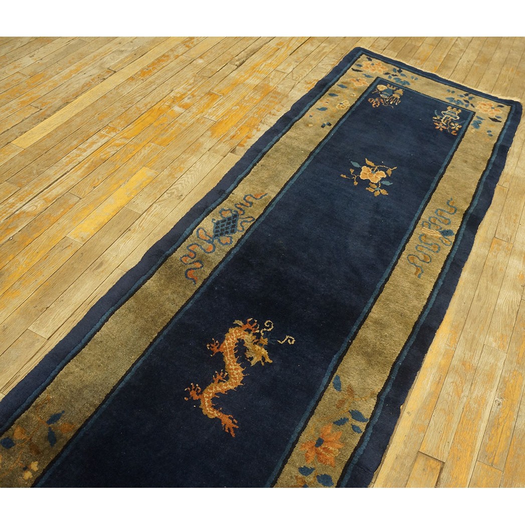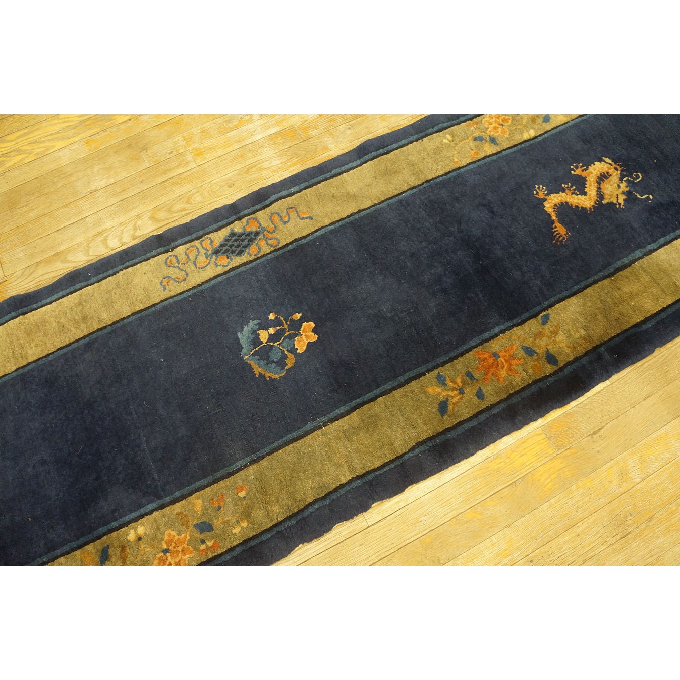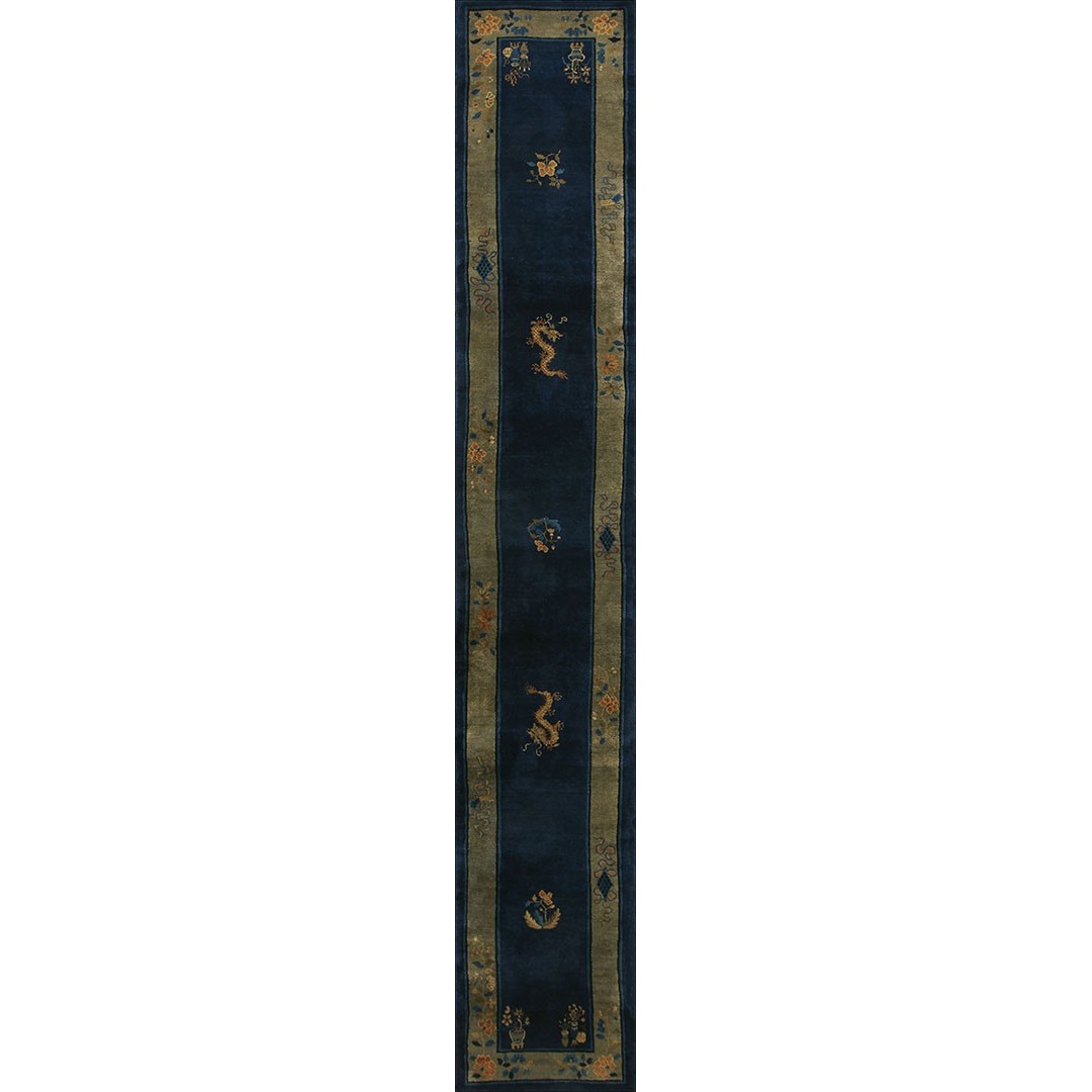 DescriptionChineseCarpets made in China proper. See entries Ningshia, Peking, Art Deco. Chinese - PekingThe commercial Peking carpet is a later 19th century development, begun by importing weaves from Ningshia (see entry) to create and export industry aimed at Western markets. The foundation is cotton and the pile is a good quality carpet wool which takes dyes particularly well. The neat medium weave is in Persian (asymmetric) knots. Designs are strictly Chinese and the whole motif repertoire of Chinese art is employed. Blue and white is the most popular color combination and red is particularly rare. Sizes tend to 9 x 12 and larger, and few small pieces appear. For a short time in the early 1920s Persian designs were woven to capitalize on the death of new Iranian goods. The industry decimated by the Communist Revolution relocated to the Pearl River area. There is a good supply of antique carpets at reasonable prices. | |
